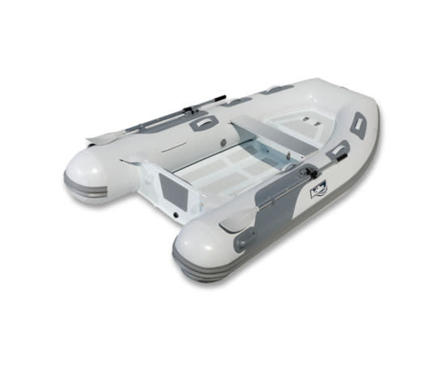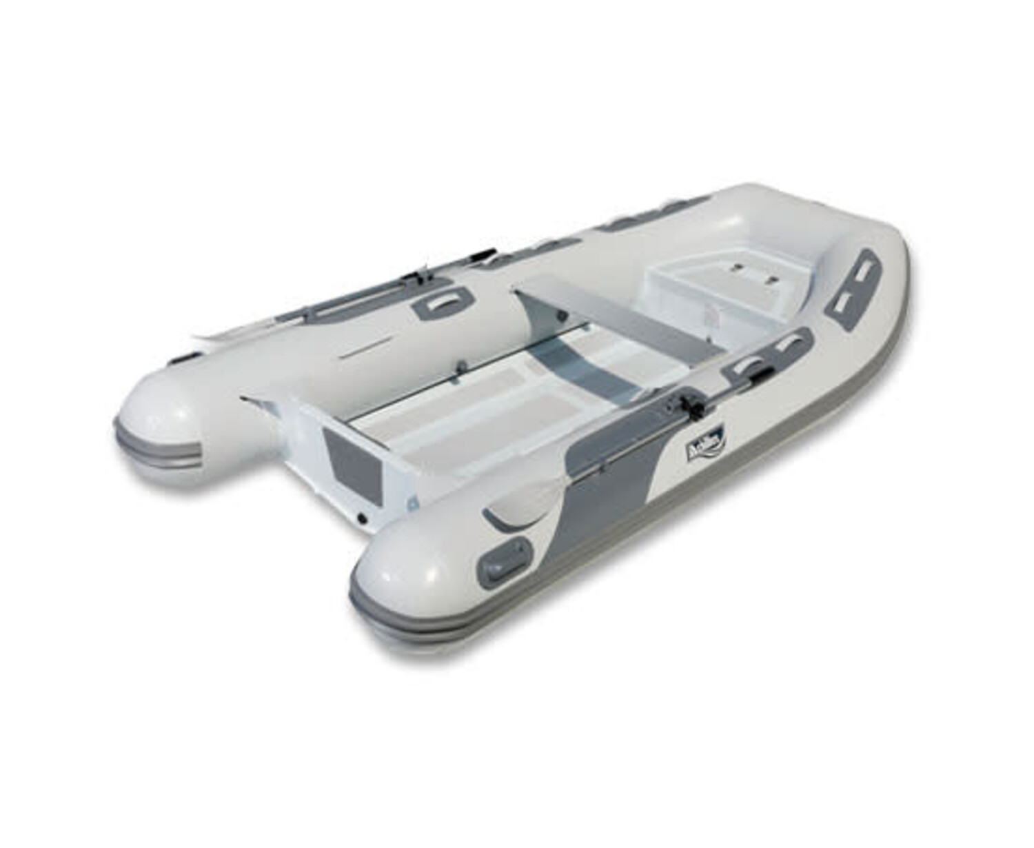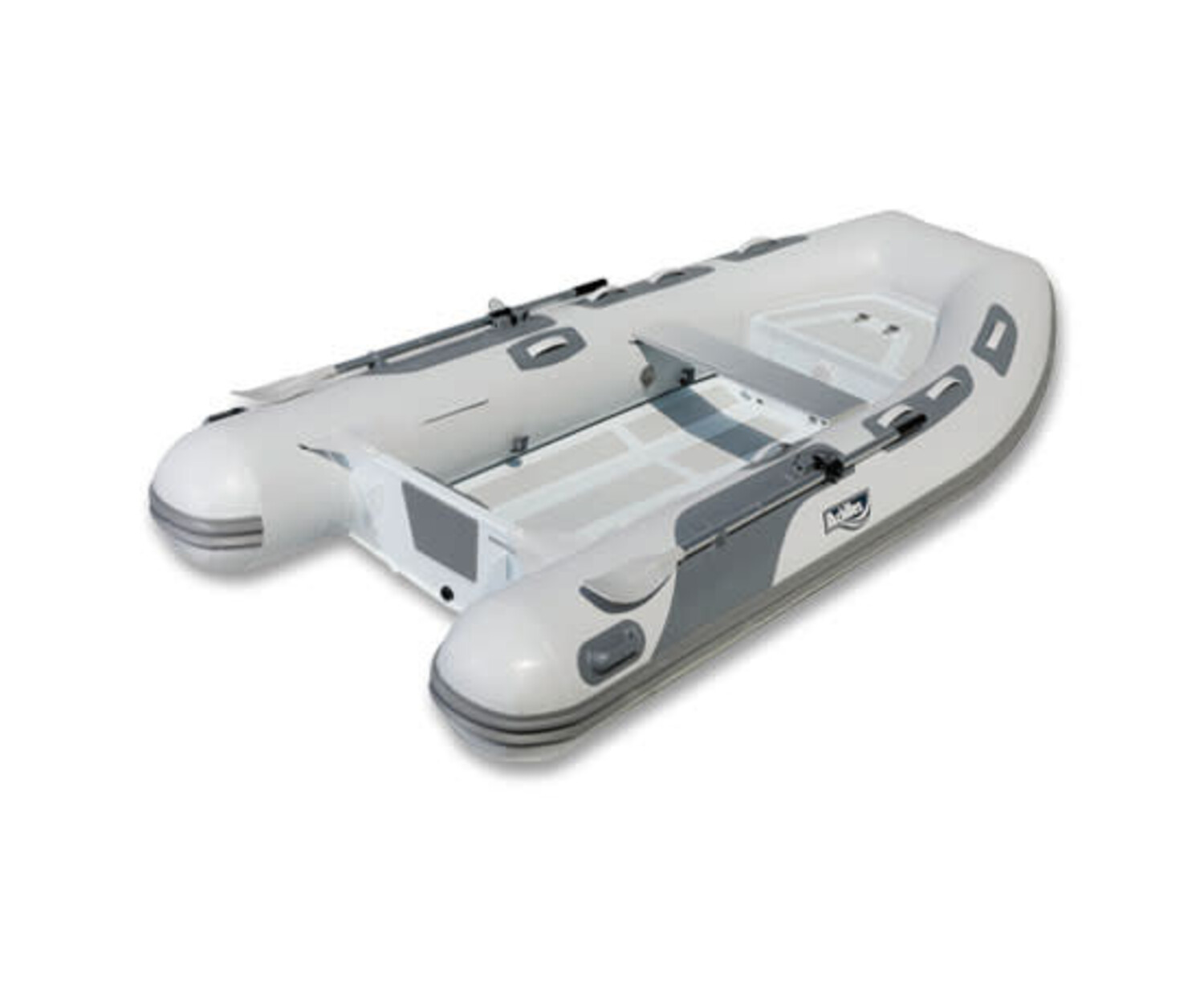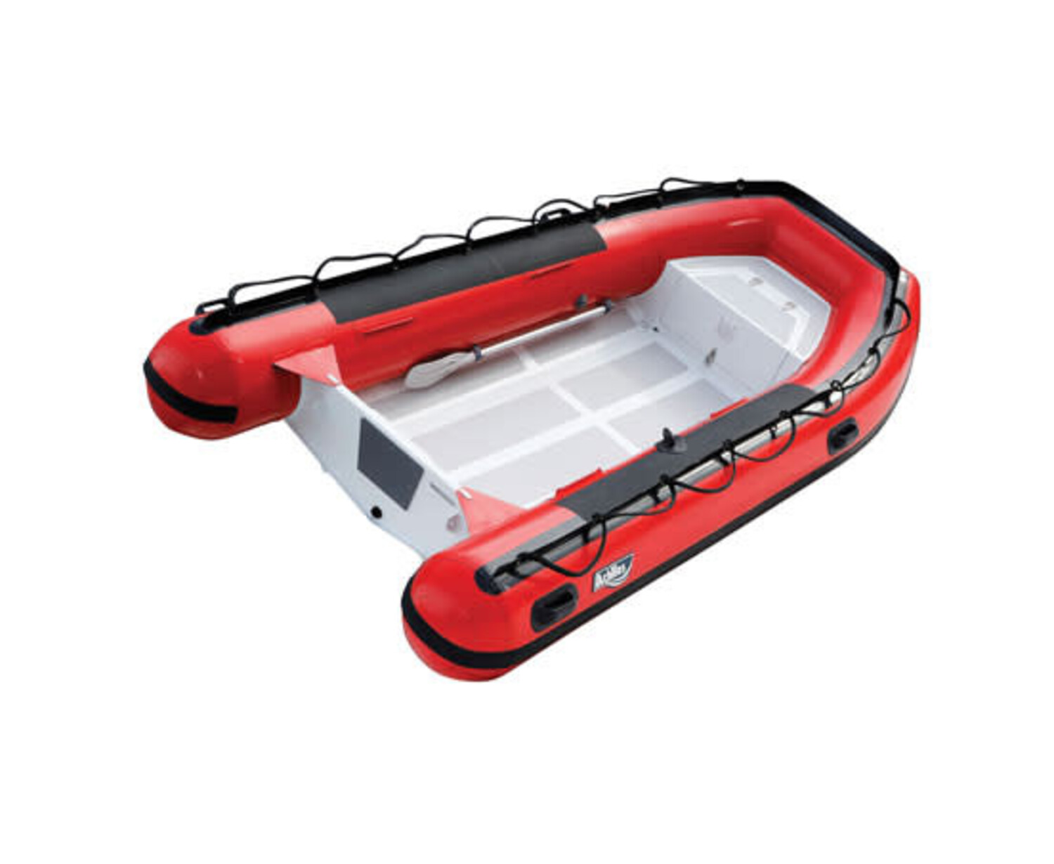The Achilles HB-AX aluminum hull series expands again in 2019 with the addition of the HB-335AX PRO. This new model is only available in red for increased visibility and is designed for heavy duty commercial and rescue use. It has a full length splashguard with lifelines, abrasion/wear patches on top of the tubes, and has a paddle in place of oars and oarlocks. Like all Achilles HB-AX models it features a tough, powder coated marine grade aluminum hull with a full length keel guard to stand up to frequent beachings, coral, rocks, and other rough surfaces. The double heavy-duty rubbing strake on all HB-AX models offers addition protection to the tubes from rocks, docks, and pilings. All HB-AX models also come with a vented bow locker large enough to accommodate a gas tank, and the ability to run a fuel line under the deck that enables you to free up deck space that is usually taken up by the fuel tank and fuel line. It also helps distribute weight more evenly by moving the gas tank forward. The flat deck with non-skid patches also offers better traction, safety, and comfort. This unique design also allows water to flow under the deck to keep your feet dry if any water gets into the boat.