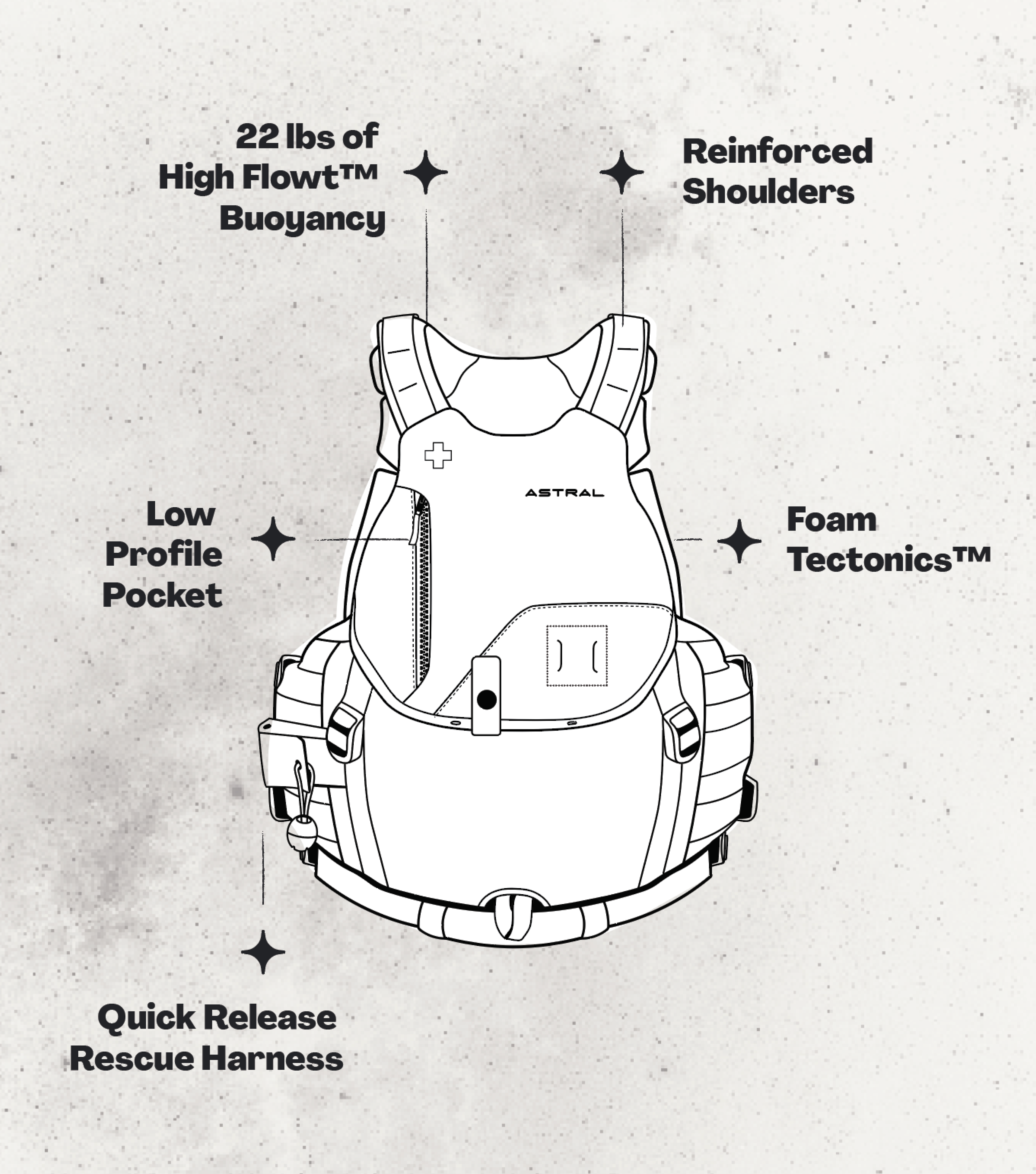 Whitewater athletes continue to progress the sport on larger volumes and higher flows. With 22 lbs of flotation sculpted into Astral's industry leading FoamTectonics™️ architecture, the Indus™️ is the world's first freestyle-inspired high float life jacket. That’s a 33% increase in flotation over the legendary GreenJacket™️ for those drawn to big water.