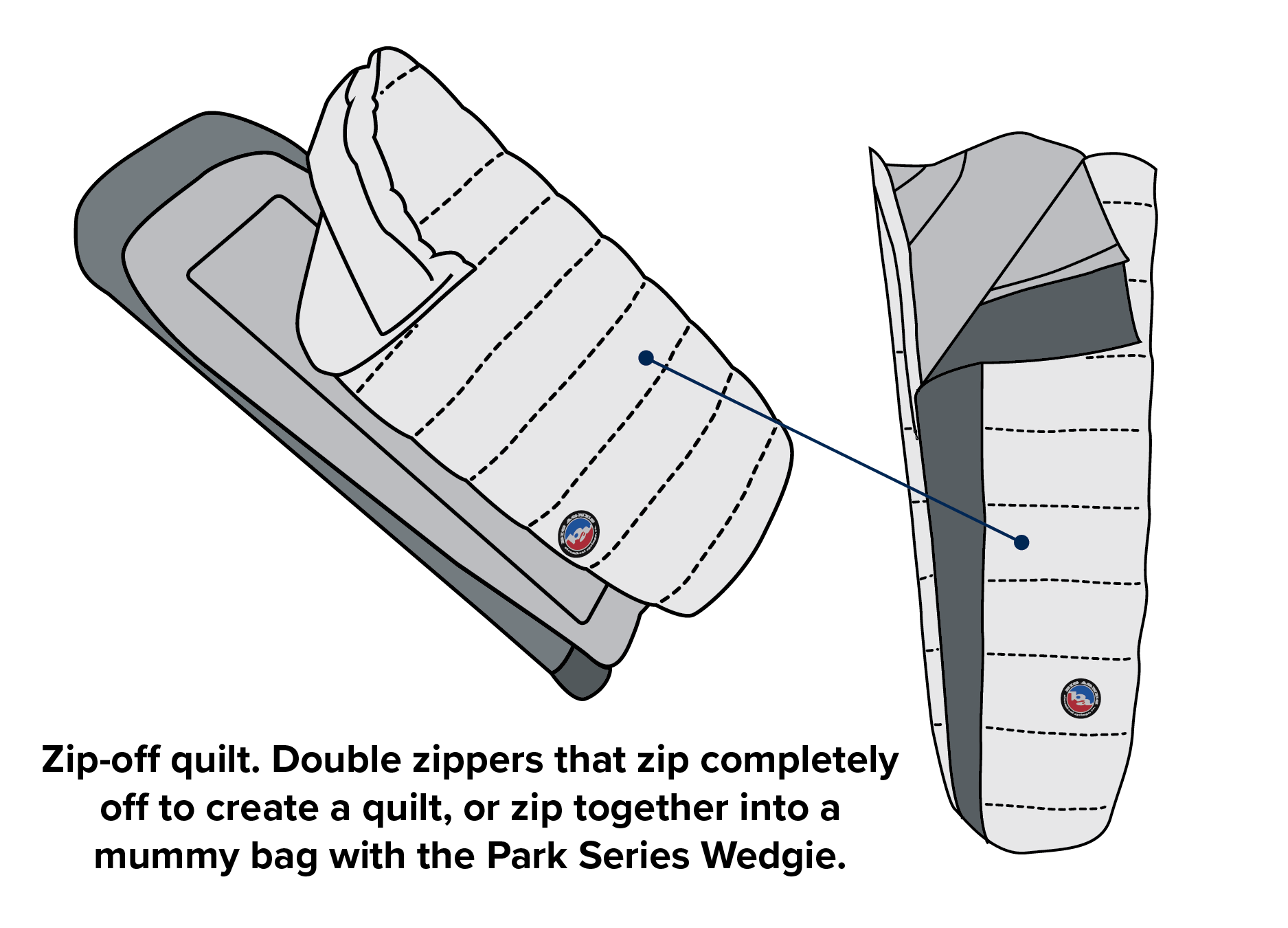 Unique quilt-like construction turns your bag into a backcountry bed plus zip-off option to create a quilt or mummy bag with the Park Series Wedgie – Wedgie sold separately