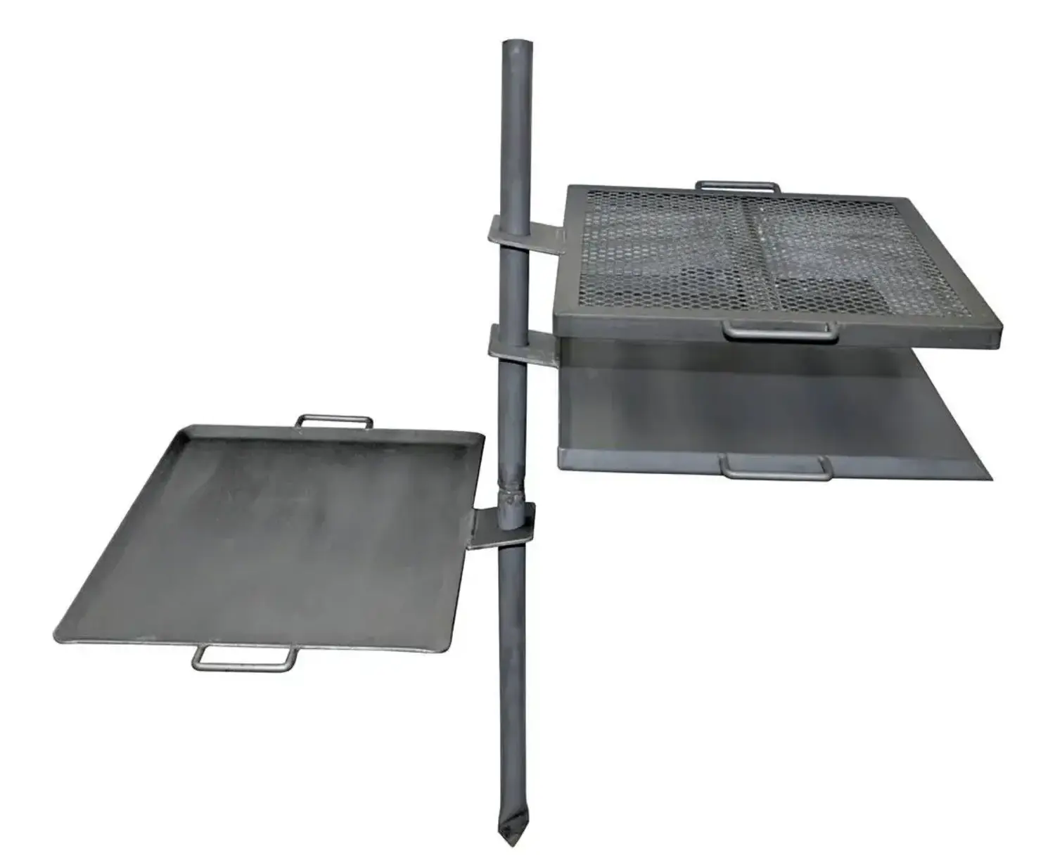 All you need to do is hammer the stake into the ground, place the griddle, grill, and charcoal box onto the stake, and you're ready to cook. Swivel the griddle and grill away from the heat when your food is finished cooking. You can use it over wood, charcoal, or propane.