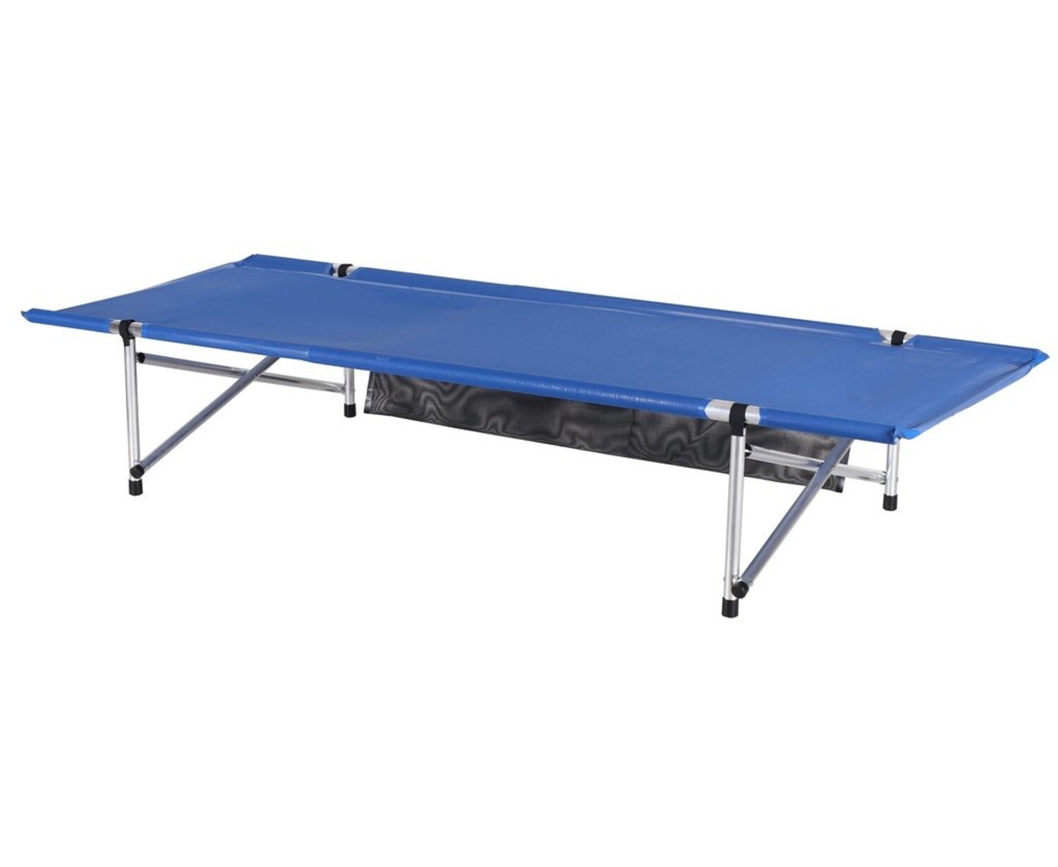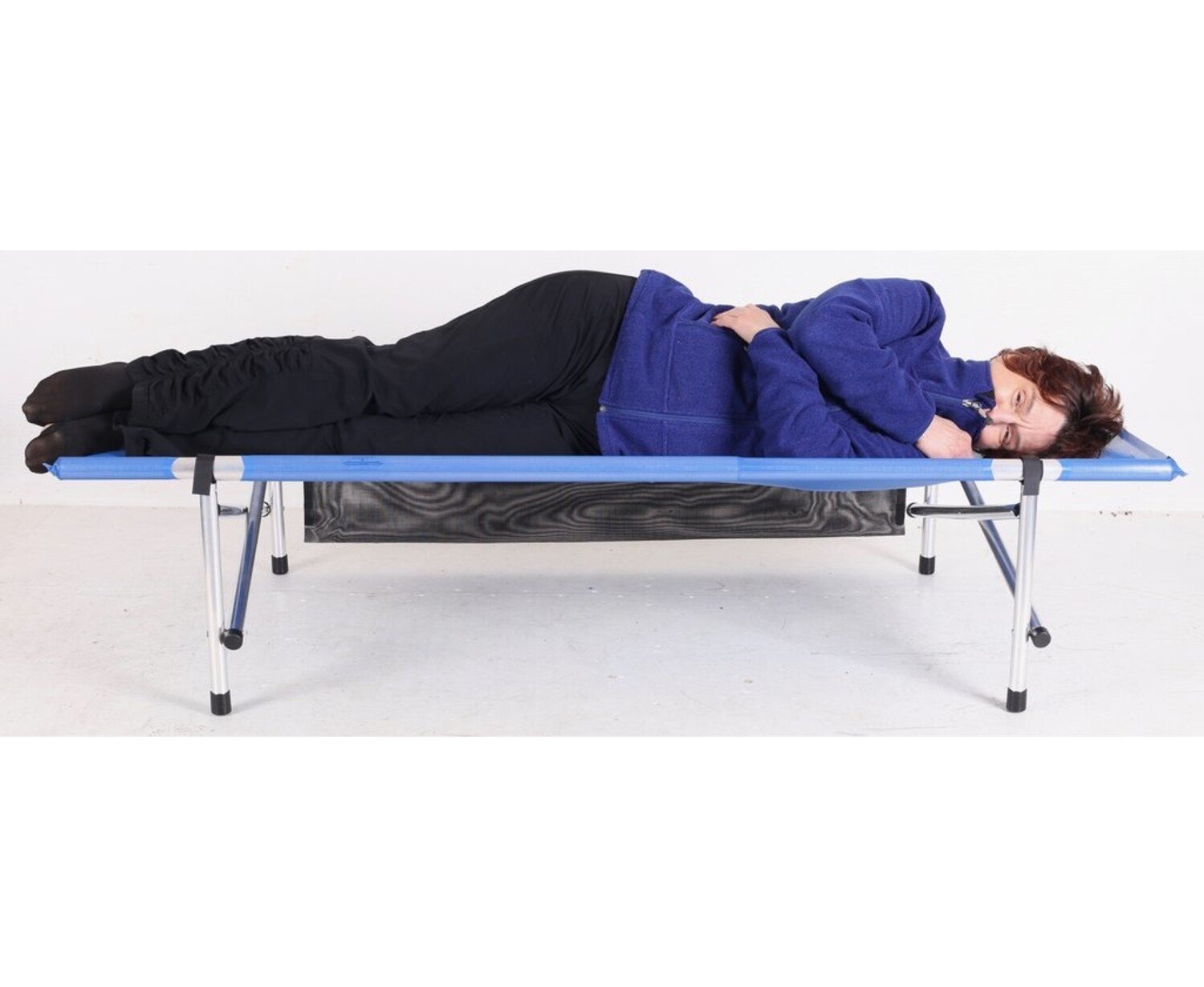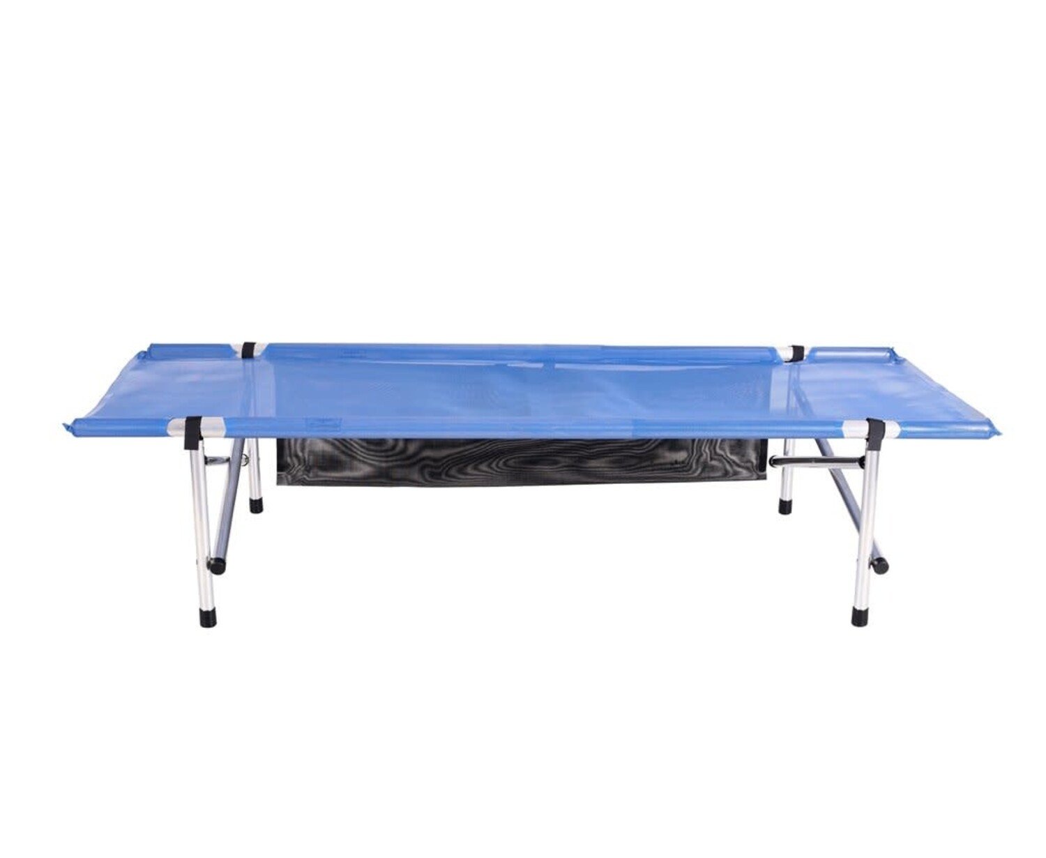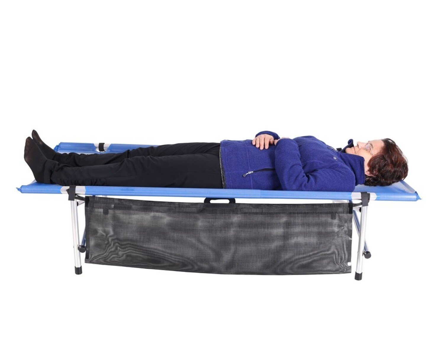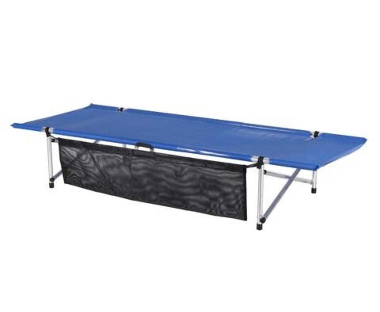 Set-up size- 74"x28"x15" with 2 leg frames, Rolled-up size- 37"x5"diameter, 250 lb capacity, 10lbs weight, Royal Blue Mesh fabric, aluminum legs. Patent #5109556