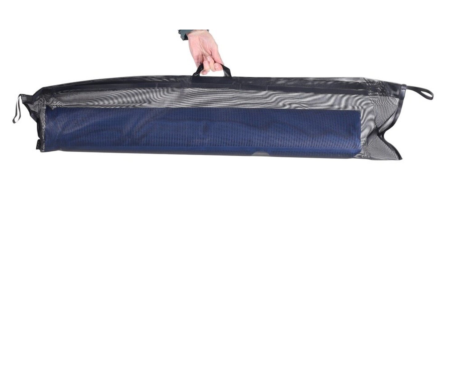Roll-a-Cot® is made with our unique "1000 denier" blue-mesh fabric for its fast drying characteristics that river-runners want and need. In addition our blue mesh fabric has less stretch than other cot materials because there are 2X warp yarns compared to its 1X weft yarn. Its the 2X warp yarns that are used to support the user from "rail to rail". Stretch is further reduced because the 1X weft yarns require only half the "up-down" weaving strokes on the loom, resulting in half the number of "zig-zags" in the warp yarns. Less "Zig-Zag" in the warp means much less stretch across the width of the cot that supports the user.