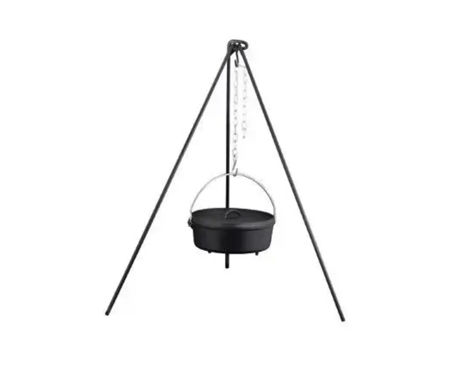 Features include heavy duty steel construction, sturdy adjustable steel chain for hanging cast iron cookware and easy fold up for storage and transportation. Storage bag included.