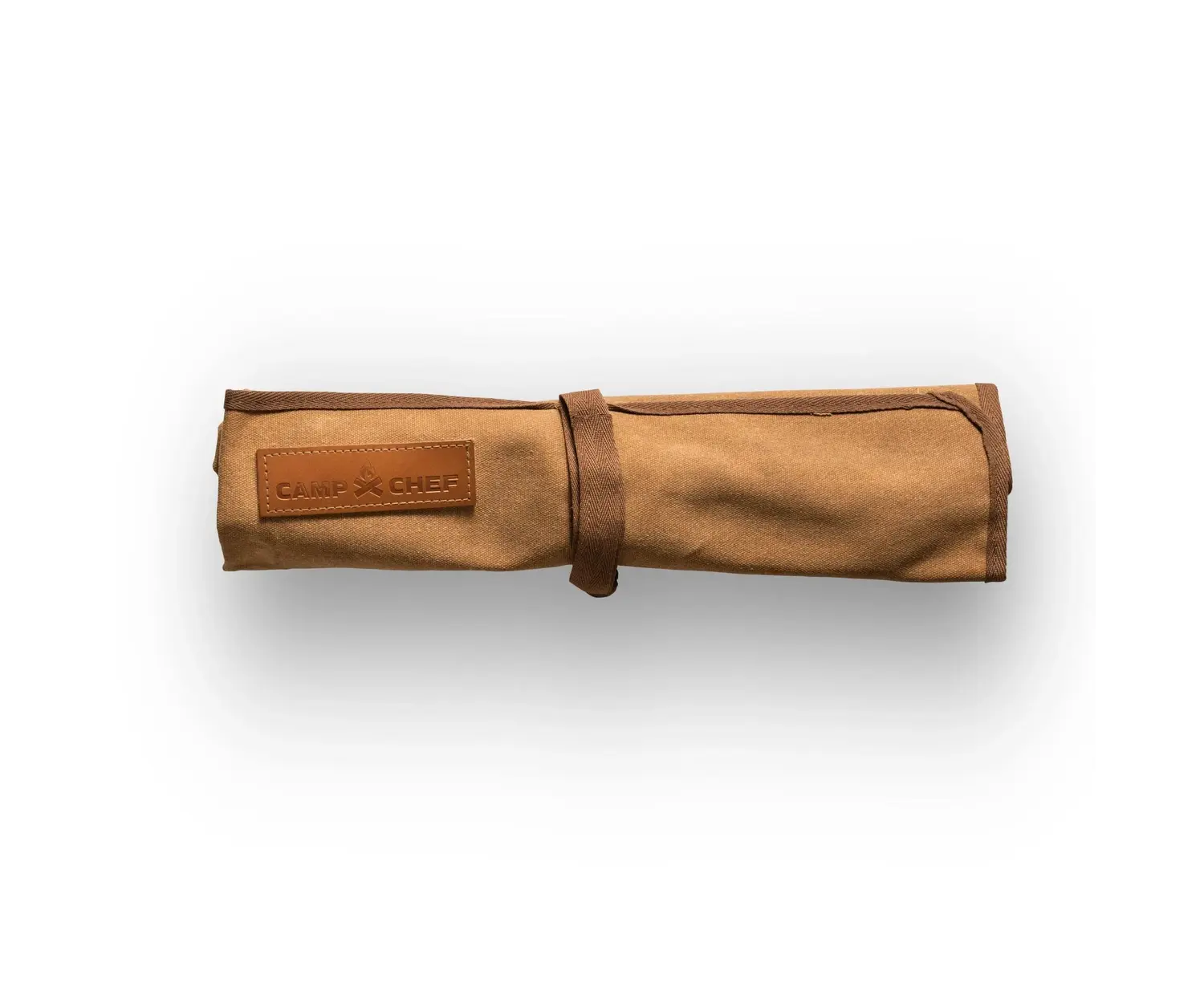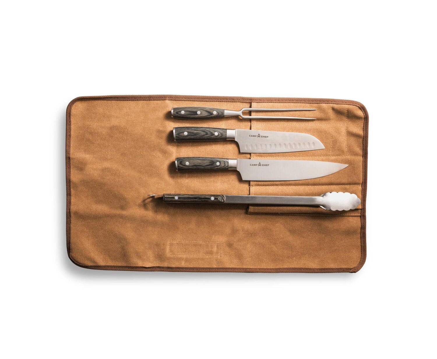 We've included all stainless steel tools like a 10-inch chef knife, santoku knife, a pair of grill tongs, a handy carving fork, and to wrap it all up—a canvas roll knife case. Be sure to check out the Pakkawood handles we've incorporated. We think you'll find it to be a comfortable, natural grip with a clean finish. It's perfect for all types of uses! Enjoy in your outdoor kitchen, home kitchen, back patio, or at the campsite.