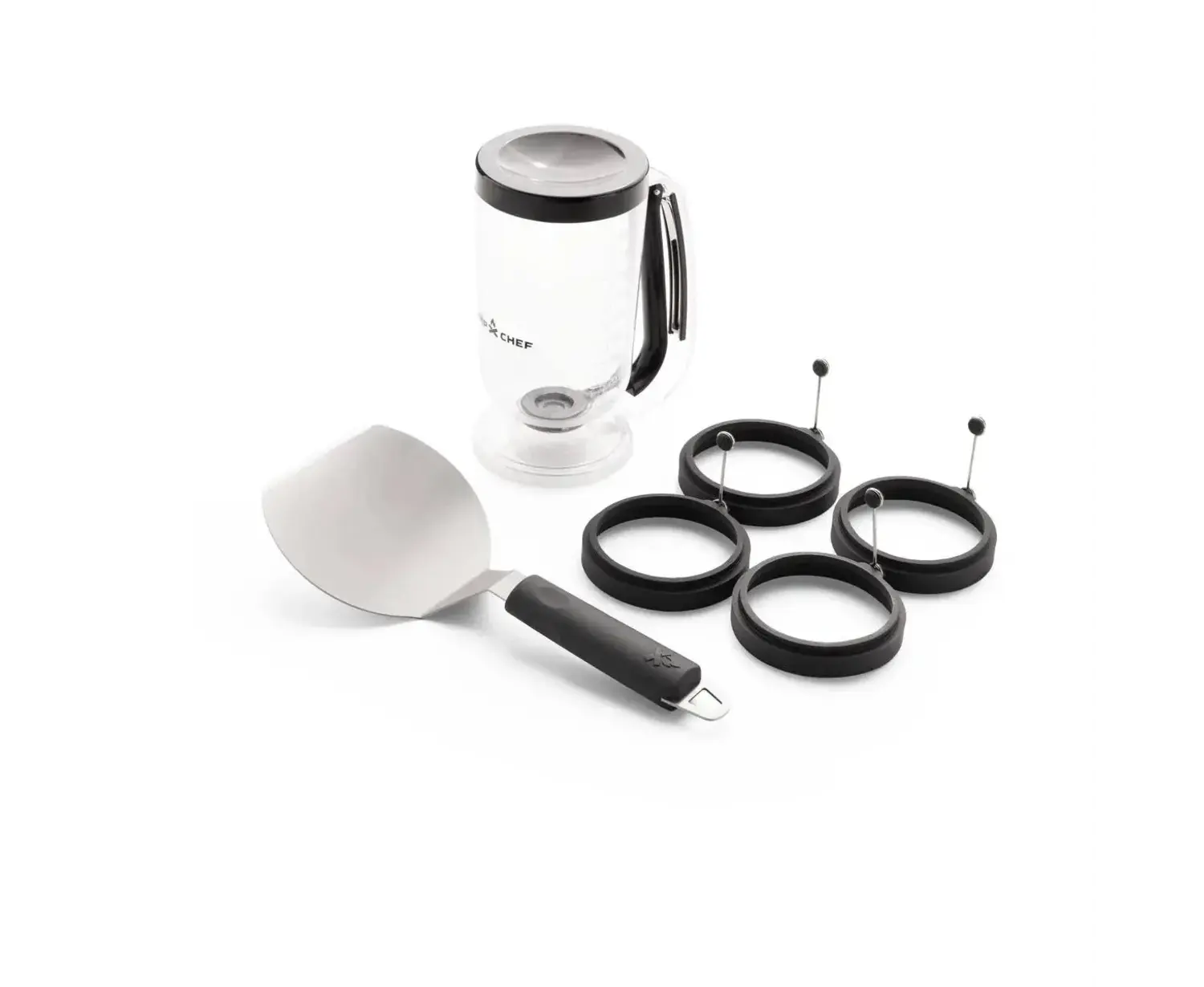 CloseConquer breakfast with the right tools for the job. Perfectly circular eggs, a wide spatula for pancakes, and a pancake batter dispenser will make your breakfast experience something to look forward to.