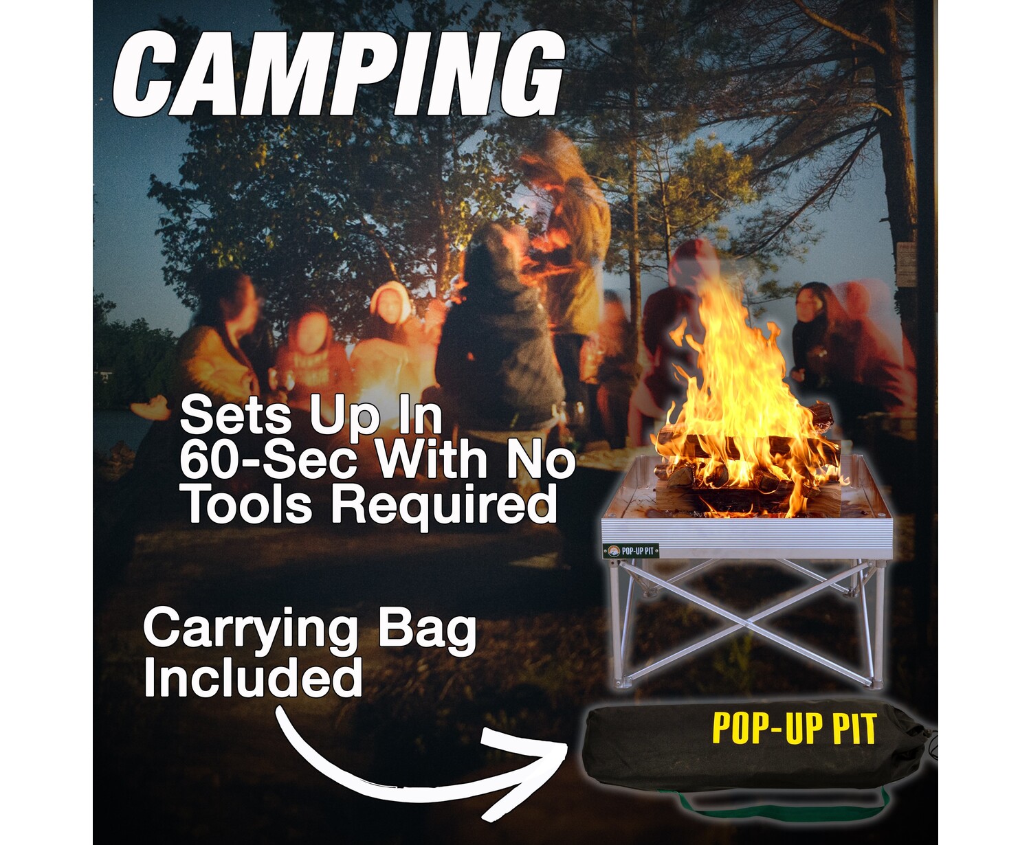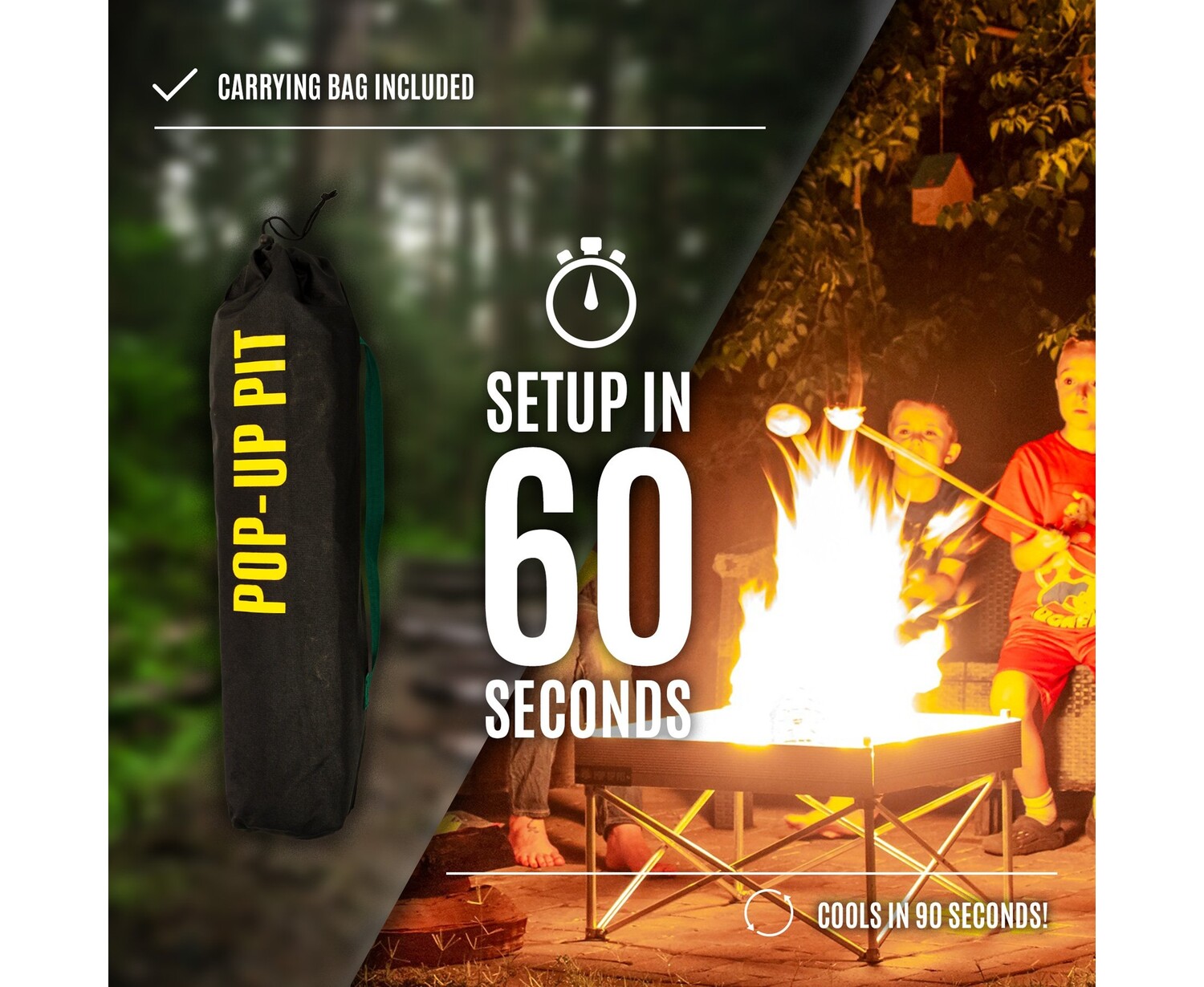 - Our Patented design also allows the Pop-Up Pit to cool in just under 90 seconds so you can pack up and get back on the move