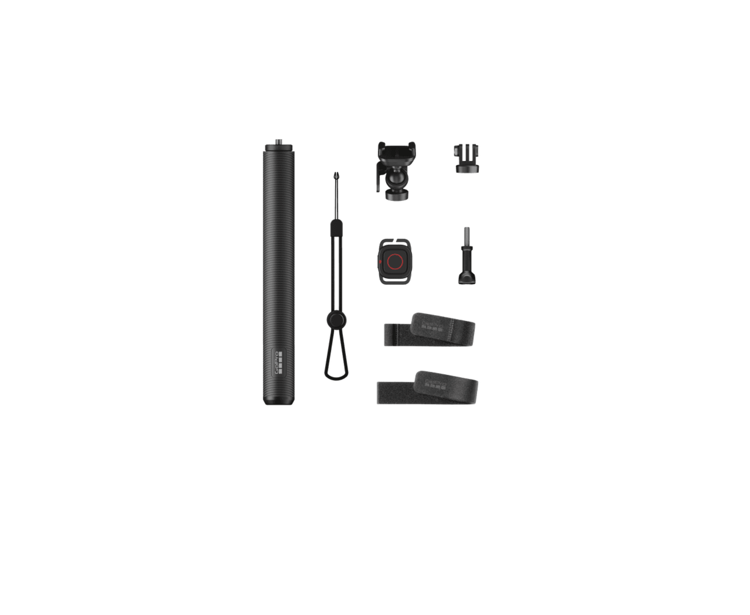- Includes Extension Pole, Waterproof Shutter Remote, mounting finger adapter, ball joint adapter, wrist lanyard, thumb screw, remote strap and remote wrist strap extension