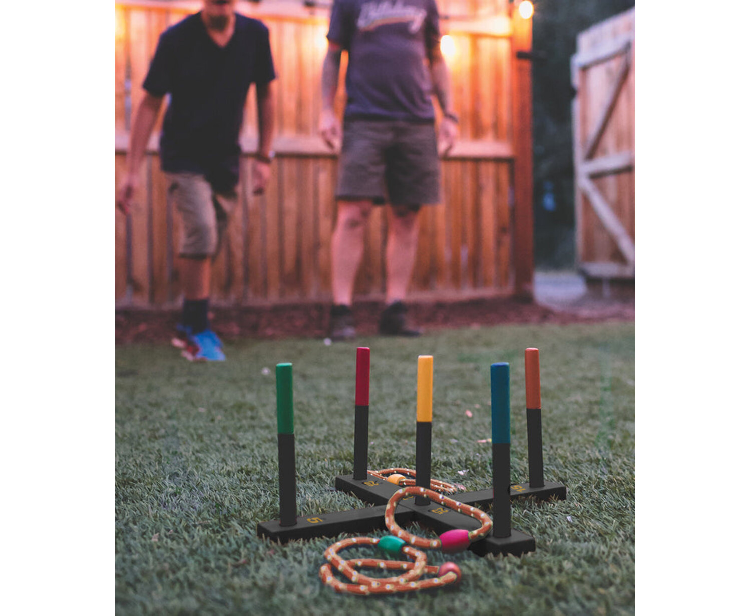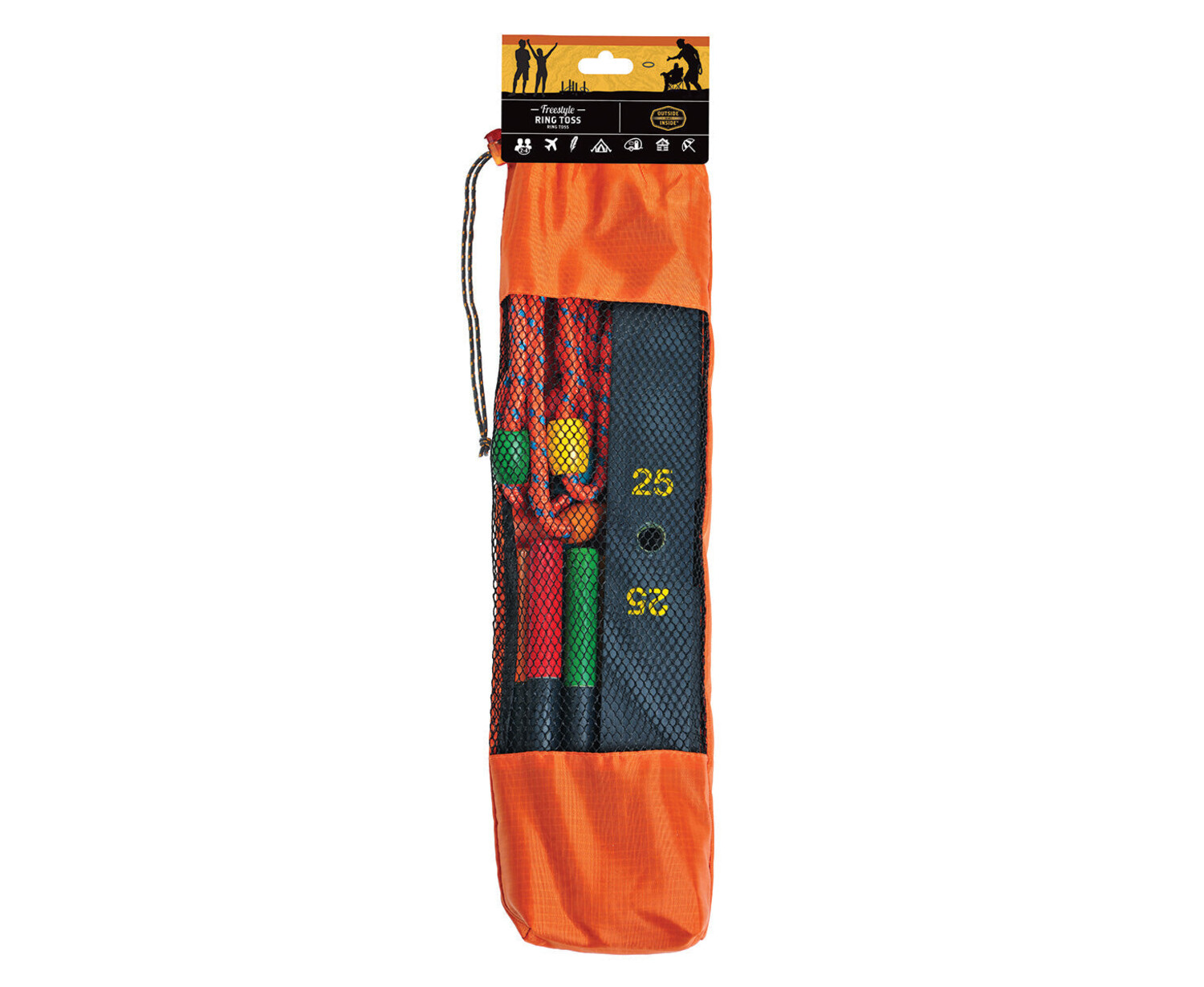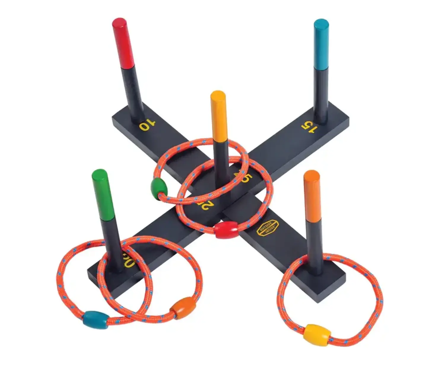 A tossing game of skill. Land the rings on the colored posts for points, highest score wins. Lightweight and packable. Play indoors or out on any terrain.