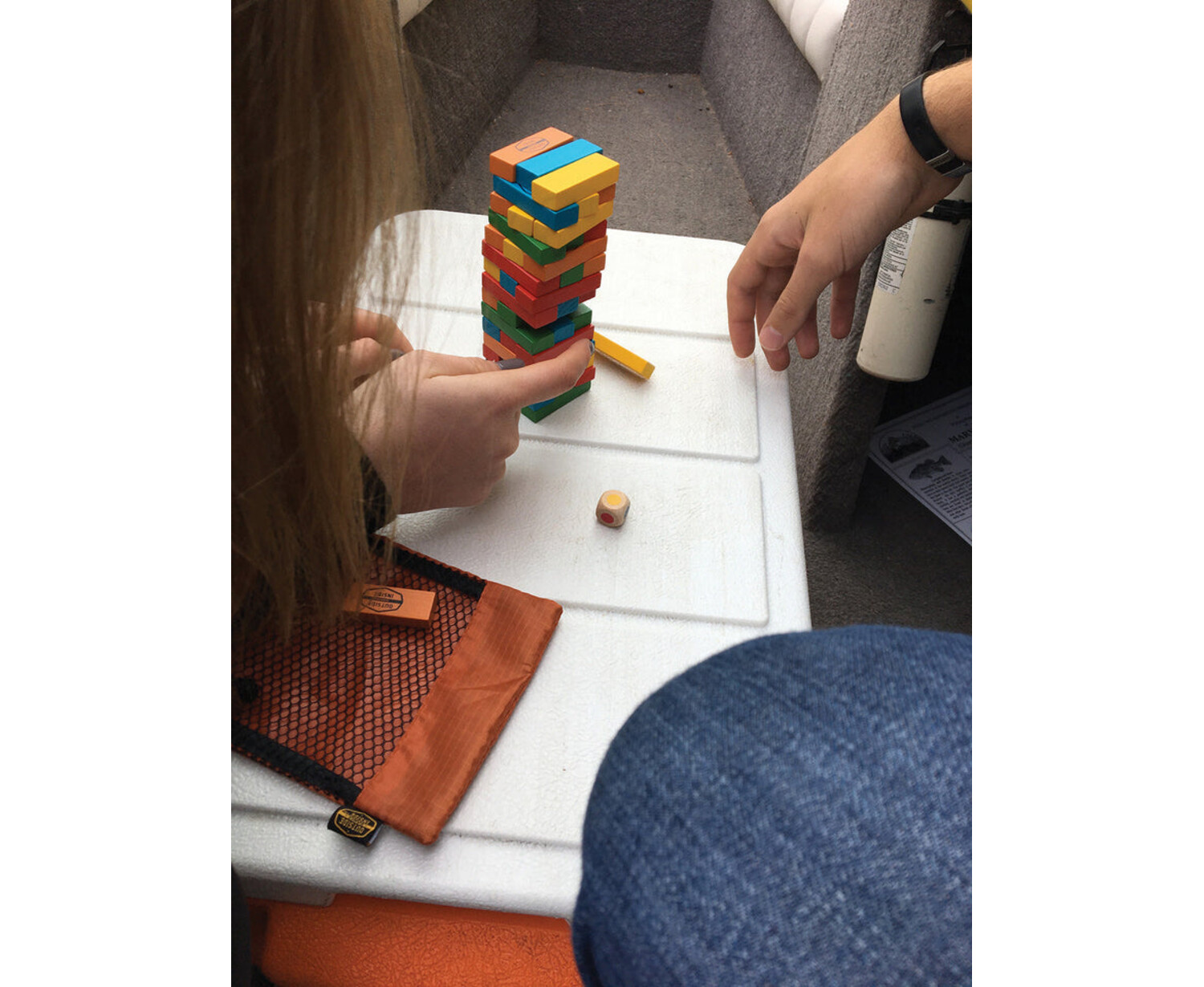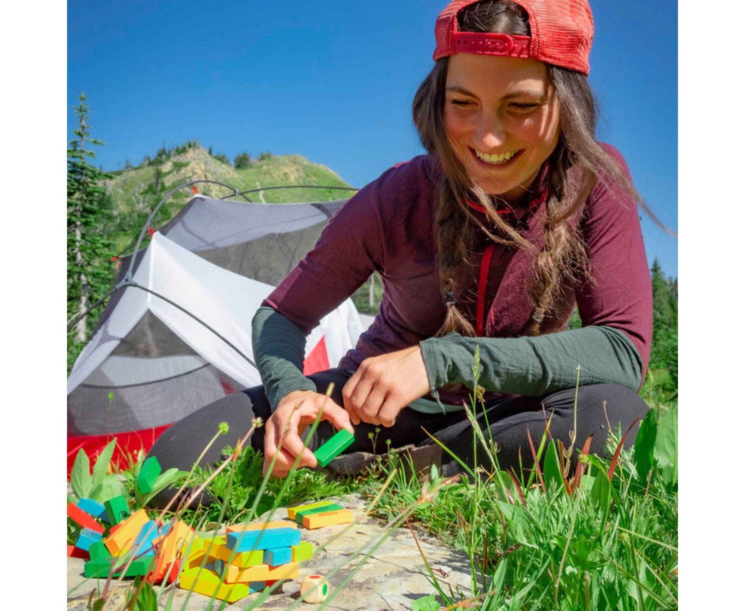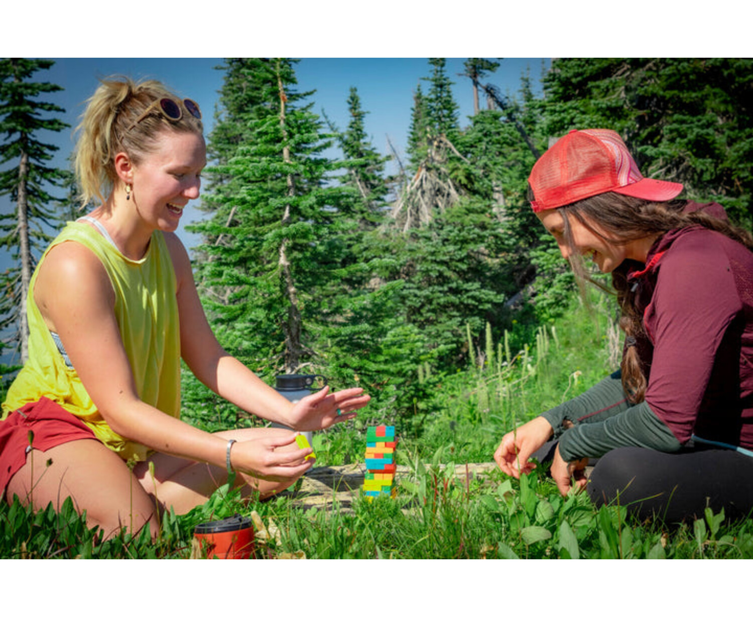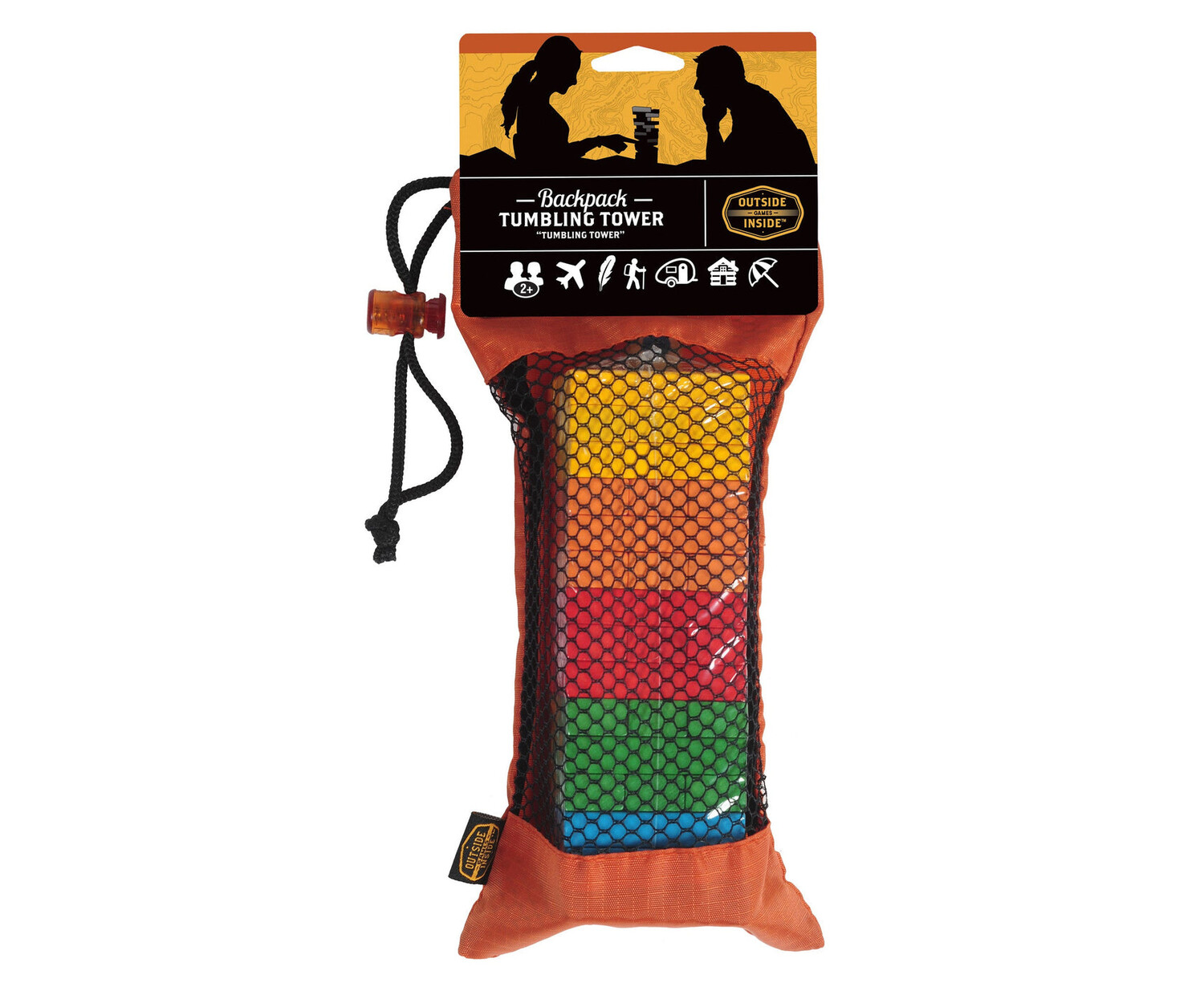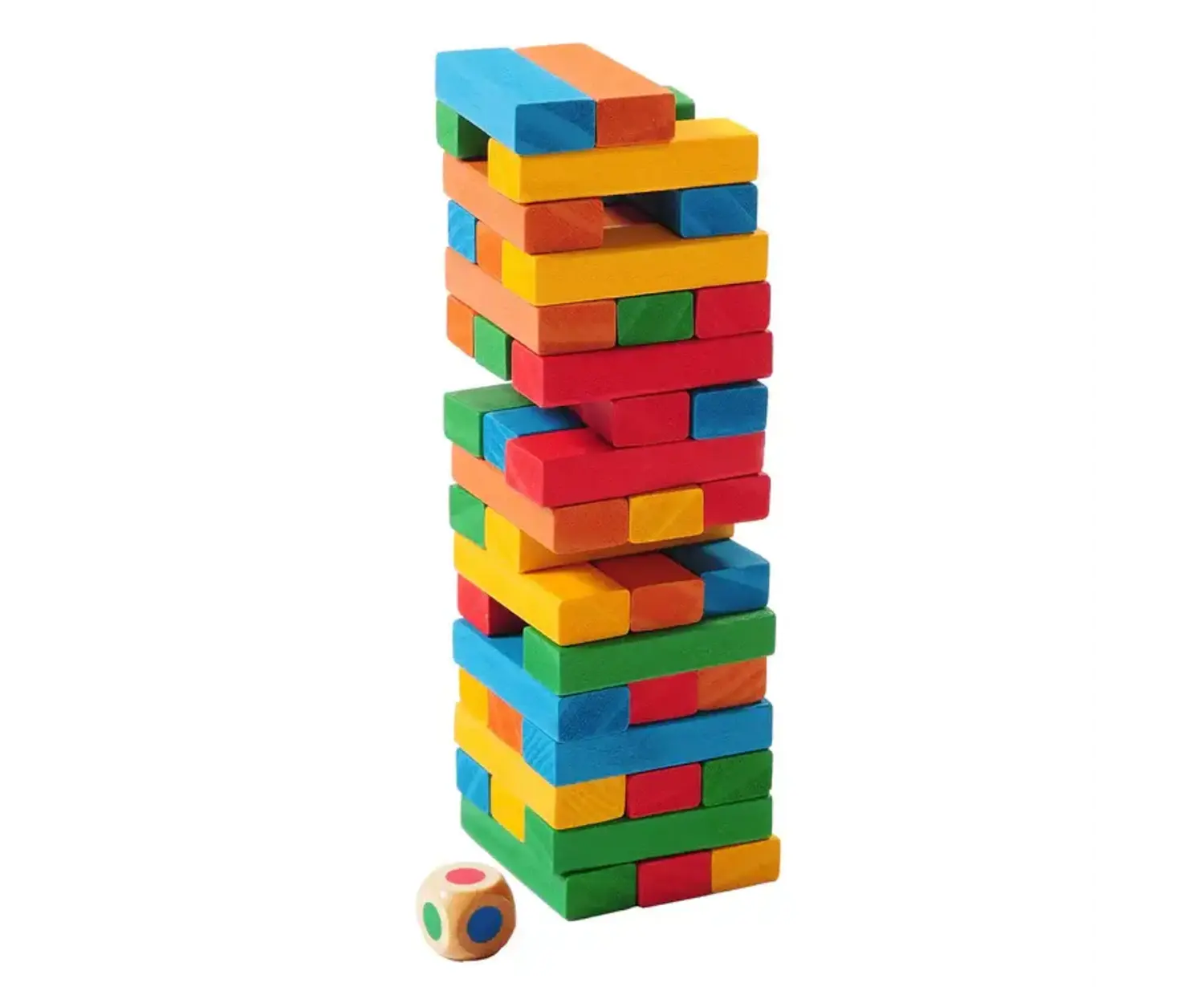 Our compact tumbling tower stands only 6.25" tall when assembled. Small enough to take with you anywhere. A stacking game of skill and balance. Take turns removing and restacking the blocks without tumbling the tower. Use the dice to add more fun!