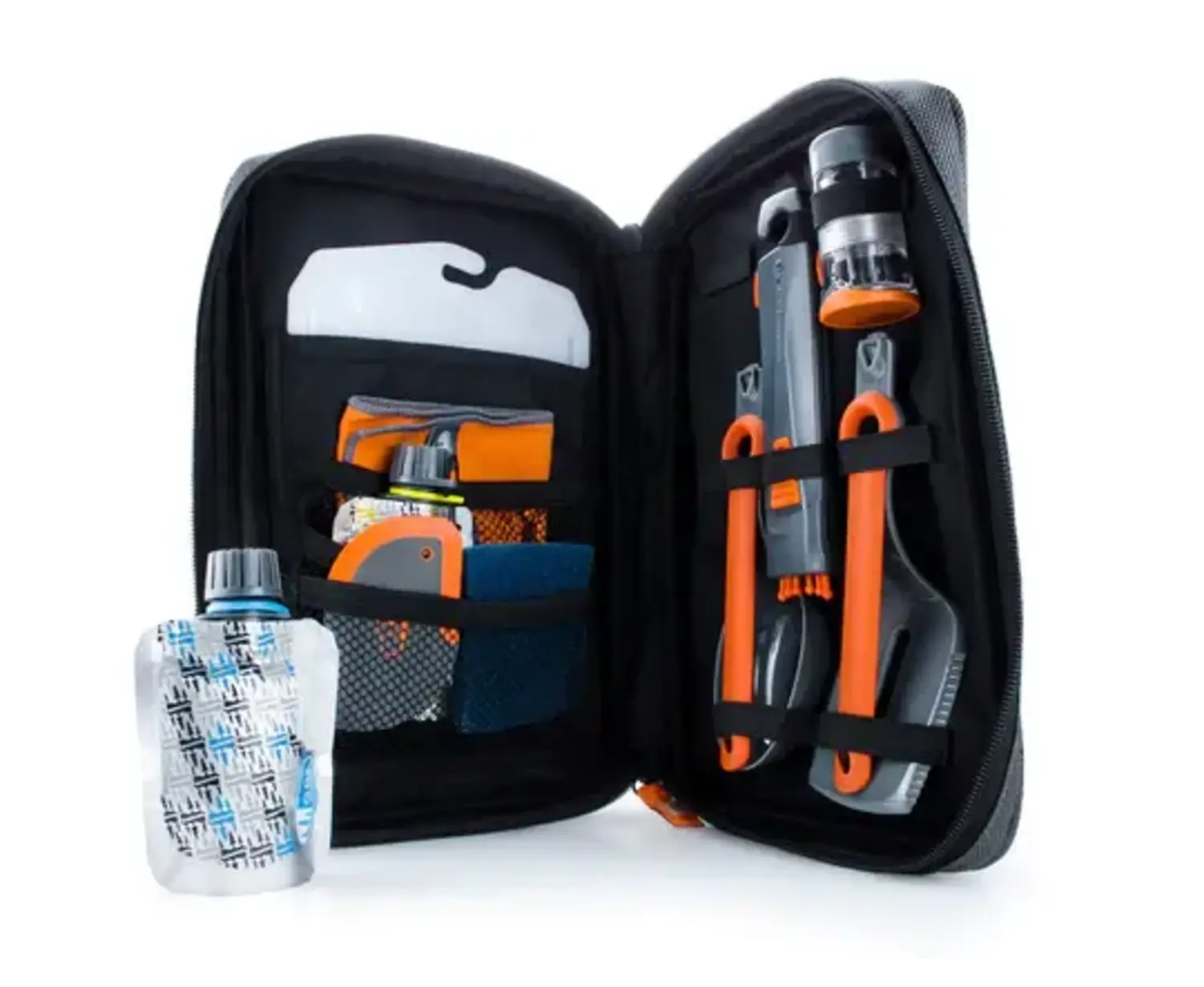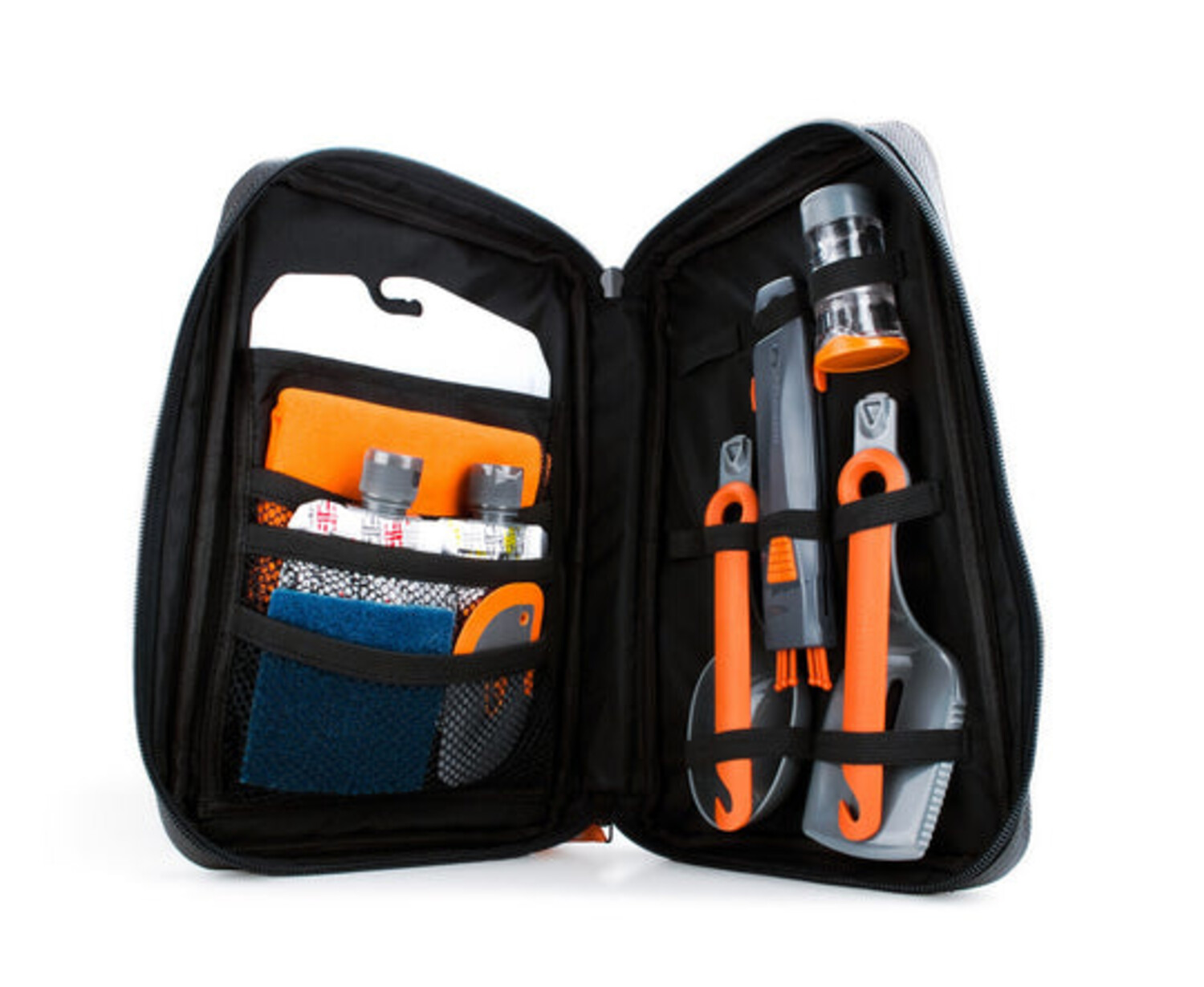Includes: Collapsible Whisk, Pivot Spoon, Pivot Spatula, Spicer, 2 Condiment Containers, Cutting Board, Scrubber, Scraper, Camp Towel, Ballistic Nylon Case