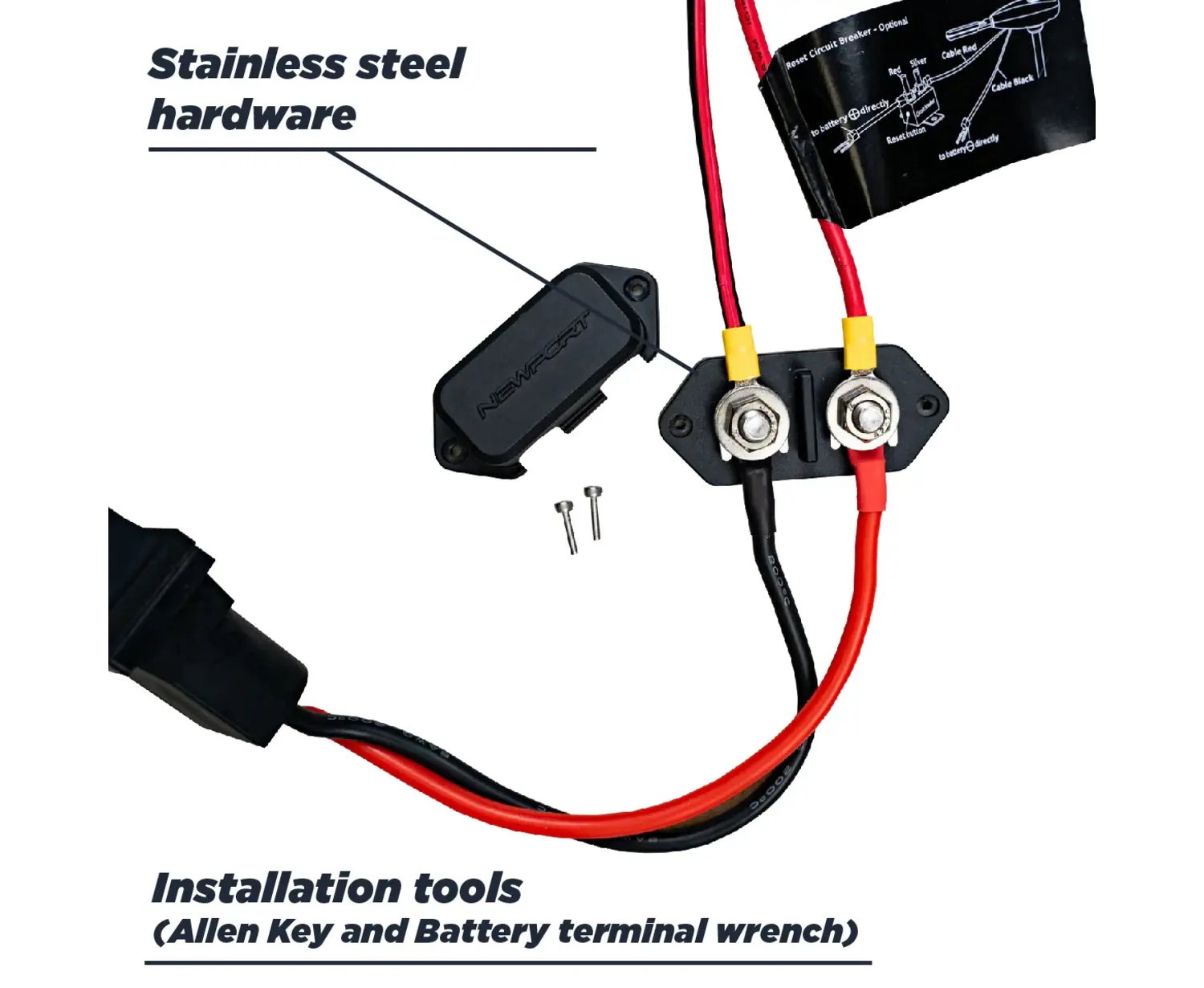 The Newport Battery Quick Disconnect kit provides an easy way to add a quick connect/disconnect from your battery to your powered devices. With our connection pad and included installation tools, this kit allows you to install the connectors without the need for crimping or soldering, allowing for a simple and fast installation.