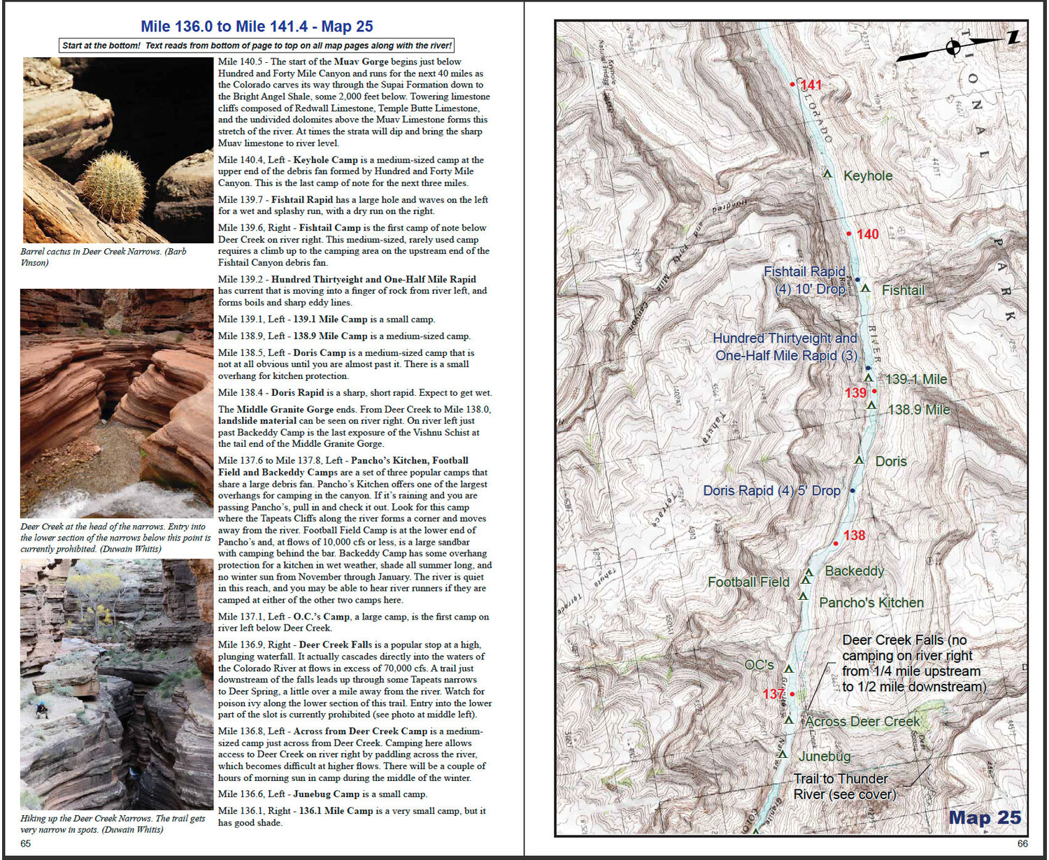 Our spiral-bound guide books are offset-printed on plastic pages. The covers are plastic card stock. The entire books are waterproof and tear resistant (but not indestructible!). Our guide books include mile-by-mile descriptions of campsites, rapids, and points of interest and include many photographs.