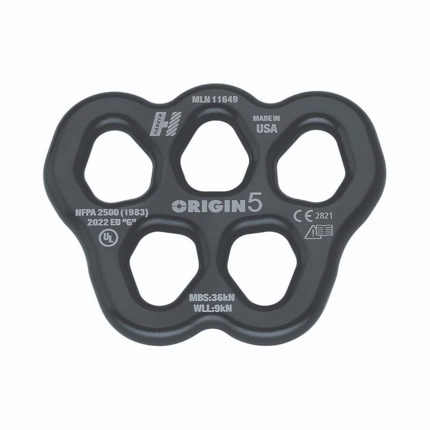 Origin 5 Our lightest rigging plate has just the right number of connection points to keep your rigging organized and it is ideal as a master point for litter bridles. The large connection holes allow you to easily rotate most locking carabiners. Strong, with an MBS of 36kN in any direction, the Origin 5 is manufactured with custom tooling to create textile-friendly rounded edges.