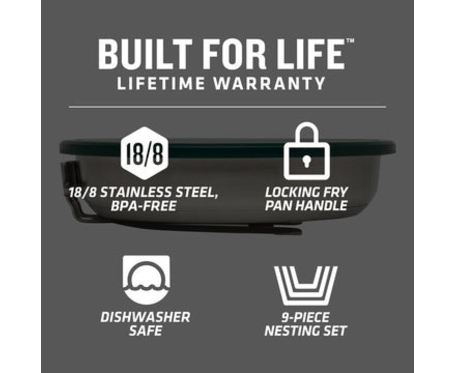 Burgers, pancakes, scrambled eggs or stir fry—this 9-piece set is made to cook up anything on your menu. Designed with superior 3-ply construction, the fry pan performs as well as your favorite kitchen pans for more even heating. There’s also a cutting board, collapsible spatula and trivet for food prep, plus a two-person place setting to serve and eat.