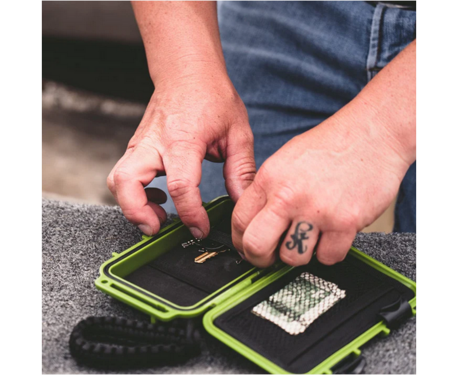 To keep everything neat, tidy and held in place while stored inside, we equipped the box with two interior elastic straps, EVA foam insert and mesh pocket. Para-cord style lanyard included.