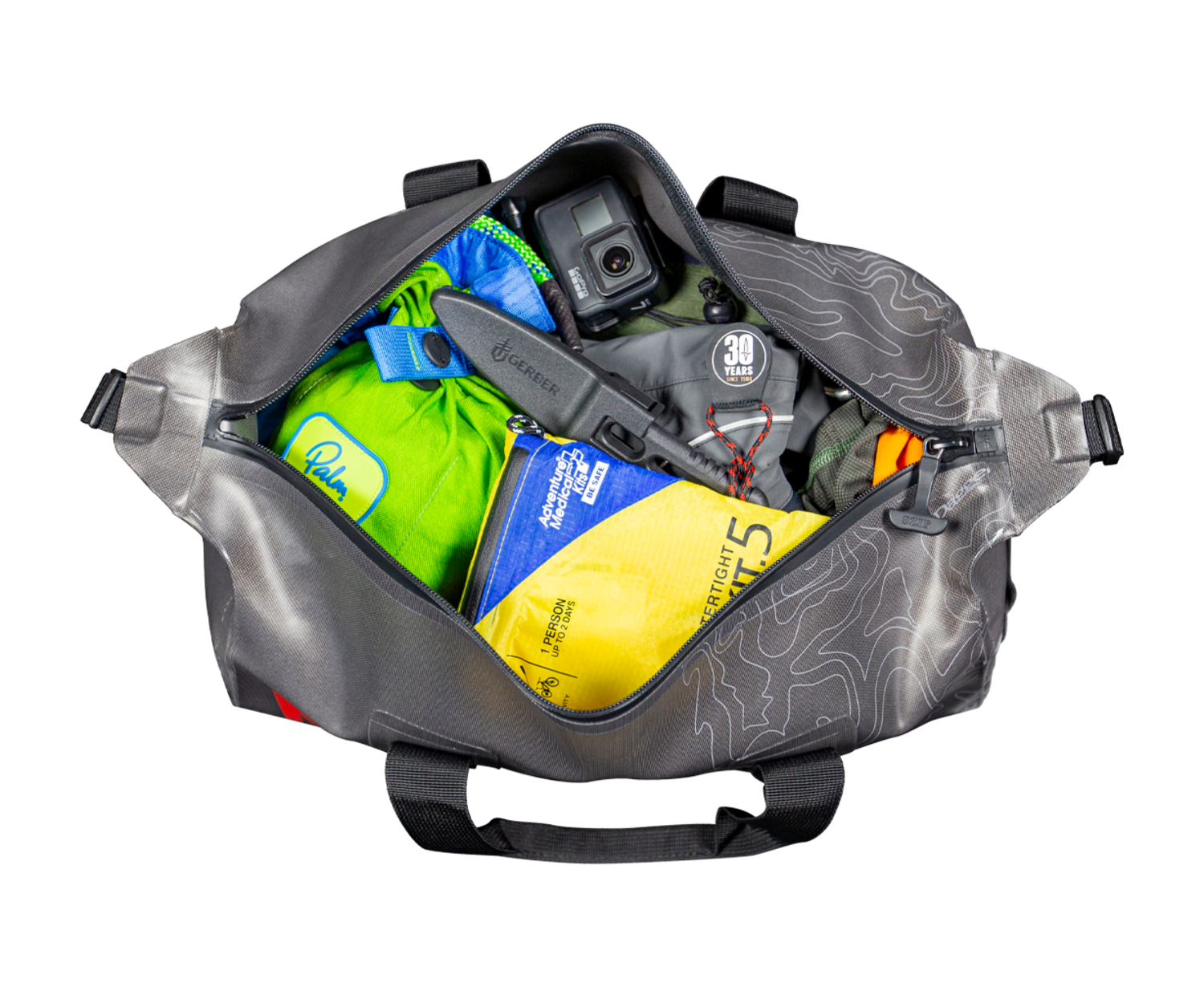 - Submersible waterproof zipper keeps contents dry and is lengthened for wide-open access