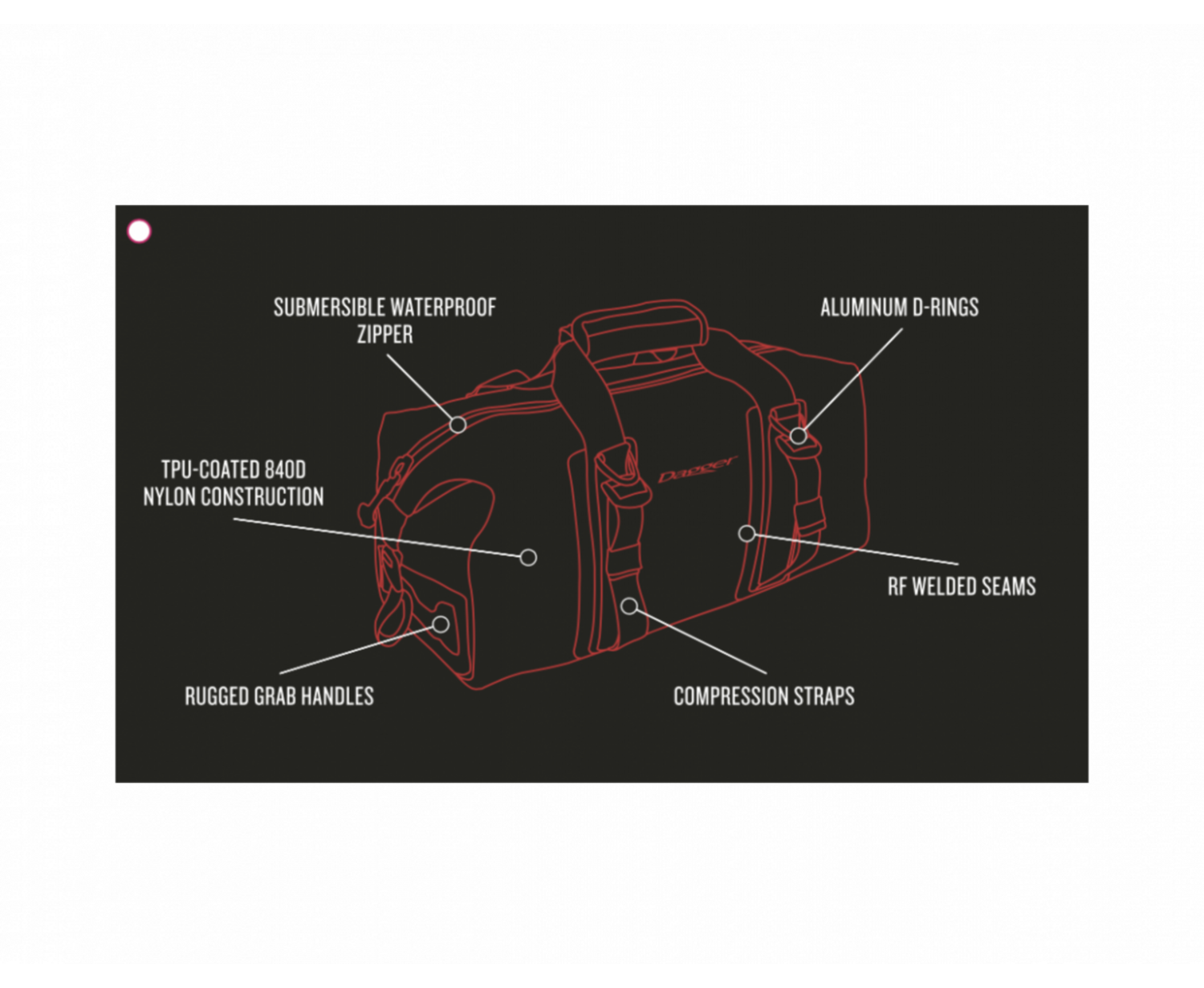 - Four marine-grade aluminum D-rings can be used as anchor points or for attaching a shoulder strap.