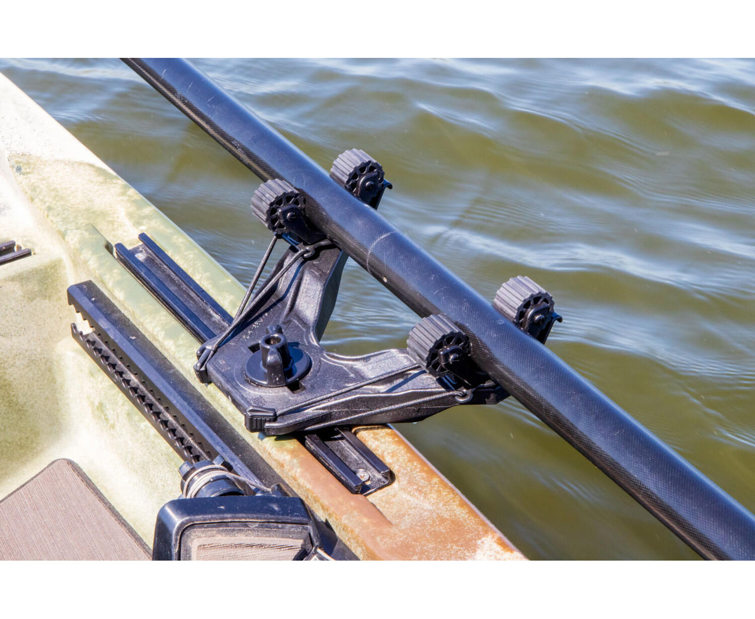 CloseIn typical YakAttack fashion, what started as an idea for a single offset RotoGrip Paddle Holder resulted in a product with a bit more versatility. The DoubleHeader track mount can serve several different purposes, but in this case, it is the foundation for the perfect offset paddle holder solution that our customers have been dreaming of ever since the launch of the RotoGrip several years back. Compatible with standard diameter kayak paddles the RotoGrip Paddle Holder has become the most widely used paddle holder in the industry. The RotoGrip is a simple yet highly effective paddle holder solution, but many paddlers wanted to use one or two RotoGrips on a single side of the kayak. When using two RotoGrips on a single piece of track, you get a nice tight hold, but you also cover up the entire length of the track with your paddle, rendering open track space useless. The DoubleHeader in this configuration eliminates that problem entirely and offsets the paddle holders off the kayak allowing for the full functionality of the remaining track space for other accessories. If you are tight on track space, the DoubleHeader includes an additional feature to add LockNLoad accessories like YakAttack rod holders, camera mounts, and more. Simply replace the stock knob from the DoubleHeader with the LockNLoad base of a rod holder or other accessories, and you are able to have multiple attachments on a short section of track or a single point of attachment like a MightyMount II. The DoubleHeader track mount is compatible with YakAttack GearTrac, MightMount XL, MightyMount Switch, MightyMount II, and most other factory installed kayak track.