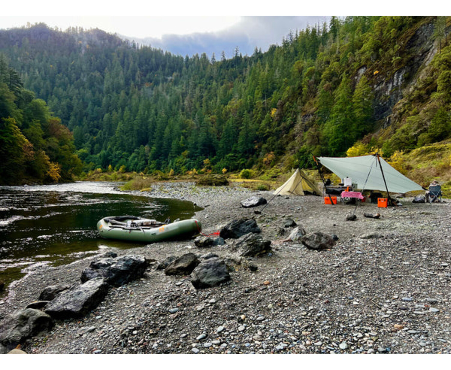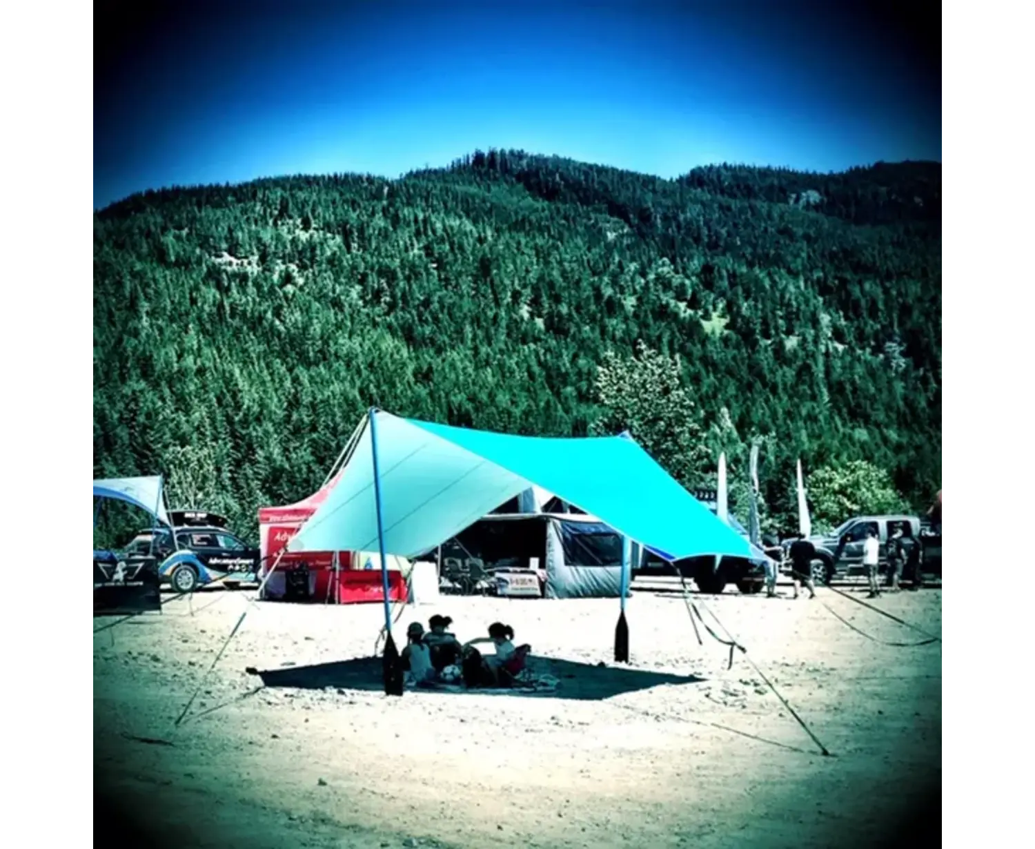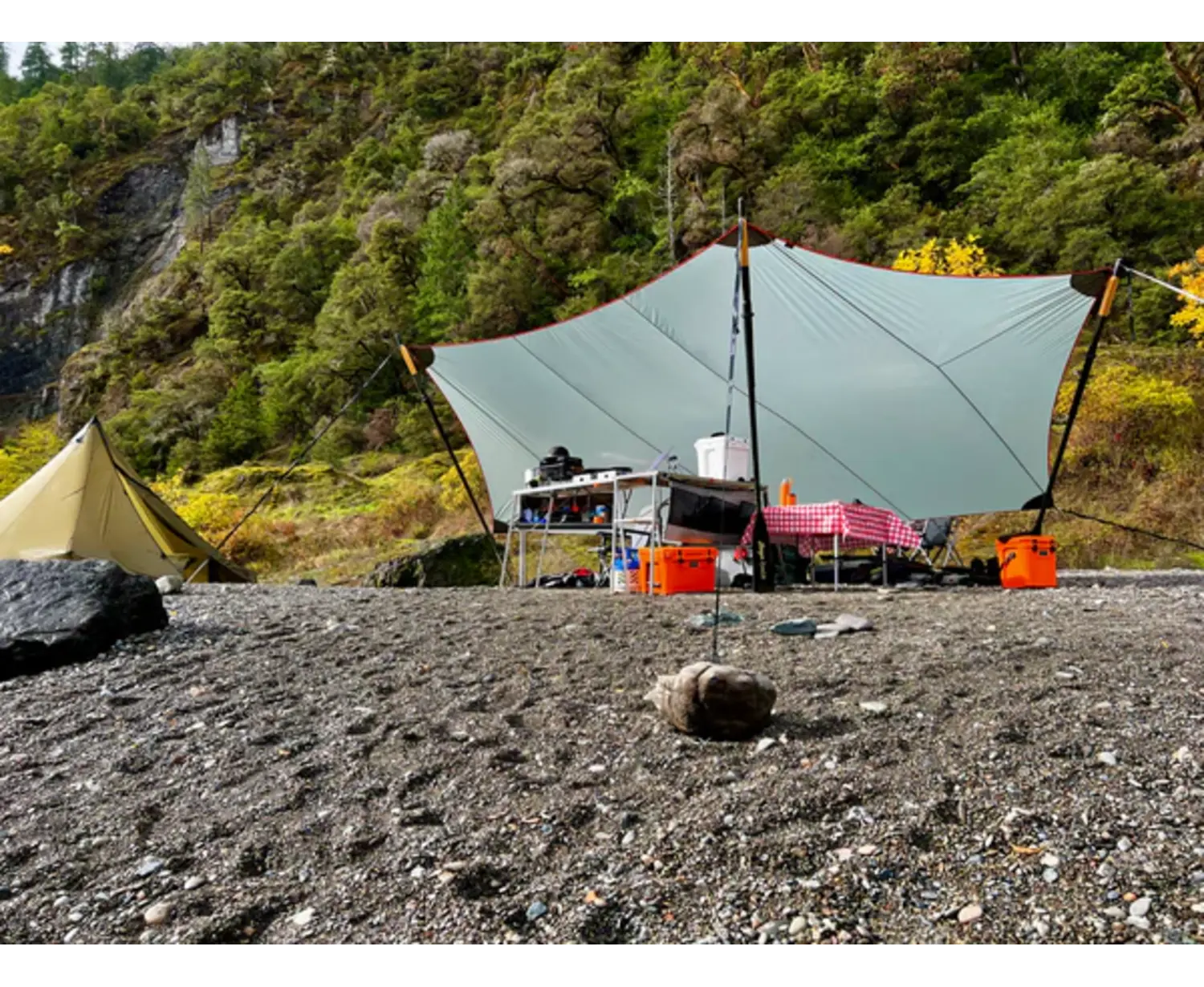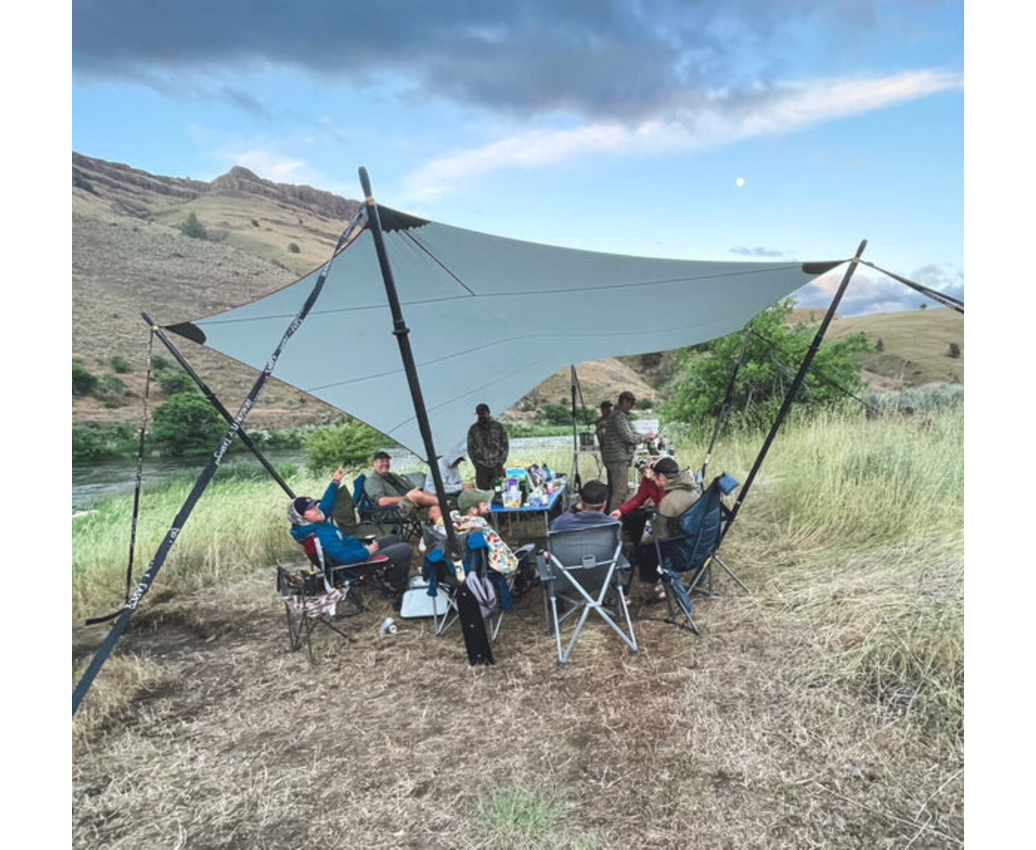 A lightweight shelter that helps protect from the rain and sun. Perfect to cover areas such as kitchens and gathering spots.