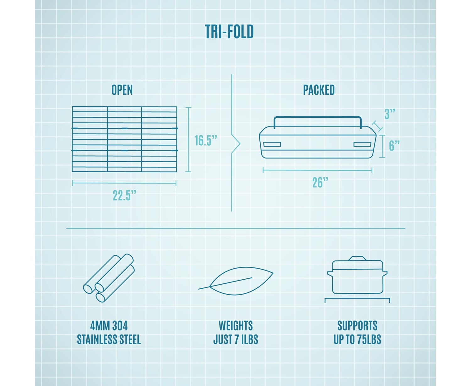 - Patented Tri-Folding design packs down small for easy storage and transportation