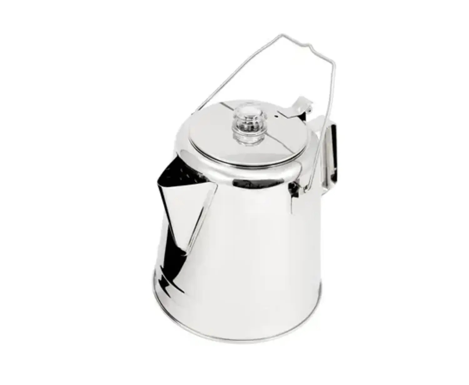 Great for brewing coffee for large camping groups, the rugged stainless steel GSI Outdoors Glacier Perc coffee percolator is great for use on both stove top or campfire. Available in multiple sizes, it features heavy-gauge 18/8 stainless steel construction that's resistant to corrosion and will withstand ground impacts. It features a pour spout that minimizes dripping, stainless steel handle, and a stainless steel wire bail handle at the top. The PercView dome made of glass provides a view into brewing progress, and this three-piece percolator includes an inner basket with cover. The campfire Glacier Perc is available in the following sizes: