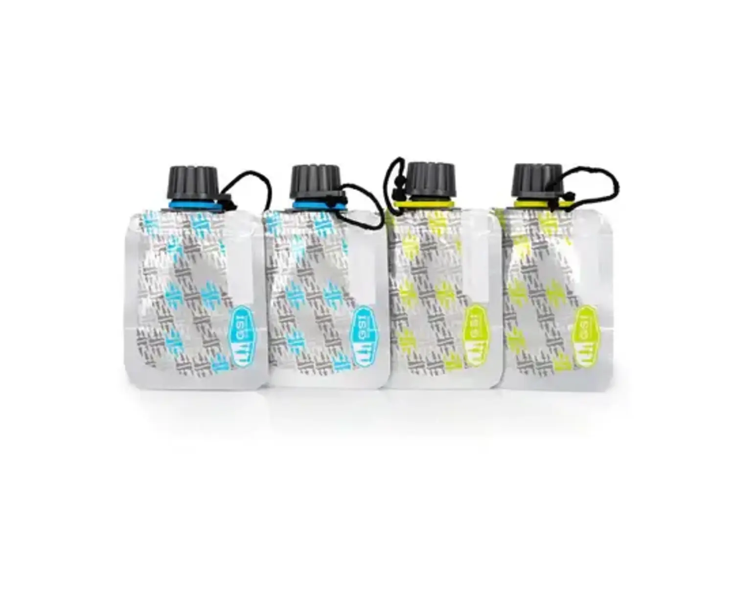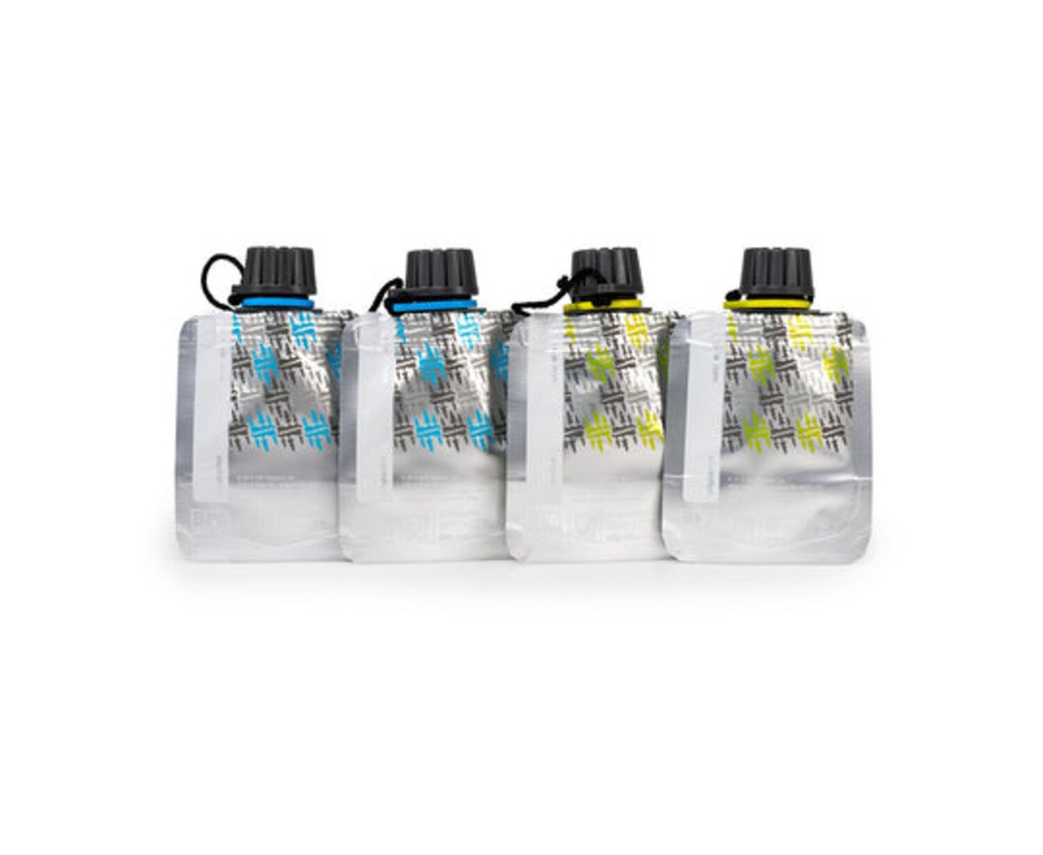 Includes: 4 2 fl. oz. Soft Bottles, 4 Flip-Top Squeeze Lids, 4 Tethered Twist-Off Lids