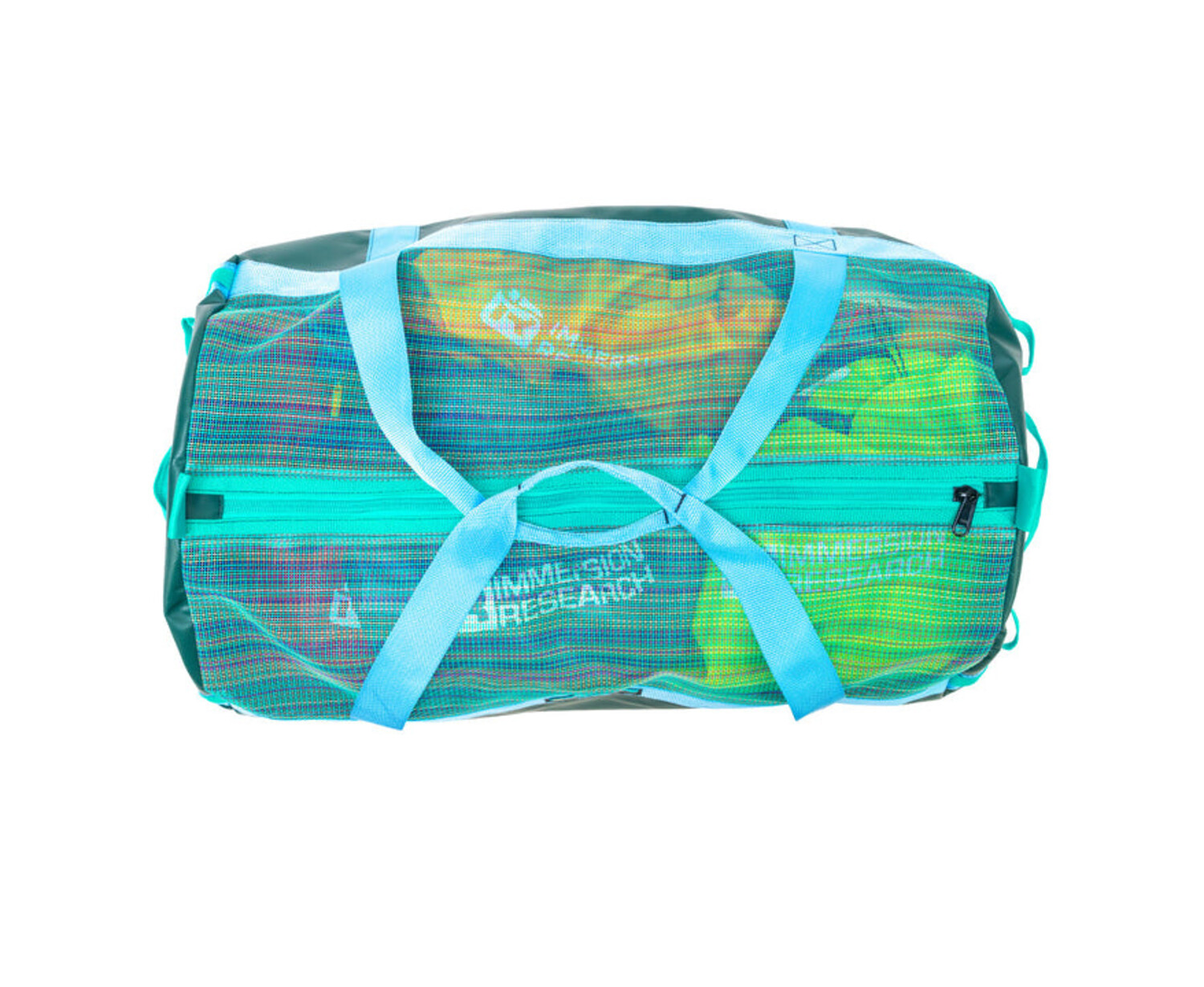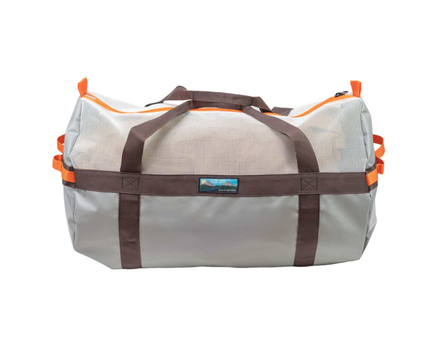 When designing this round of gear bags, we wanted to ensure that whatever we made would be just as tough as our last version. After rigorous testing, we finally found materials that fit the bill. The durable, abrasion resistant vinyl coated polyester base contains dirt and grime to the inside of the bag, while the mesh upper offers ventilation for wet gear. There are tie down points on each end to help secure the bag and the oversize webbing handles make it easy to carry, even when loaded down.
