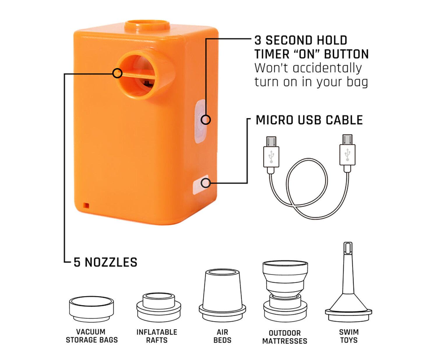 - To prevent the pump from accidentally turning on in your carry-on or drybag, we've added a three-second hold timer to the on button.