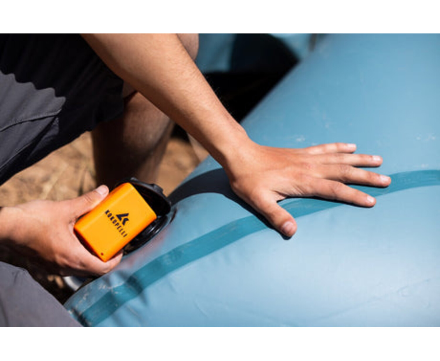 Inflate your packraft in 60 seconds flat with the new Feather Pump. The Feather Pump weighs only 6 oz and will fit in your hand. The rechargeable lithium-ion battery has a 40-minute battery life (or 40 full inflations/deflations) and works with any USB charger like your Goal Zero, solar chargers, battery packs, or cell-phone charger.