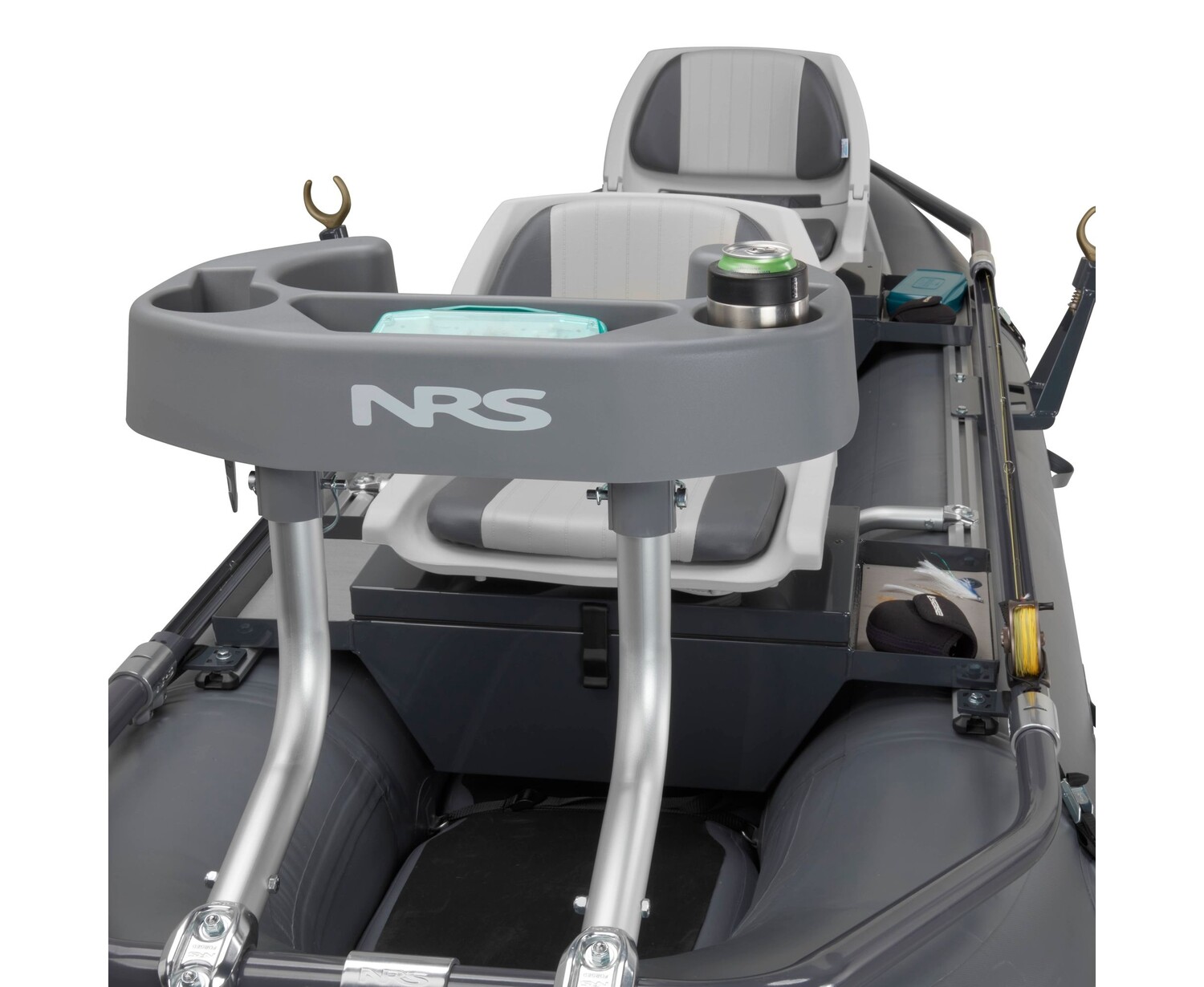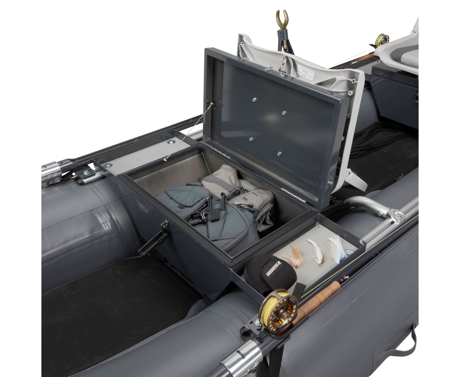 - A Molded Thigh Hook in the bow provides additional support for the front angler and features cup holders and a storage tray.