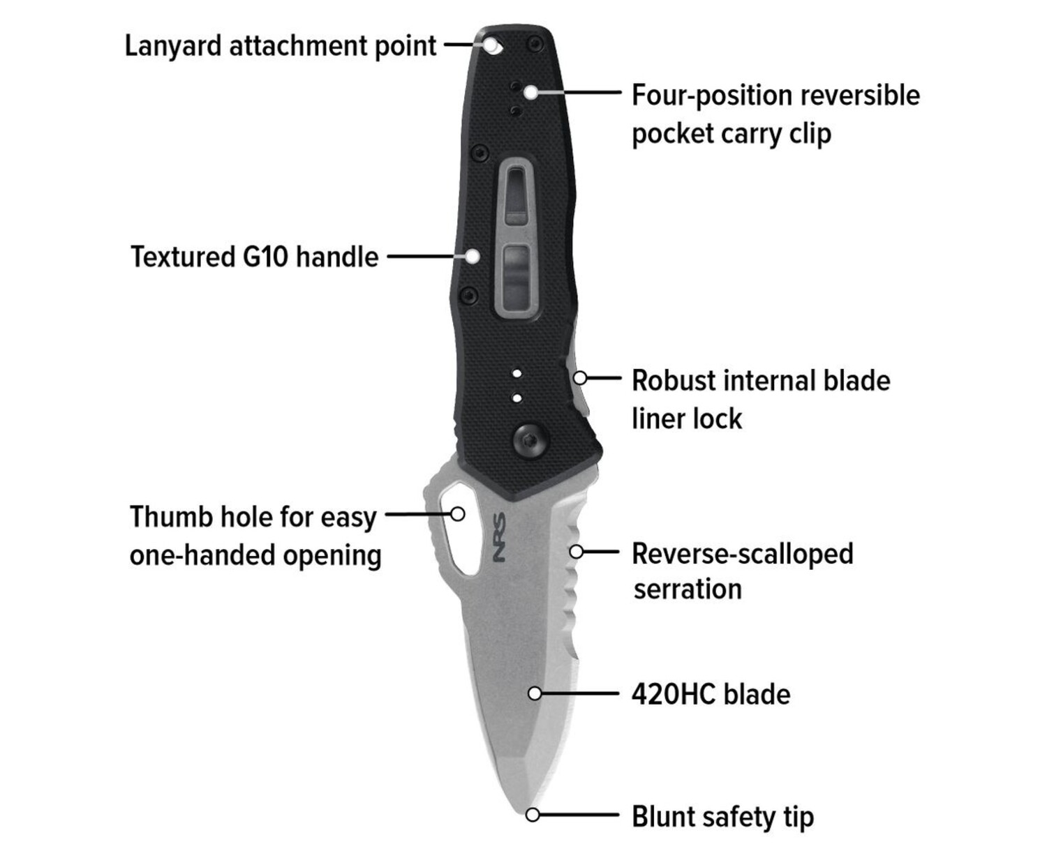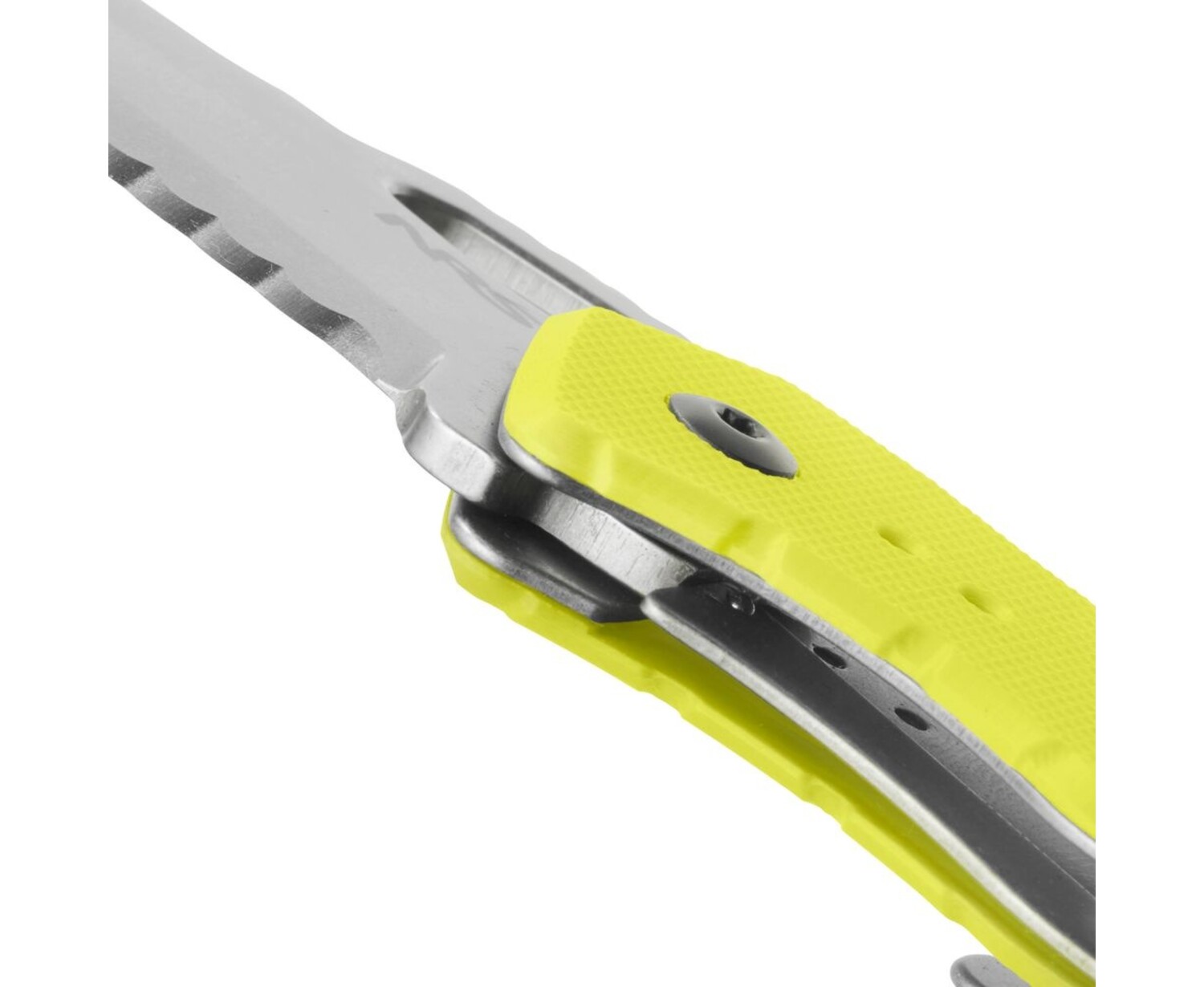 - The partially serrated edge covers all your cutting needs. The 'reverse scallop' serrations facilitate severing tough fibers.