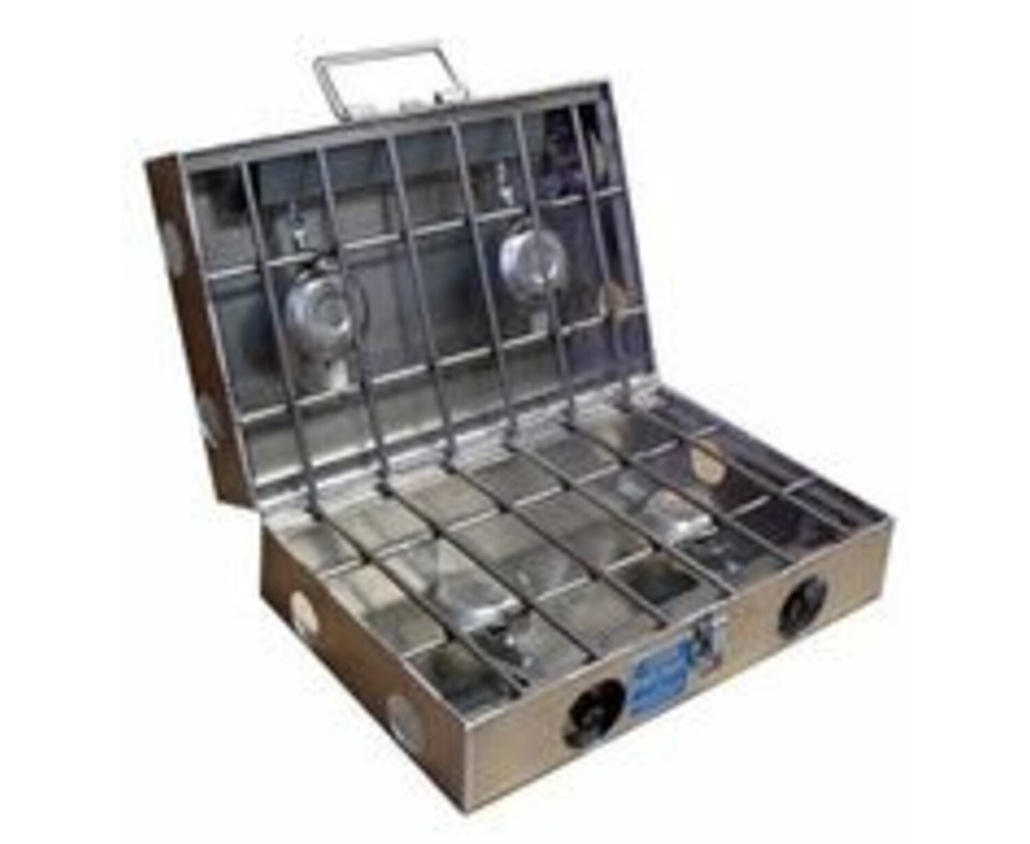 The 16" and 18" wide 4 burner stoves are the most popular. Match them up with a stove stand, and set up your kitchen anywhere. 12 x 18 x 7 closed, 24 x 18 x 3 1/2 open. 21 lbs. This stove can be fit with a break-apart hinge so 1/2 can be taken on a trip or the stove can be laid out with all 4 burner controls facing the cook. A Partner Steel carry bag is available for when the stove is not in use.