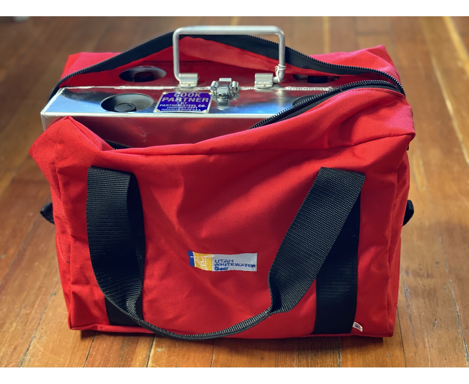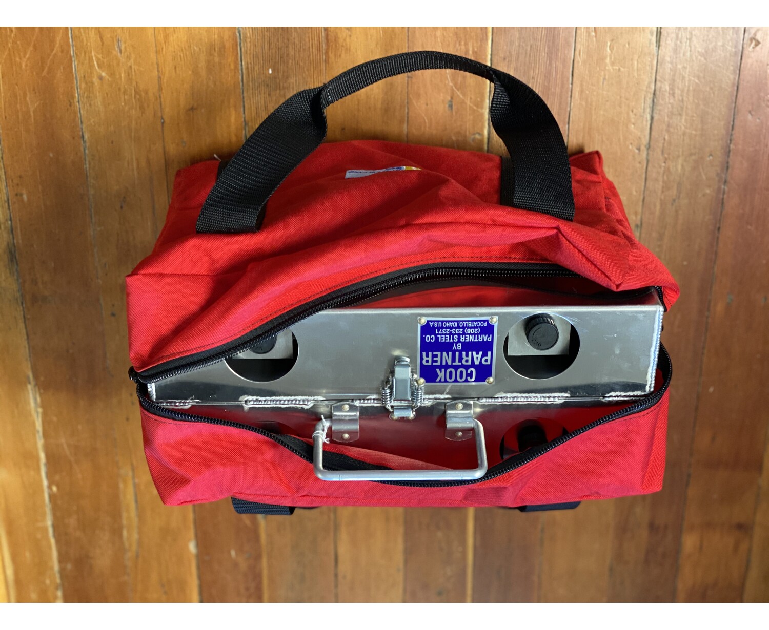 Match them up with a stove stand, and set up your kitchen anywhere. 12 x 16 x 7 closed, 24 x 16 x 3 1/2 open. 21 lbs. This stove can be fit with a break-apart hinge so 1/2 can be taken on a trip or the stove can be laid out with all 4 burner controls facing the cook. A Partner Steel carry bag is available for when the stove is not in use.