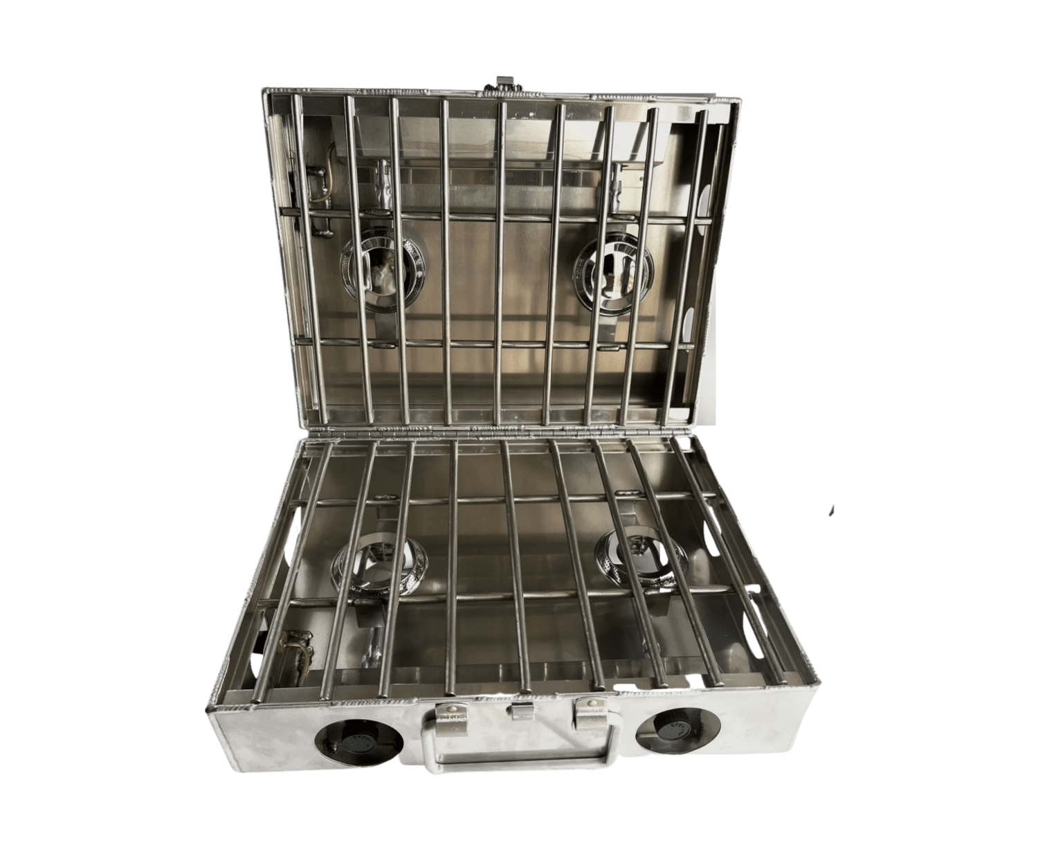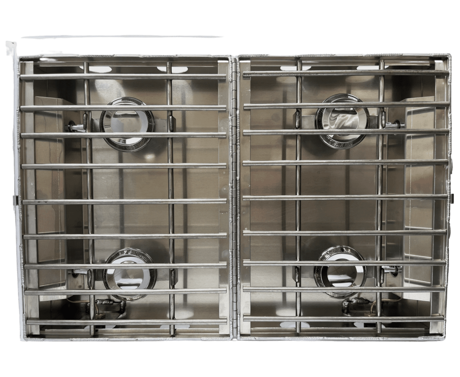 Our 18″ 4 burner stove measures 12 x 18 x 7 closed, 24 x 18 x 3 1/2 open. It weighs 21 lbs. This stove is fit with a break-apart hinge to offer more cooking versatility, 1/2 can be taken on a trip or the stove can be laid out with all 4 burner controls facing the cook. This stove is also available in 16″ wide. This can also be ordered with a continuous hinge if that fits your camping style better. All stoves come with a hose + regulator set.