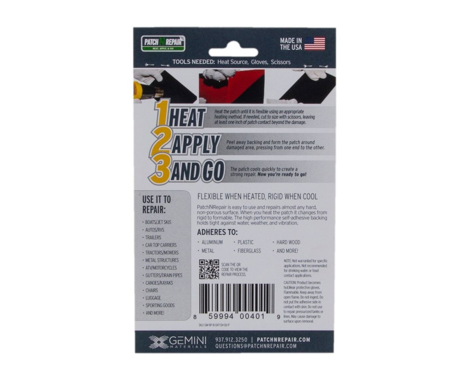 - It's easy to use. Clean the surface with alcohol, cut the patch to size, heat it until pliable, remove the paper backing and apply the patch. No muss, no fuss.