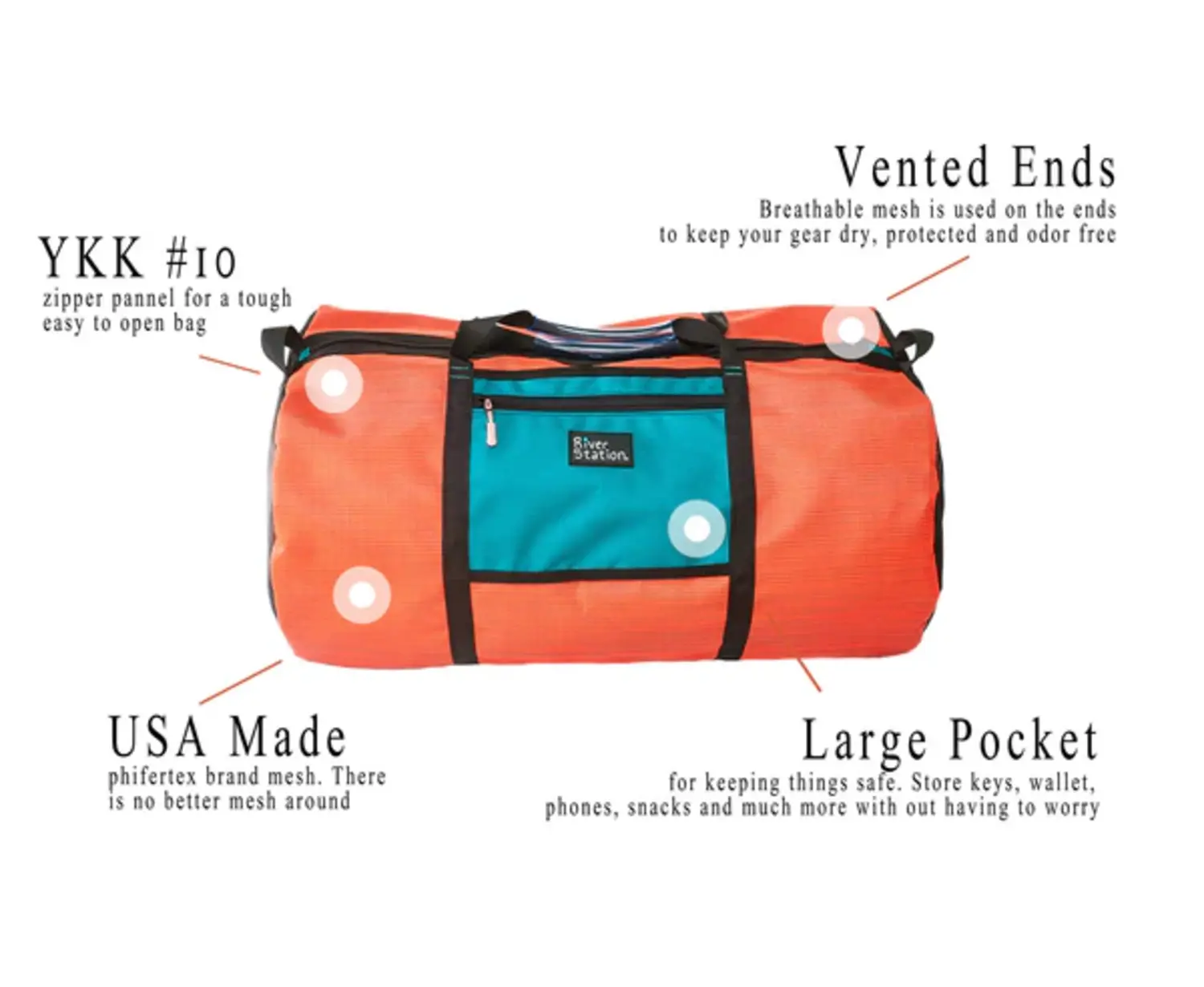 River Station mesh gear bags are all equipped with 2 large stainless steel D-Rings so that it can be clipped or strapped to pretty much anything. Along with D-Rings the mesh bag also features tabs to connect a shoulder strap if you'd like. This is the perfect gear duffle bag for anyone serious about whitewater.