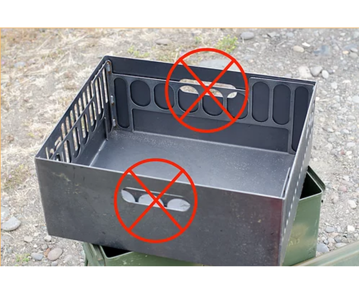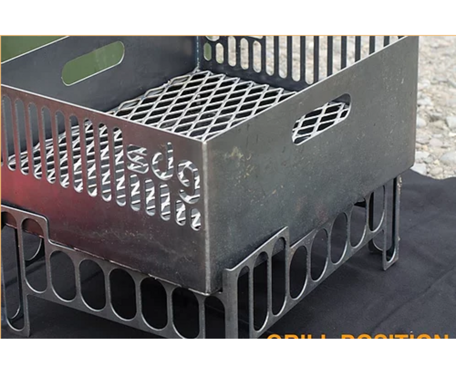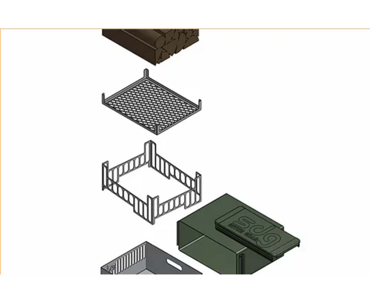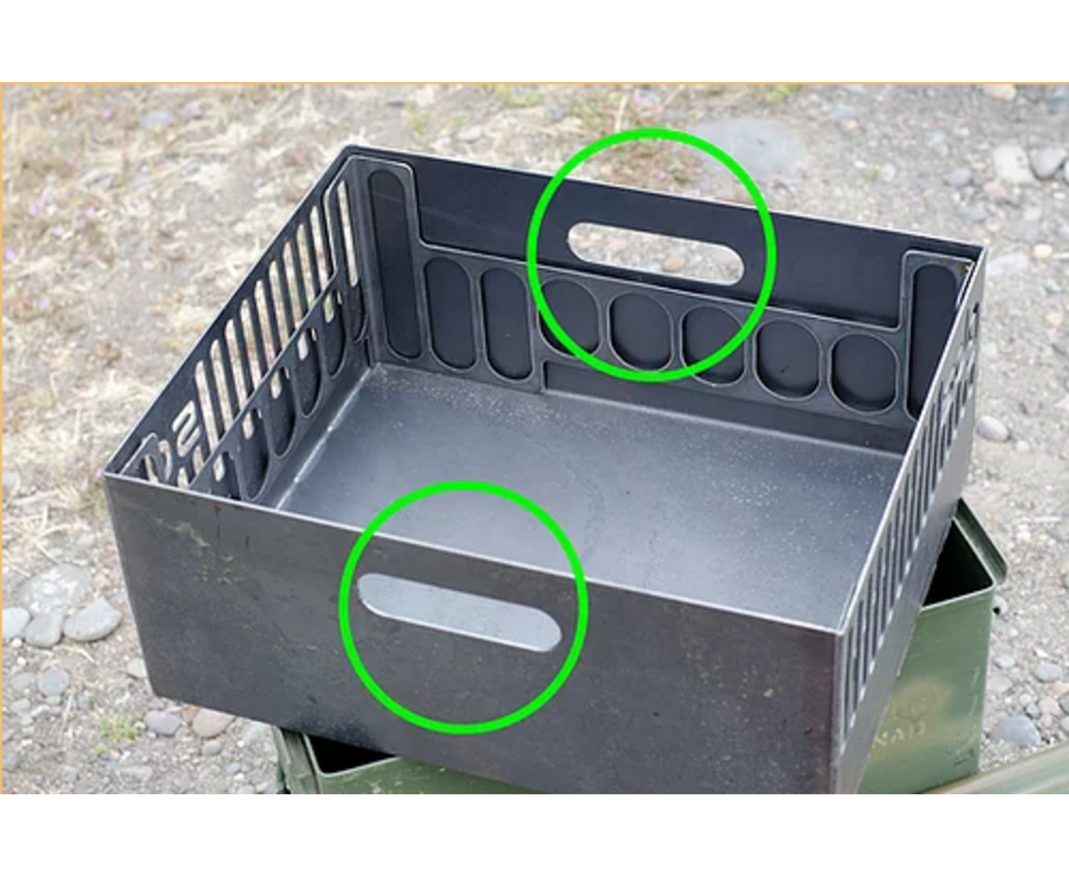 Transport wood, brickettes, kindling, etc. along with the complete collapsed pan inside the rocket box. After your first fire has cooled, just collapse the kit and slide everything back into the rocket box; no separate ash can needed. Before starting your second fire, just dump the old ash into your rocket box and you are set.