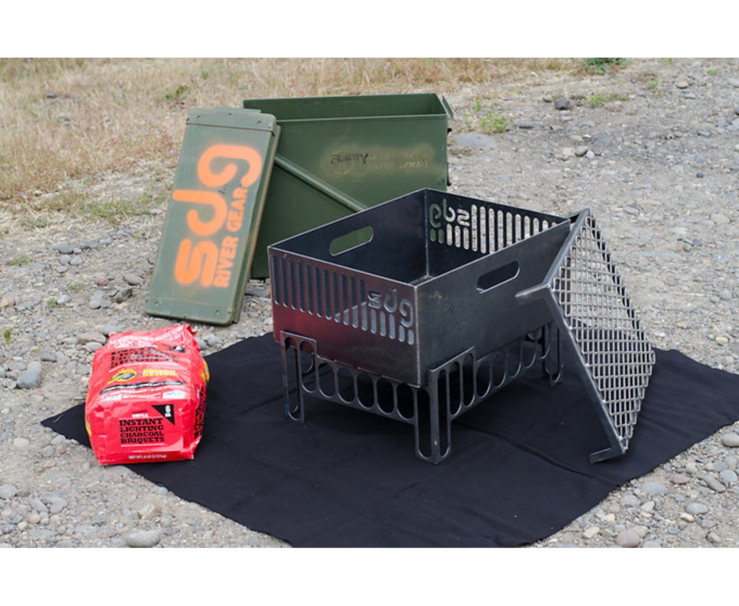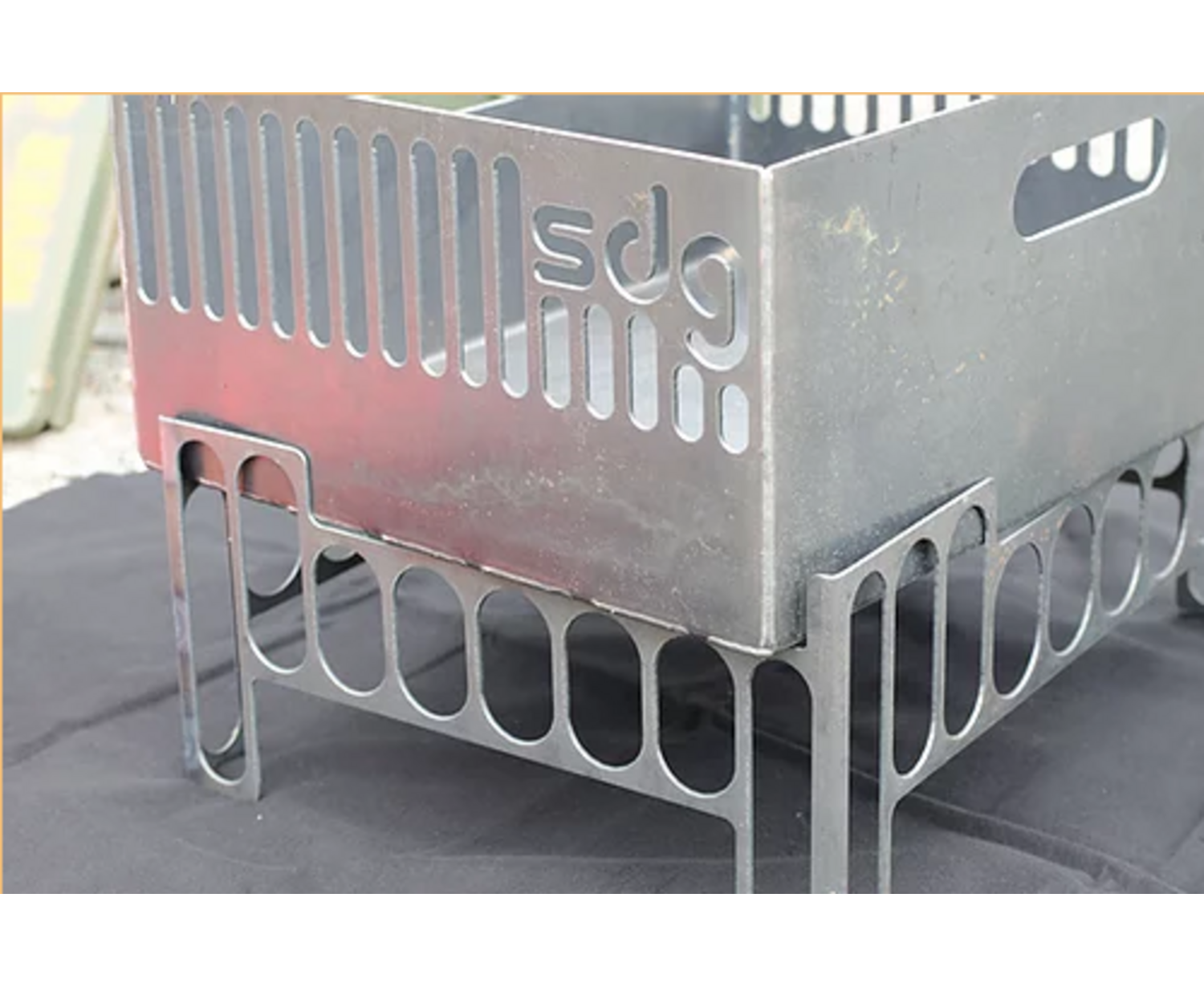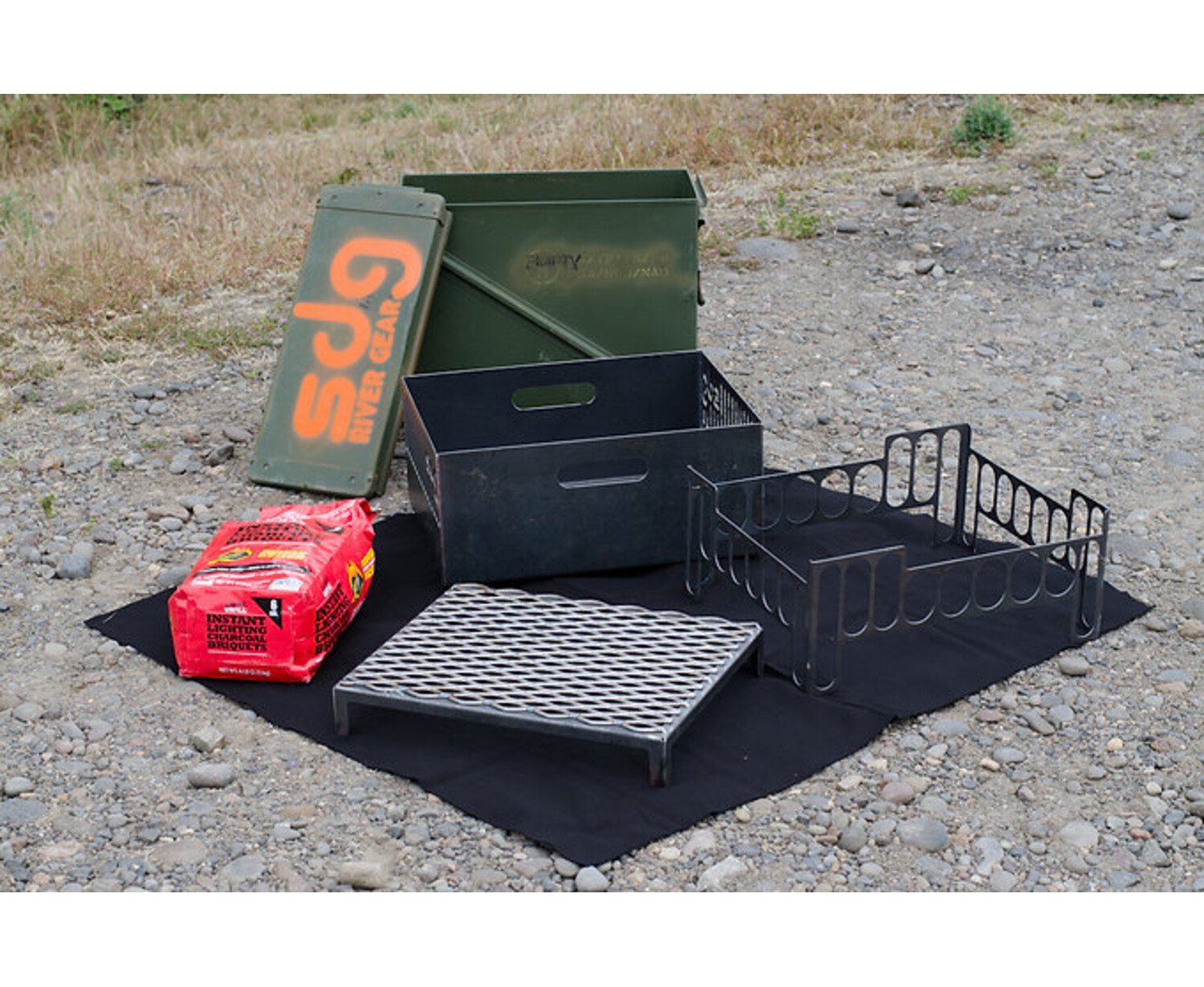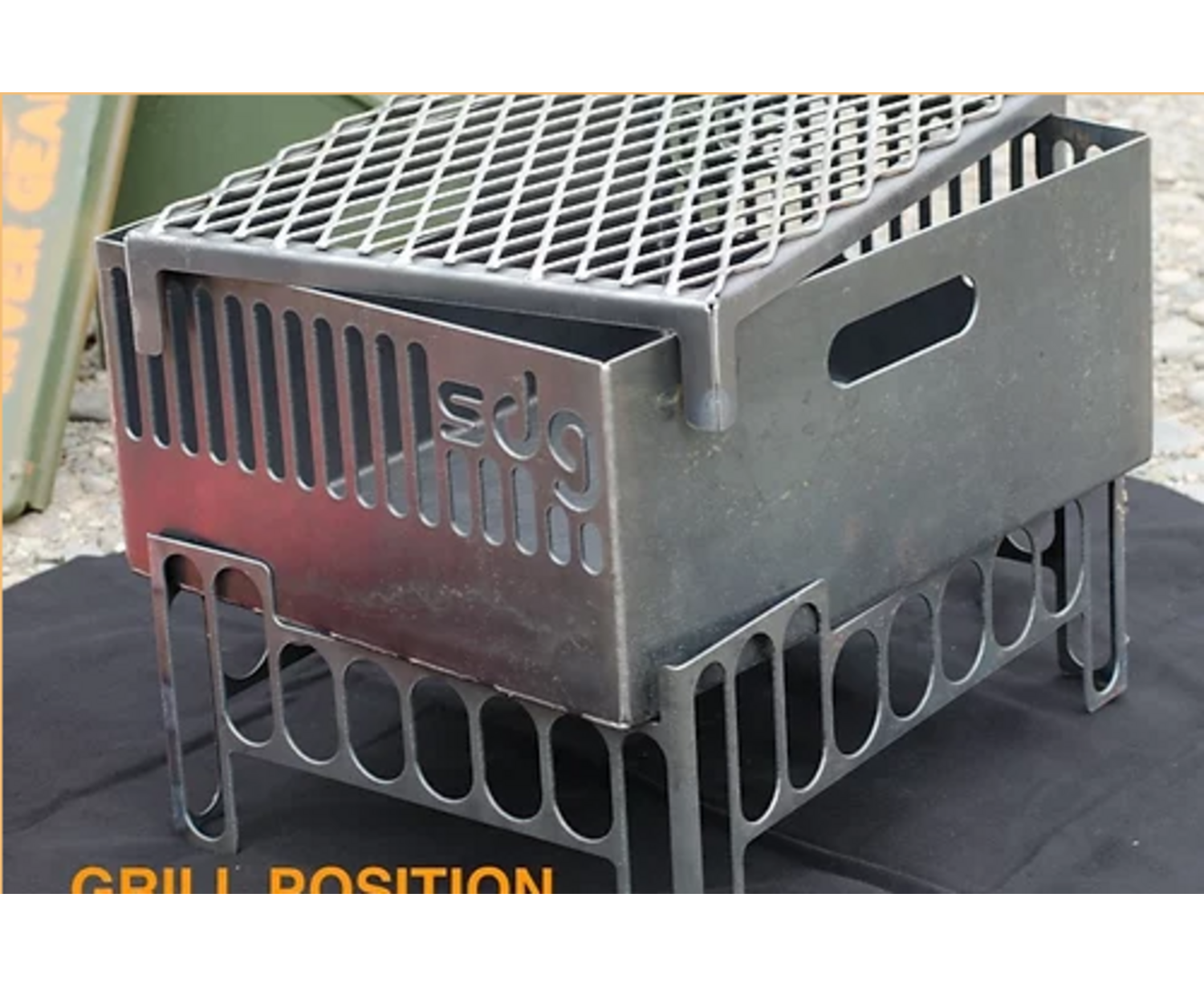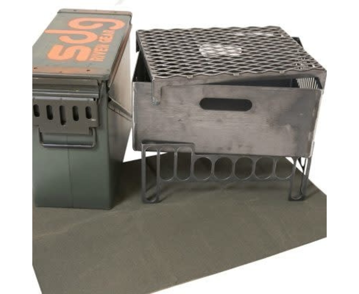 Transport wood, brickettes, kindling, etc. along with the complete collapsed pan inside the rocket box. After your first fire has cooled, just collapse the kit and slide everything back into the rocket box; no separate ash can needed. Before starting your second fire, just dump the old ash into your rocket box and you are set.