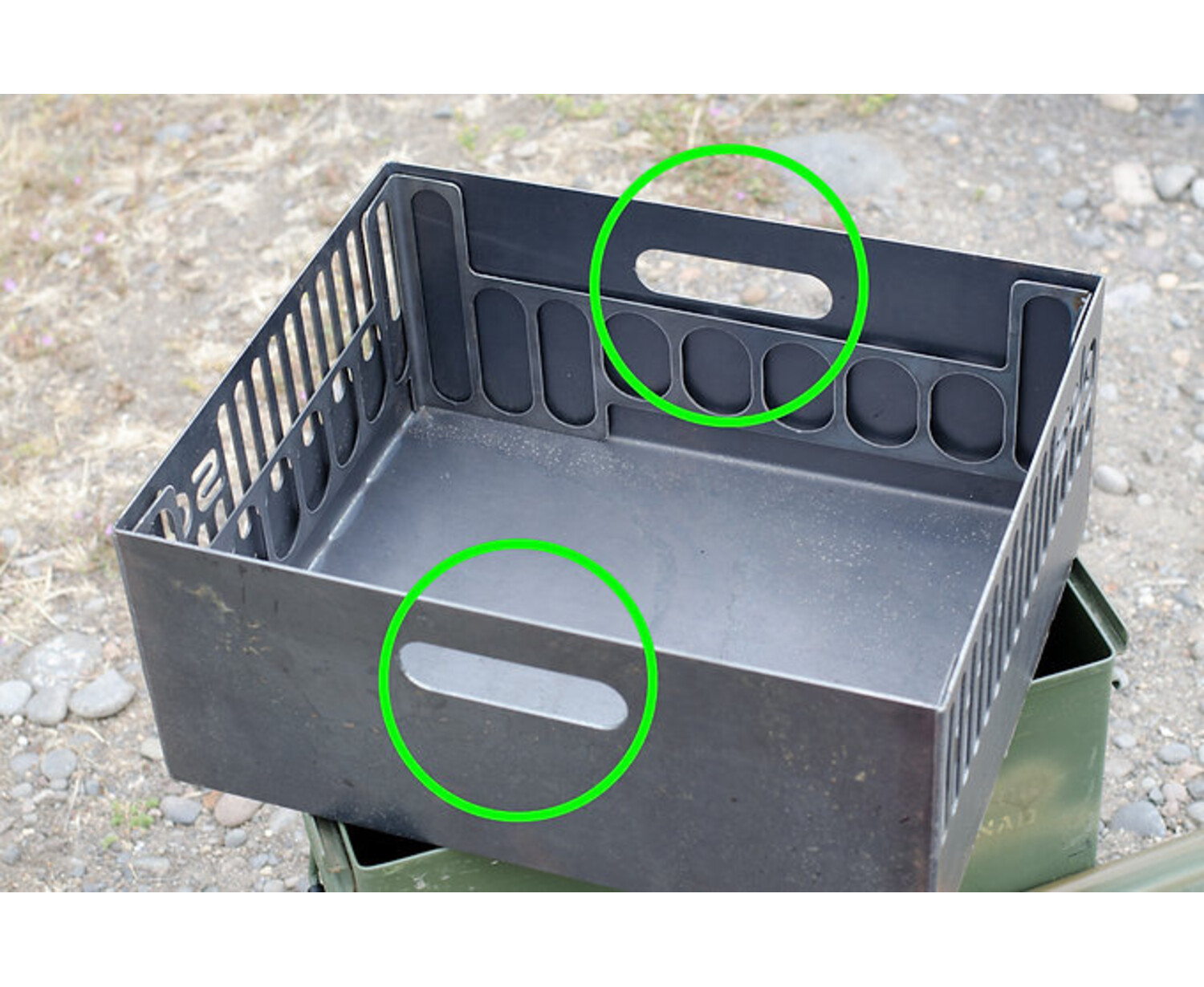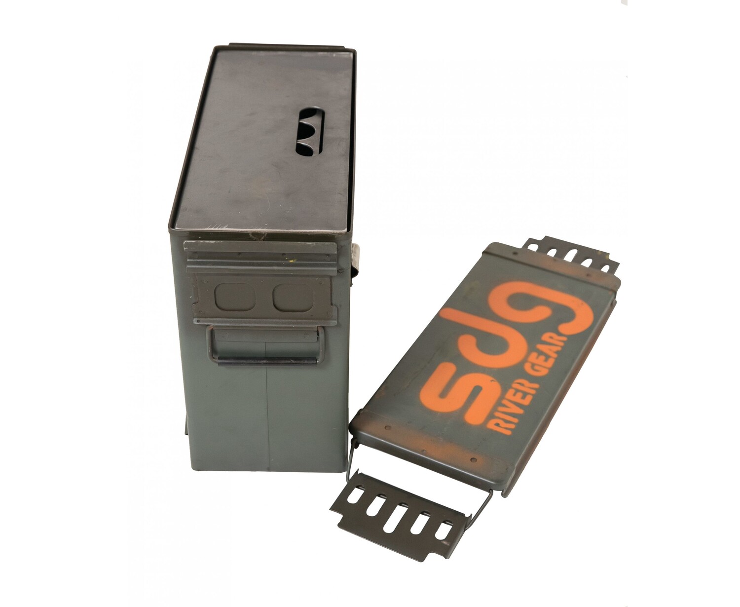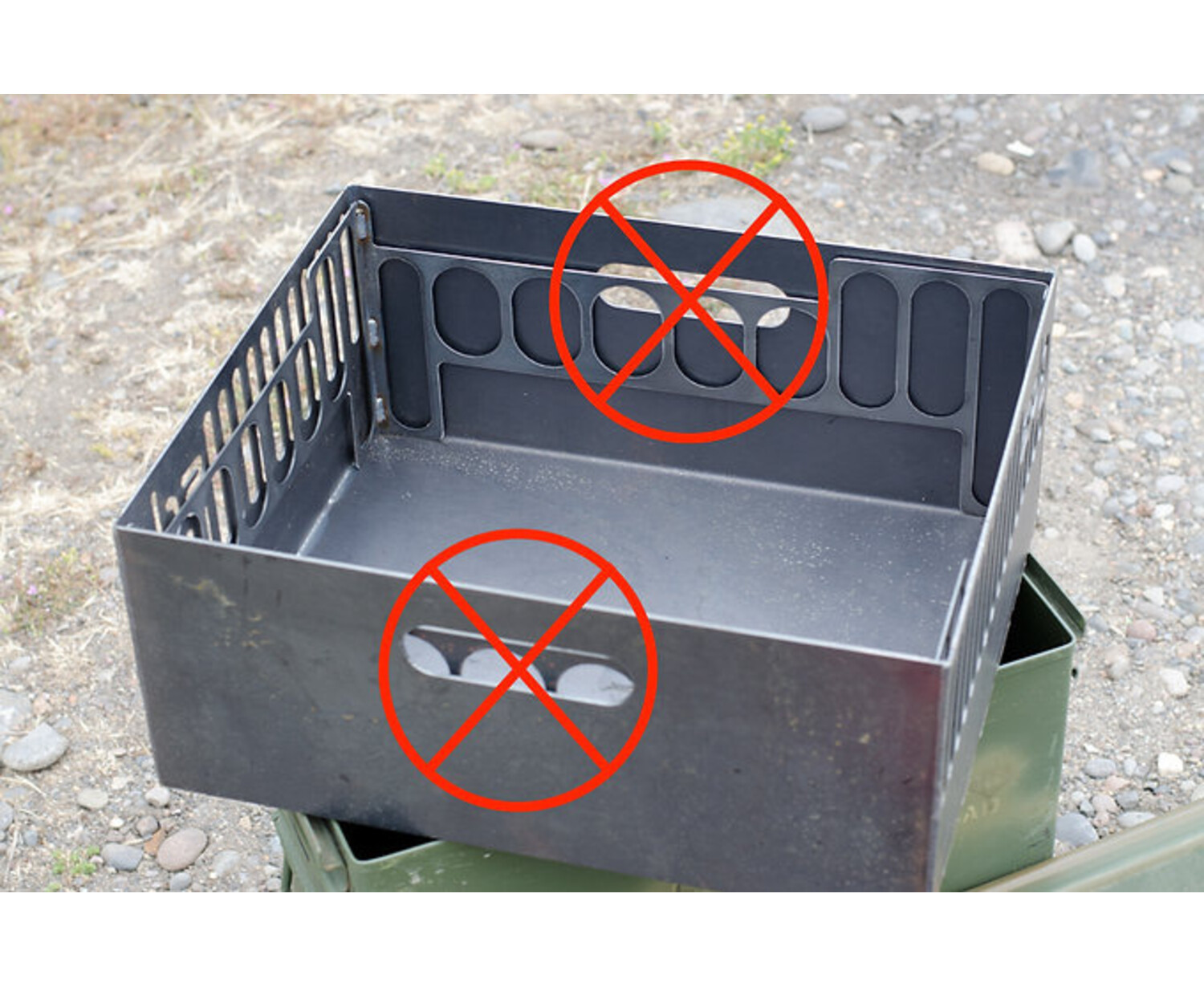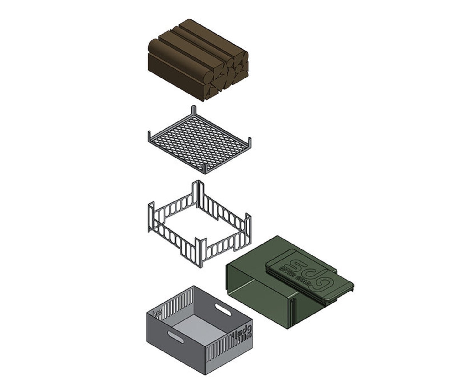 Transport wood, brickettes, kindling, etc. along with the complete collapsed pan inside the rocket box. After your first fire has cooled, just collapse the kit and slide everything back into the rocket box; no separate ash can needed. Before starting your second fire, just dump the old ash into your rocket box and you are set.