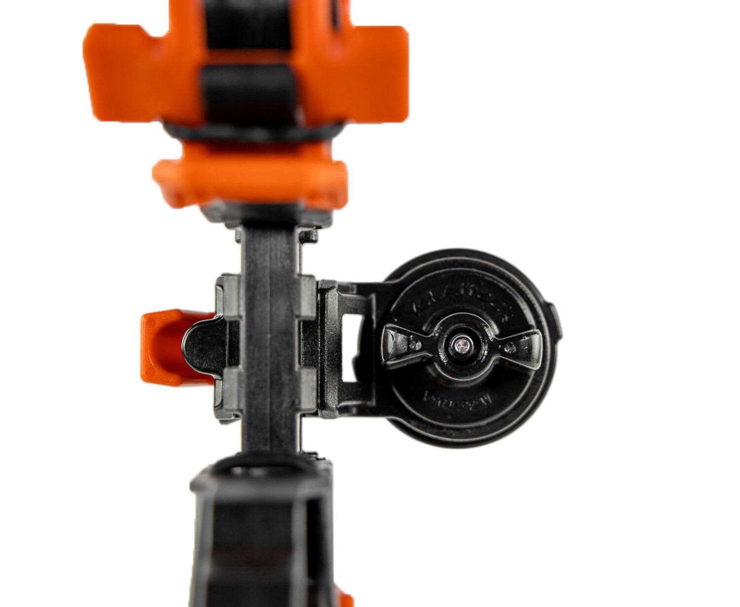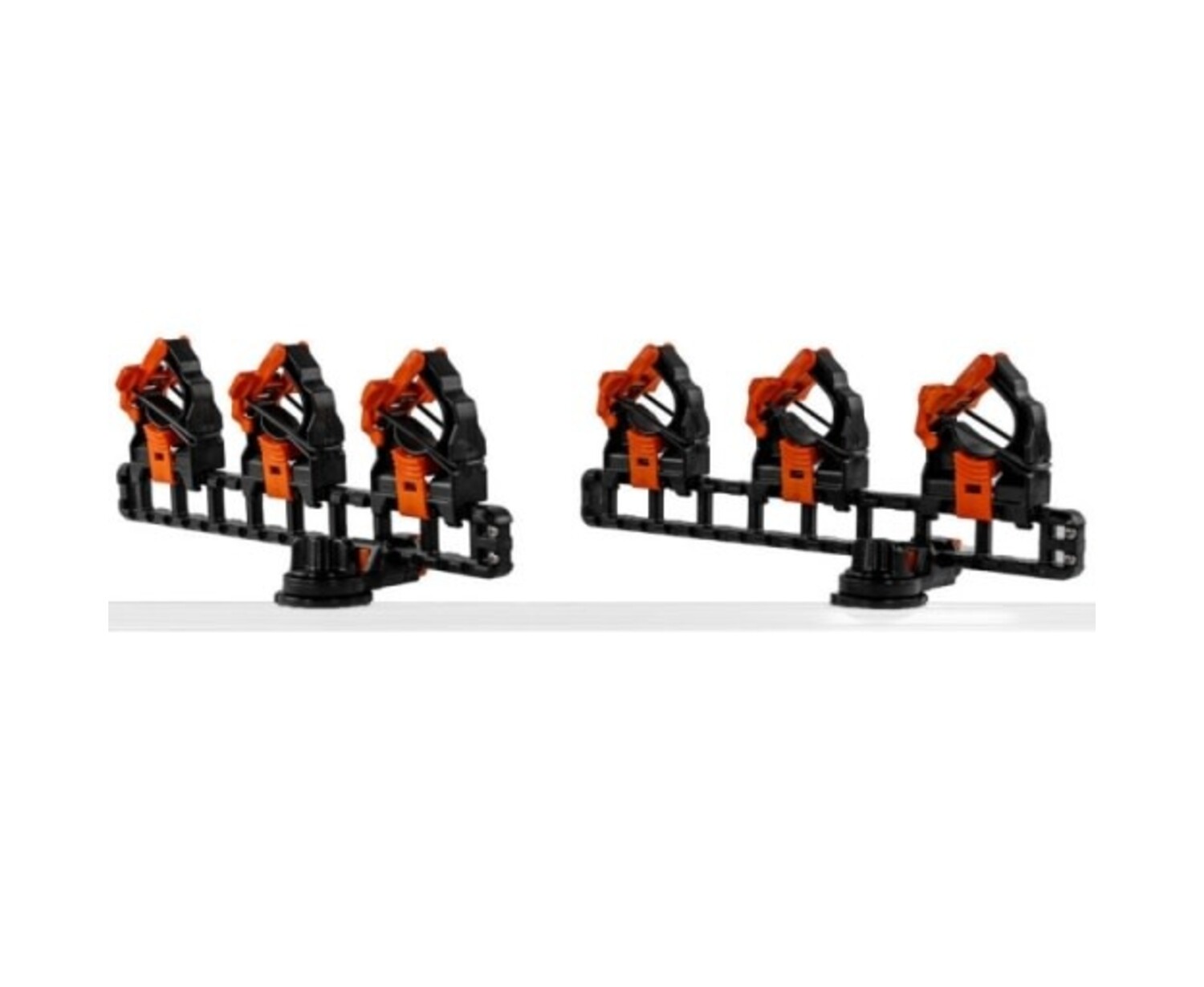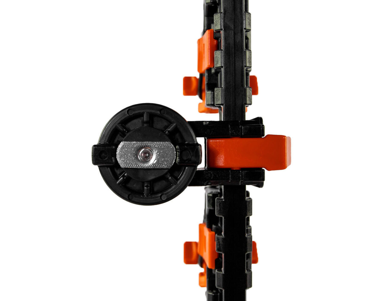 The ClickTrac Rail features a series of teeth on the top and bottom of the rail which give you the base to attach and adjust. Attach the ClickTrac Rail to the track adapter by depressing the orange button on the track mount and sliding the bottom of the ClickTrac Rail through the clamp. Once you remove pressure from the mount button, the rail will lock into place. Use this same process to adjust the overhang of the rail to achieve the desired positioning. The top half of the SideStage will be the same for all models and will come with three FlipGrips on each ClickTrac Rail. The FlipGrip slides along the top of the rail the same as the rail rides in your track mounted clamp. By depressing the orange FlipGrip release button, the cradle is free to slide up and down the ClickTrac Rail.