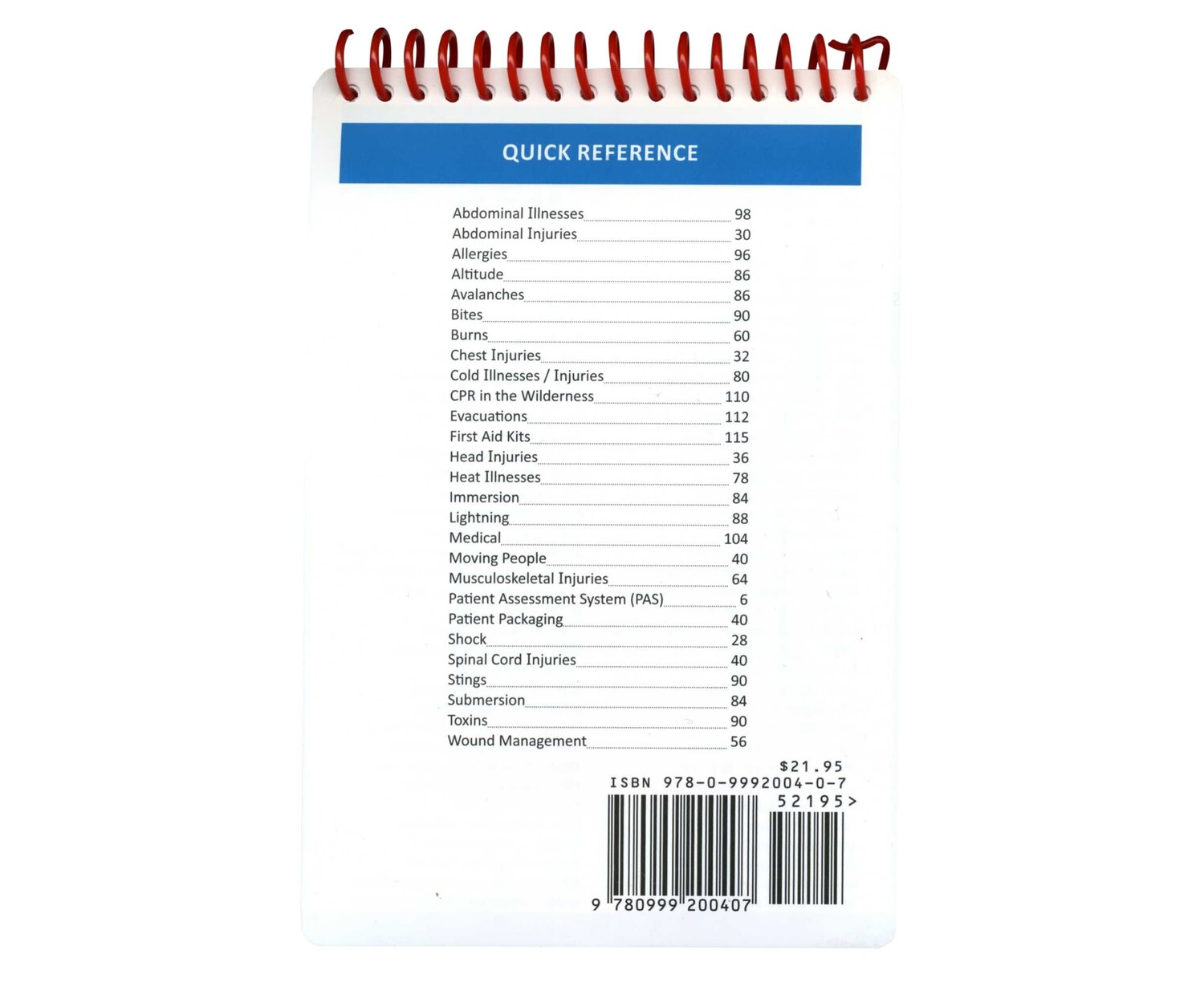 - Color-coded sections cover the patient assessment system, basics on evacuation guidelines, building first-aid kits, recognizing problems/injuries by their signs and symptoms, anticipating problems, and possible treatments.