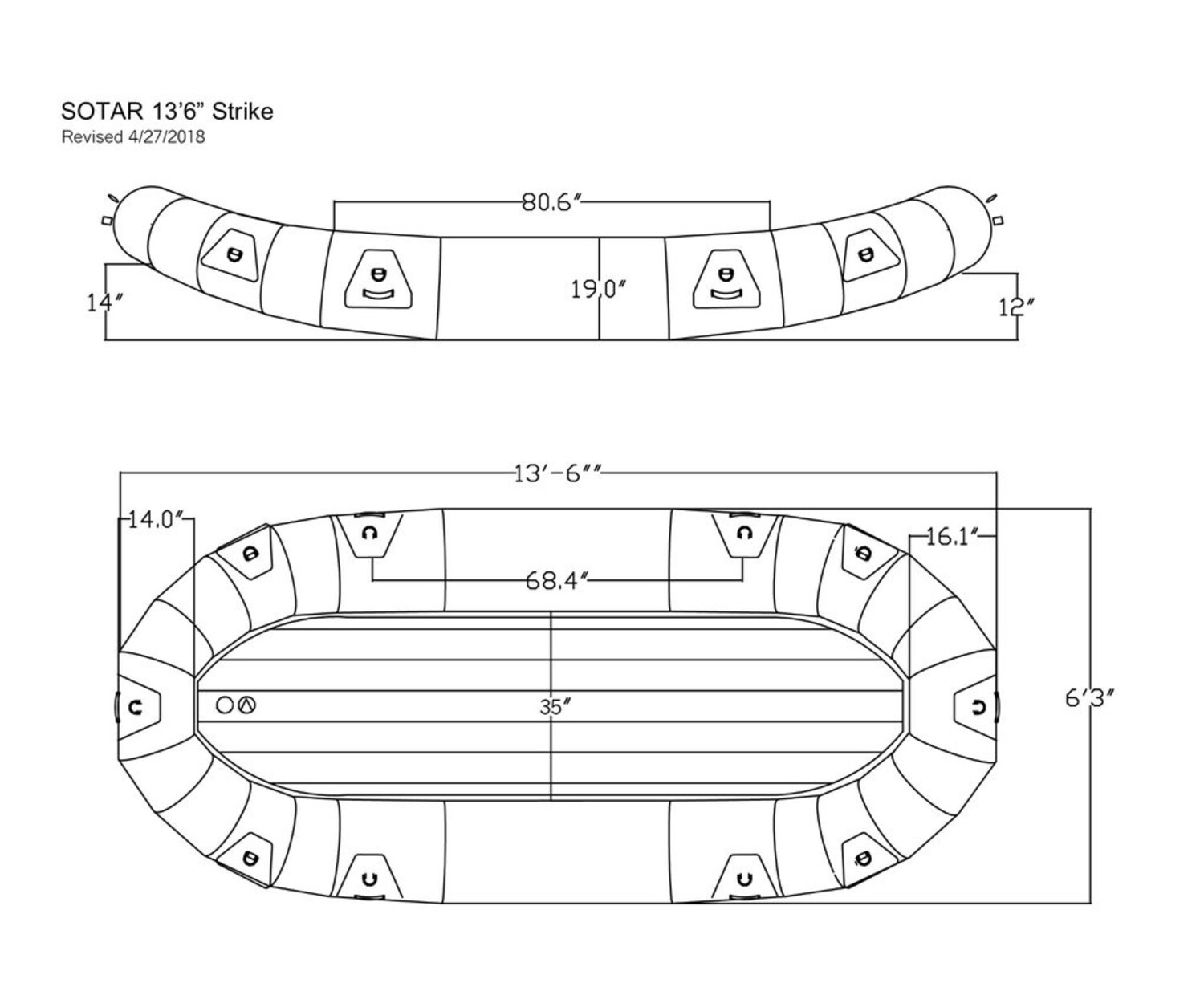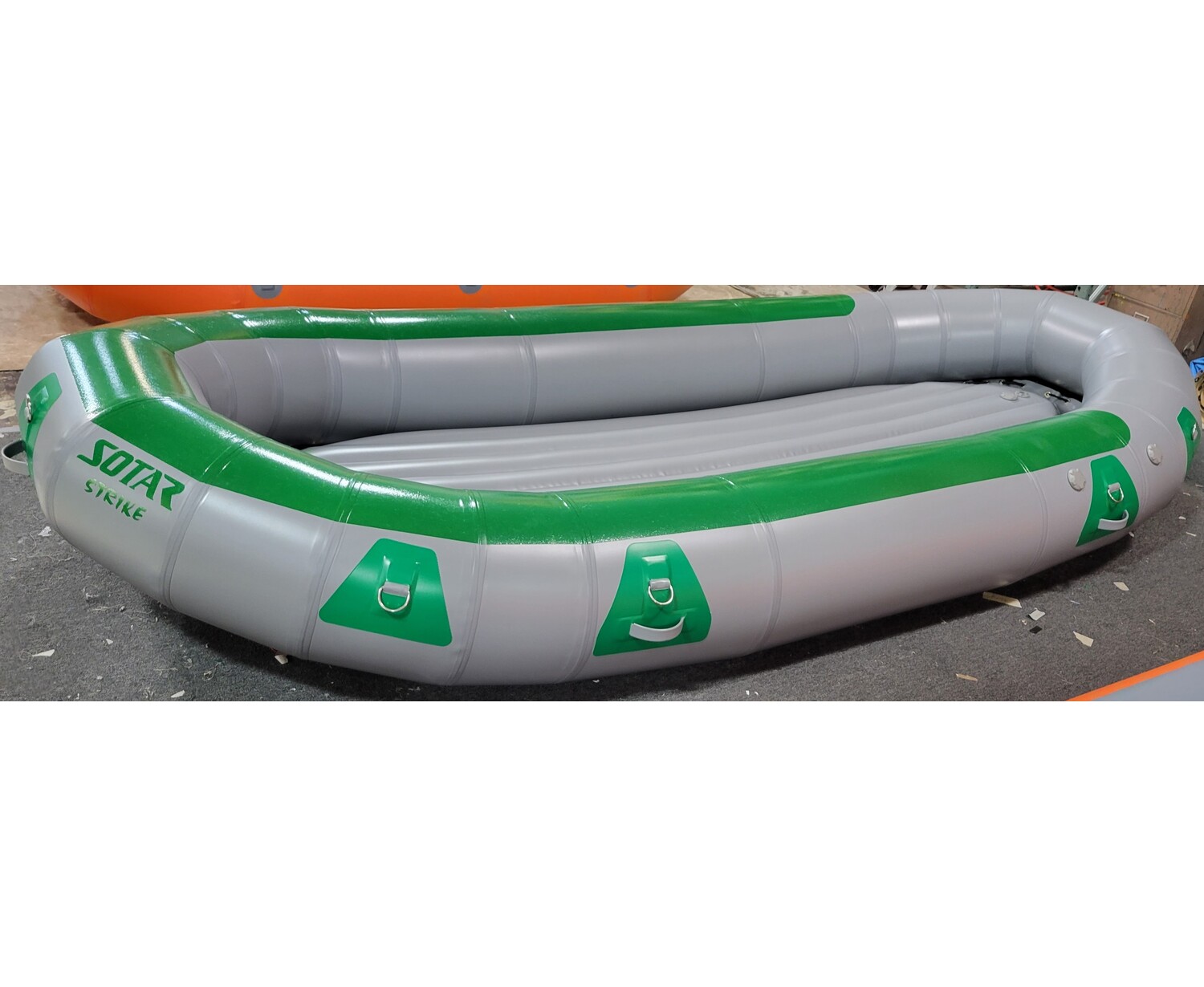 The Sotar Strike is our ultimate fishing boat we have been custom building for John Herzer with Blackfoot River Outfitters since 1984. It has evolved over the years from our SS model raft which was designed with the fisherman in mind. Strikes come standard with four air chambers in the main outside tube, a welded I beam floor, standard 10 outside d-rings and 6 carry handles, patch kit and boat bag. Top chafe, thwarts, extra D-rings and other options are available on request. All SOTAR Inflatables are designed and manufactured one at a time. No other Inflatables are made with such personal care and attention.