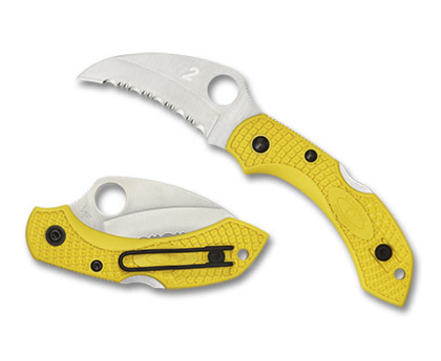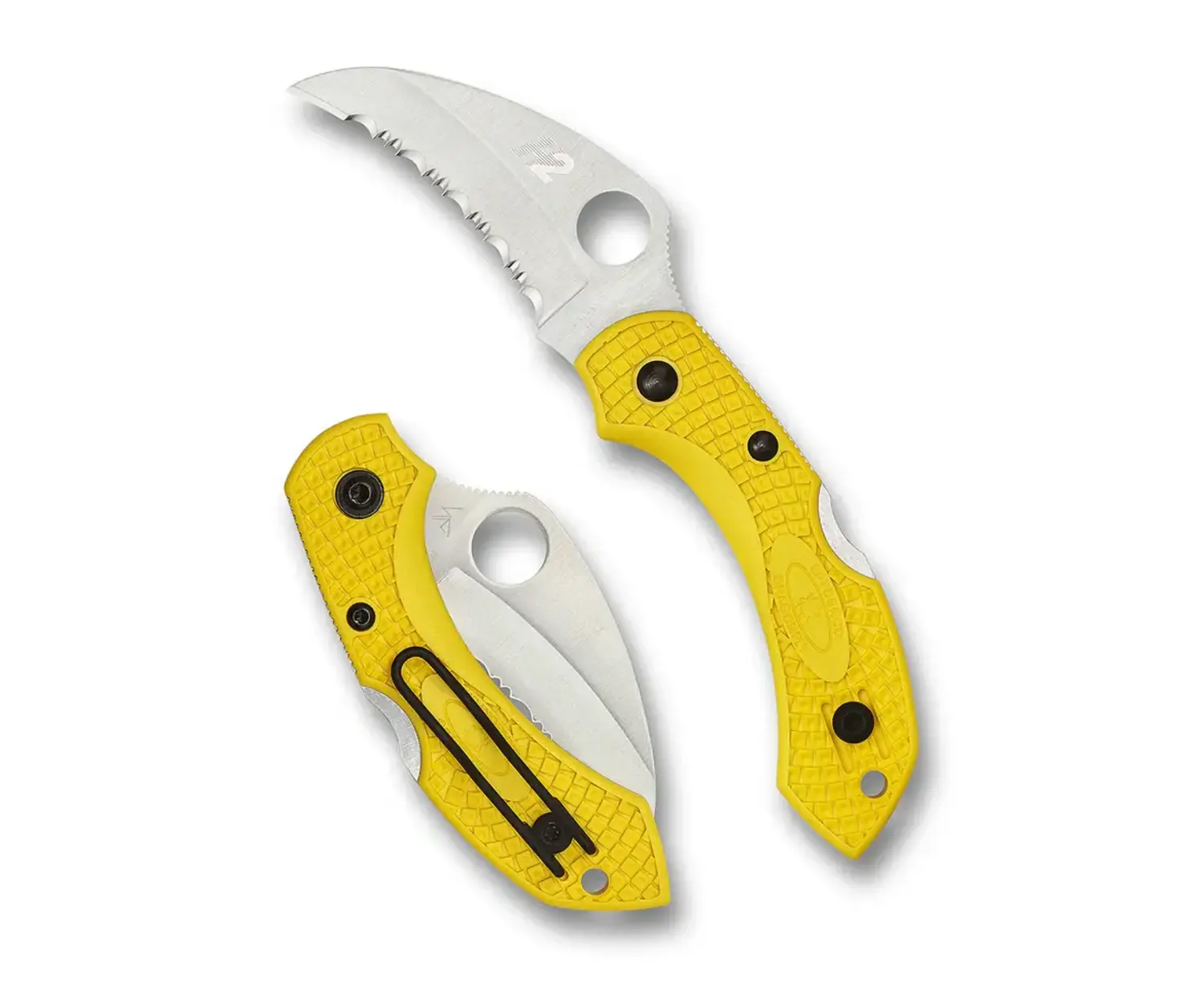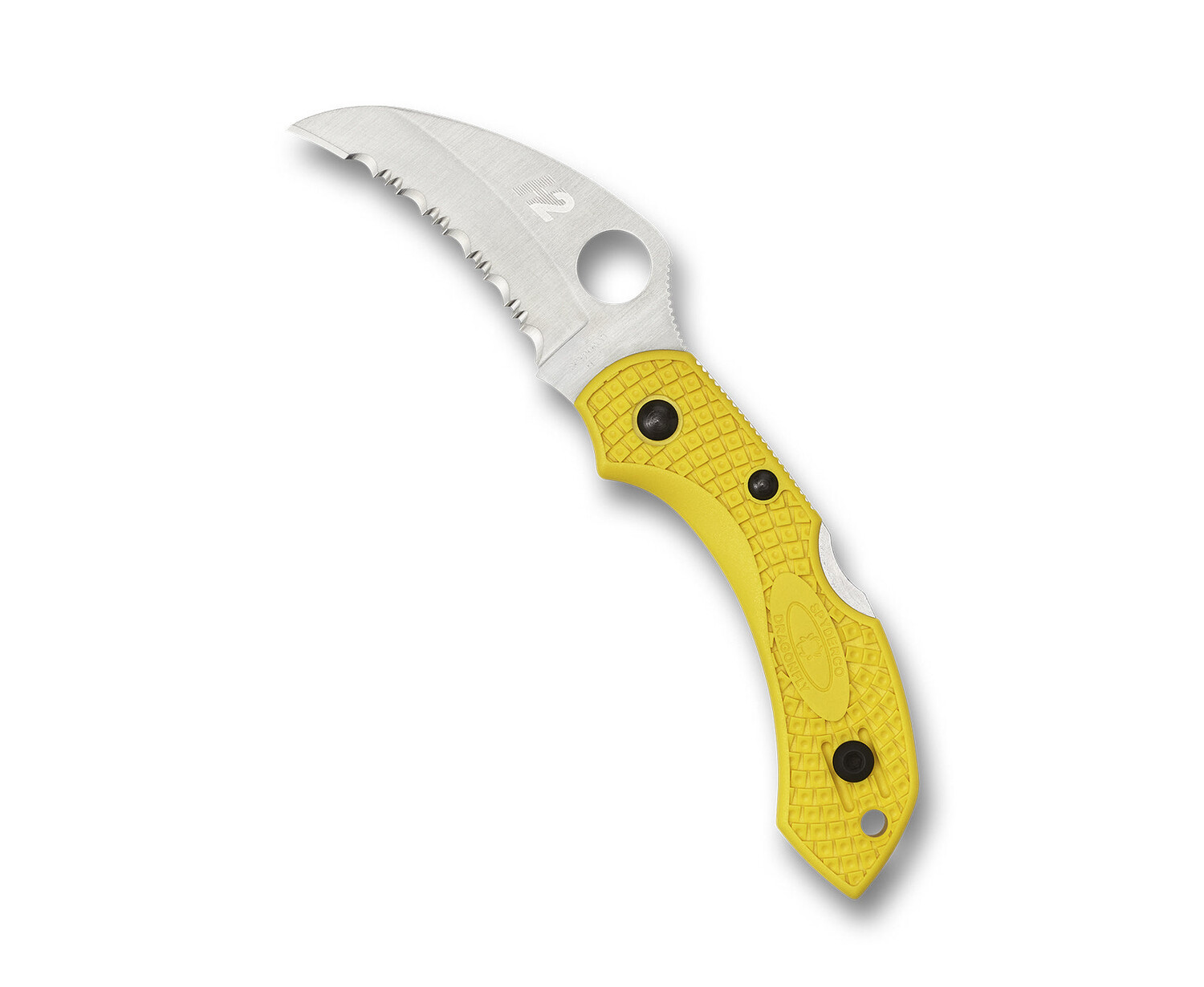 CloseThe Dragonfly™ is a remarkably refined folding knife design that balances compact size with full-service cutting performance. Its unique handle shape and textured index-finger choil comfortably accommodate all hand sizes for a secure, non-slip, four-finger grip. The Dragonfly 2 Salt® takes this formidable package a step further with a hollow-ground H-2 steel blade, a high-visibility yellow fiberglass-reinforced-nylon (FRN) handle, and specially coated handle hardware. The result is a pocket-friendly, ultra-corrosion-resistant cutting tool that is perfect for use in and around the water. This extremely capable knife is available in two versions and a choice of edge configurations. One features a leaf-shaped blade and is available in both PlainEdge™ or fully serrated SpyderEdge™ configurations. The other showcases a hawkbill-style blade with a SpyderEdge cutting edge. To ensure convenient carry and immediate access, all versions of the Dragonfly 2 Salt include a deep-pocket wire clip that is reversible for left or right-side tip-up carry.