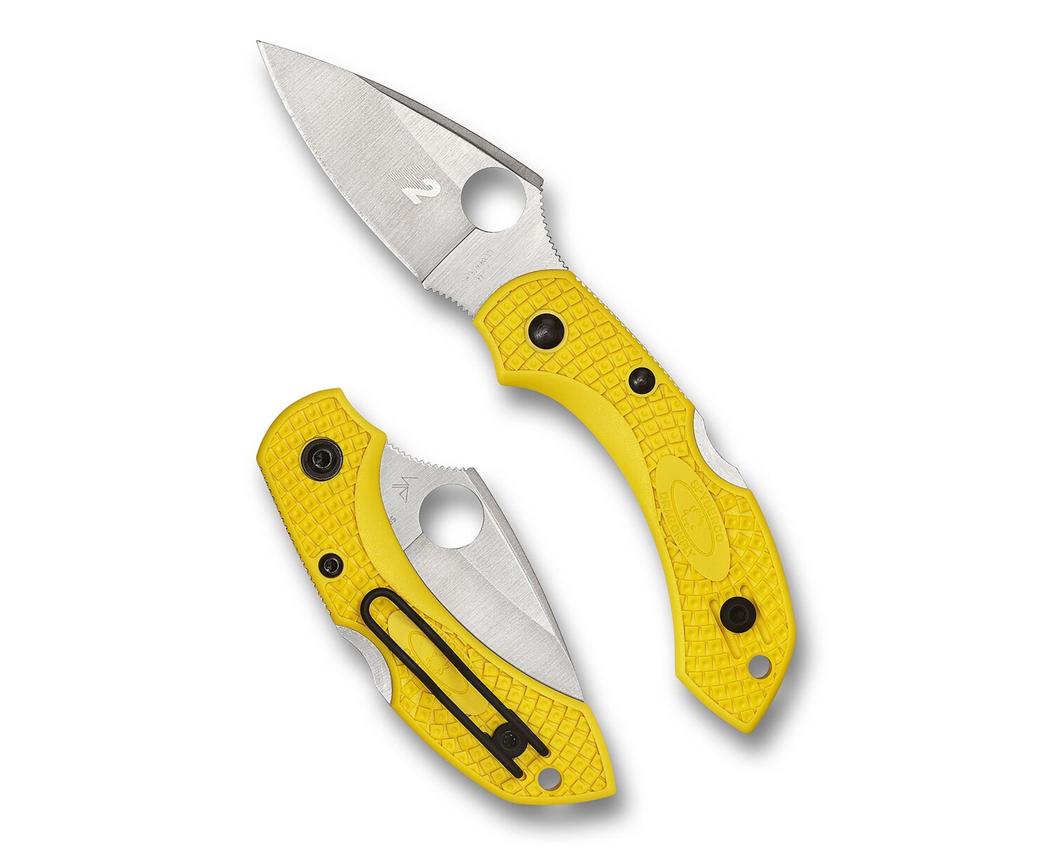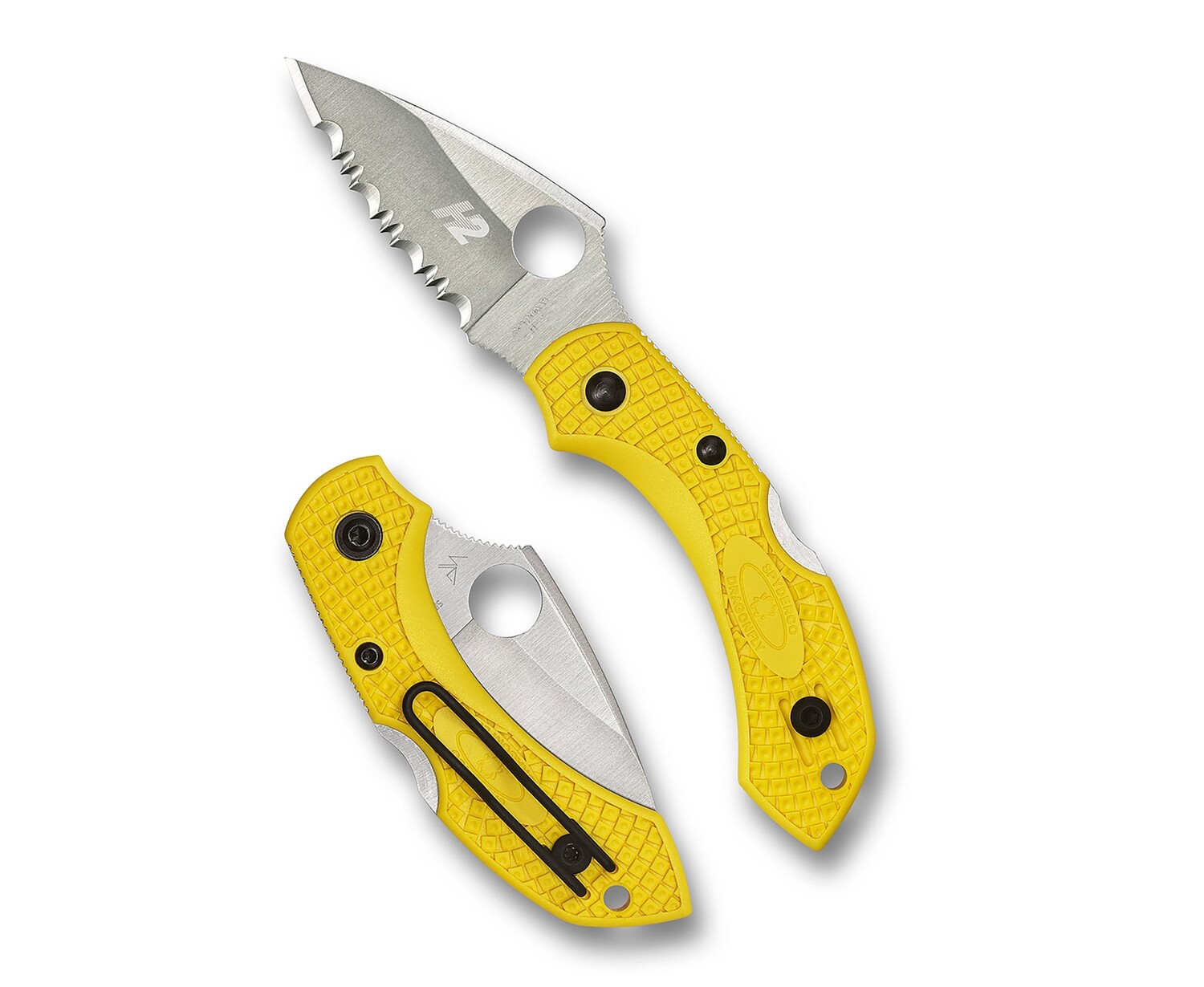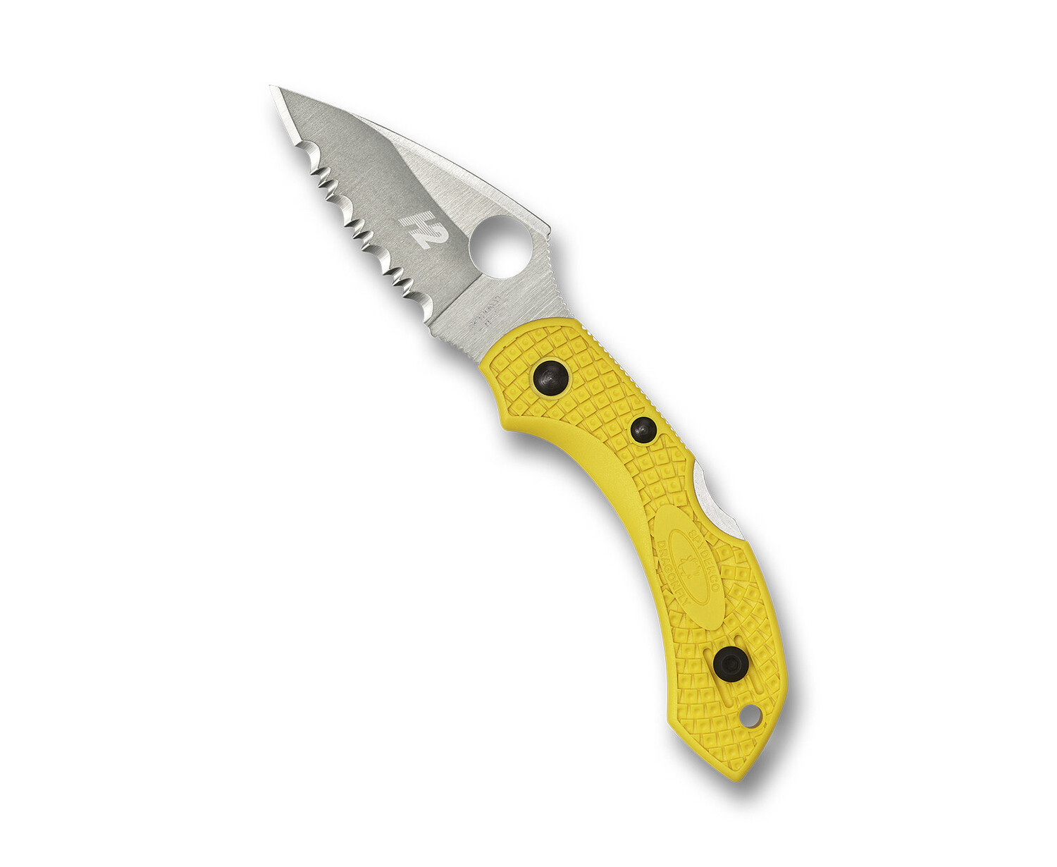 CloseThe Dragonfly™ is a remarkably refined folding knife design that balances compact size with full-service cutting performance. Its unique handle shape and textured index-finger choil comfortably accommodate all hand sizes for a secure, non-slip, four-finger grip. The Dragonfly 2 Salt® takes this formidable package a step further with a hollow-ground H-2 steel blade, a high-visibility yellow fiberglass-reinforced-nylon (FRN) handle, and specially coated handle hardware. The result is a pocket-friendly, ultra-corrosion-resistant cutting tool that is perfect for use in and around the water. This extremely capable knife is available in two versions and a choice of edge configurations. One features a leaf-shaped blade and is available in both PlainEdge™ or fully serrated SpyderEdge™ configurations. The other showcases a hawkbill-style blade with a SpyderEdge cutting edge. To ensure convenient carry and immediate access, all versions of the Dragonfly 2 Salt include a deep-pocket wire clip that is reversible for left or right-side tip-up carry.