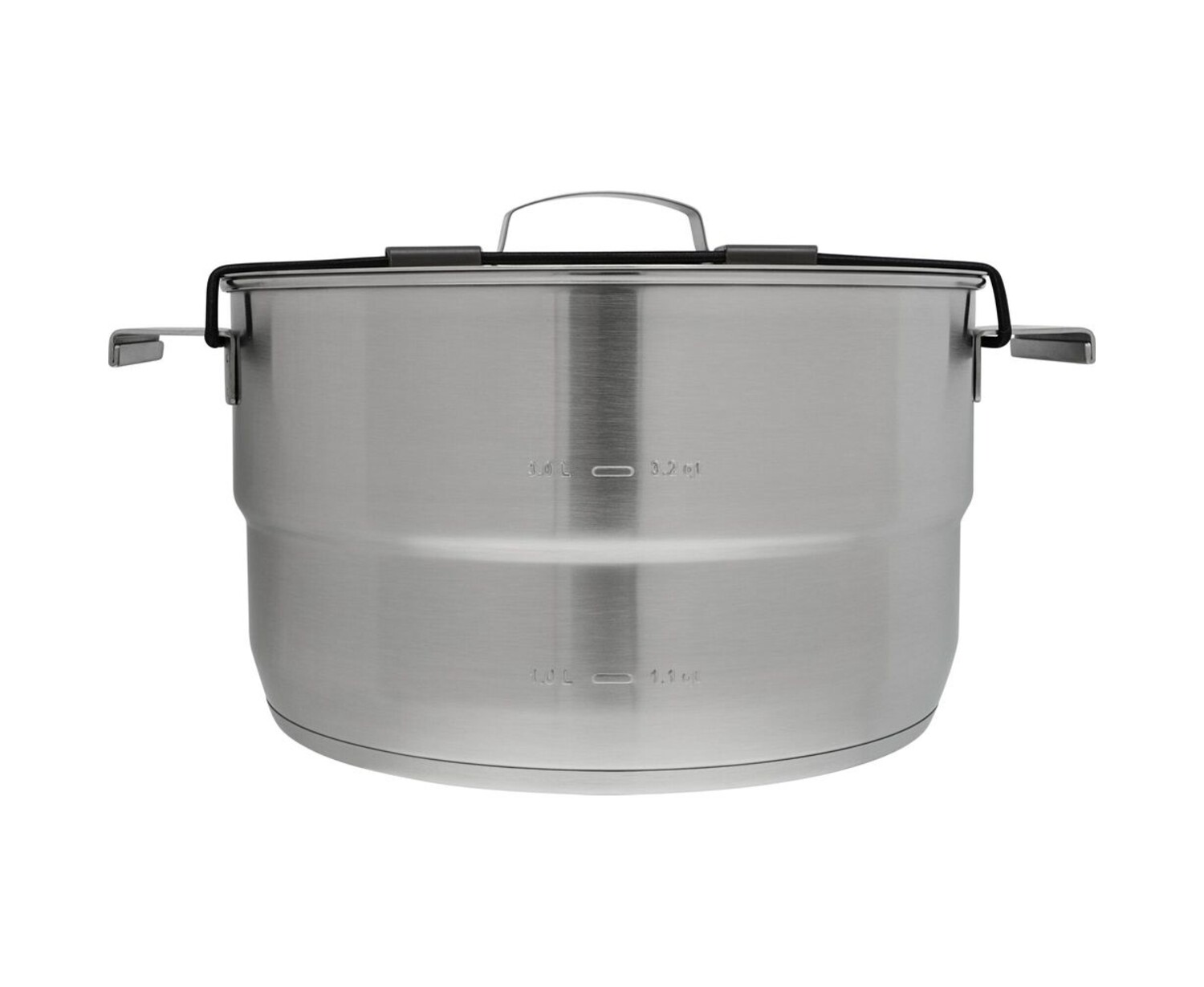 - All components nest easily inside the 4.75-quart stock pot and secure with a locking bungee for transport.