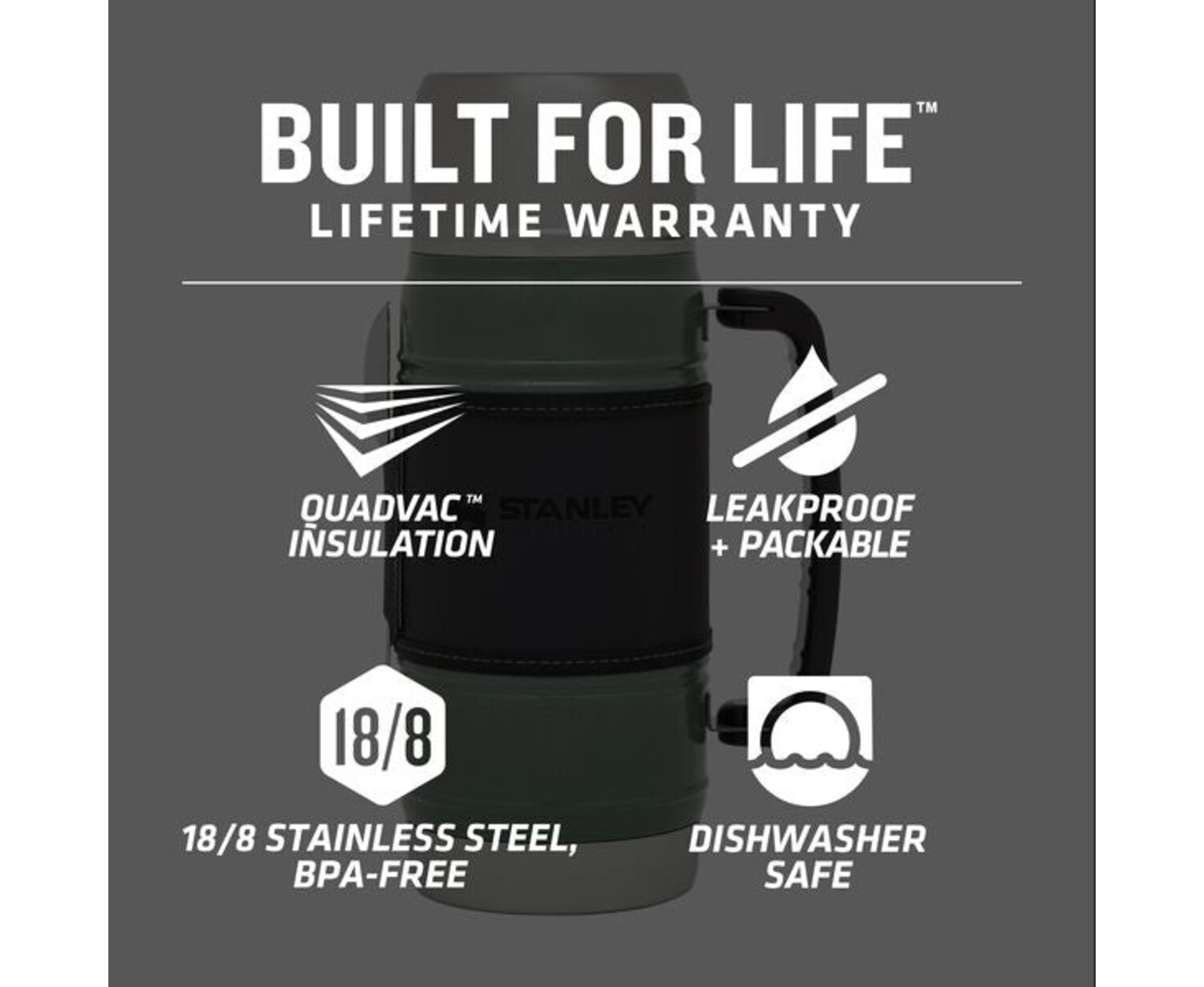 Hiking-ready, fishing-ready, and road trip-ready, this Stanley-tough Food Jar will follow you anywhere. The innovative QuadVac™ insulation makes sure your hot dishes stay piping-hot and your cold dishes stay icy-cold. No leaks, no worries. Just serve yourself using the double-wall steel cup and dig in with the stainless-steel spork.