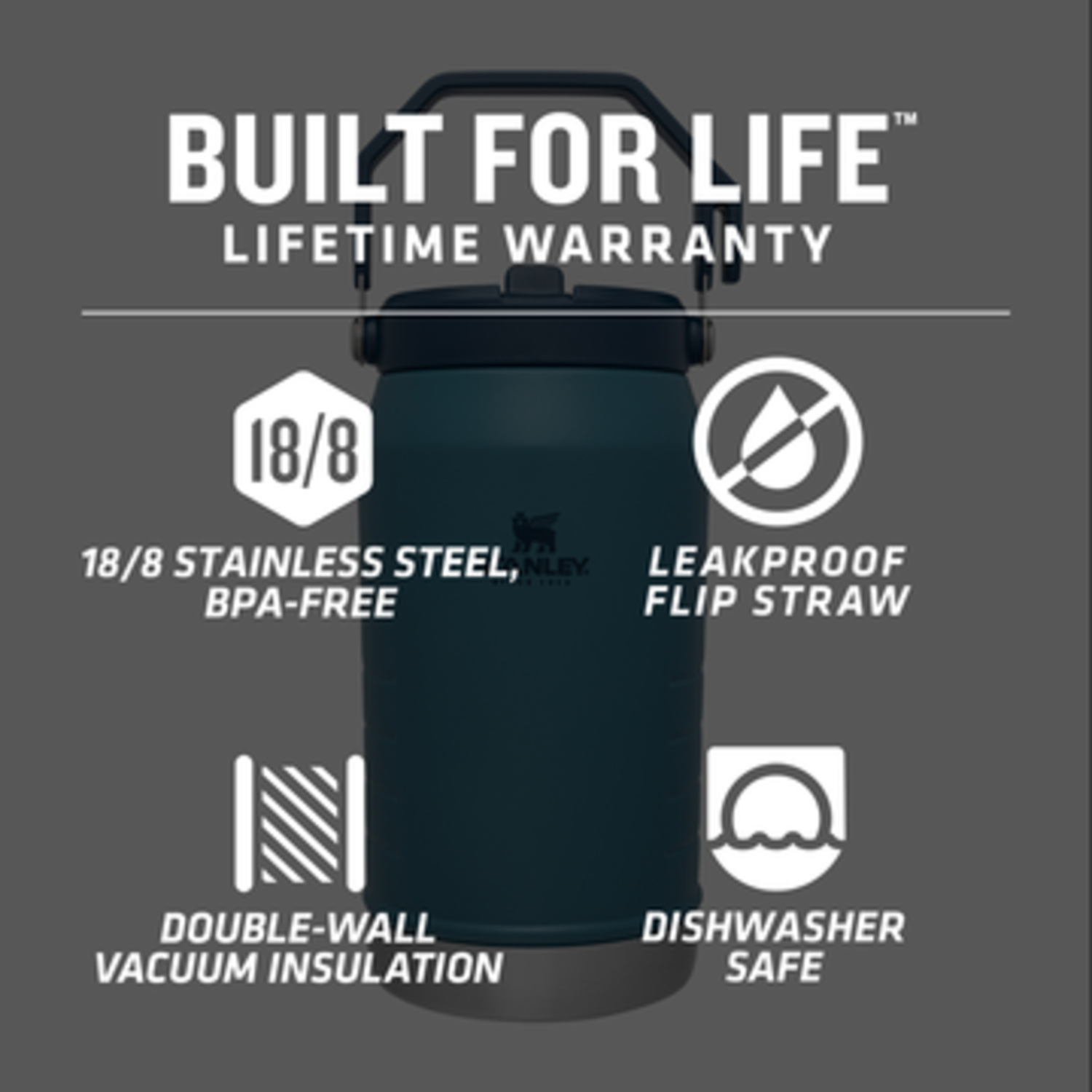This half-gallon jug is designed to be personal hydration gear for athletes, avid adventurers, or anyone who needs to stay hydrated throughout the day. Just flip it up to sip, then snap it shut to close. Your water always stays clean and fresh. Stanley’s double-wall vacuum insulation also keeps it icy cold for hours. Take it where you need to go—the rugged handle and built-in fence hook provide portability and convenience. The double-wall vacuum insulation keeps the cold in longer. Take it where you need to go—the rugged handle and built-in fence hook also provide portability and convenience.