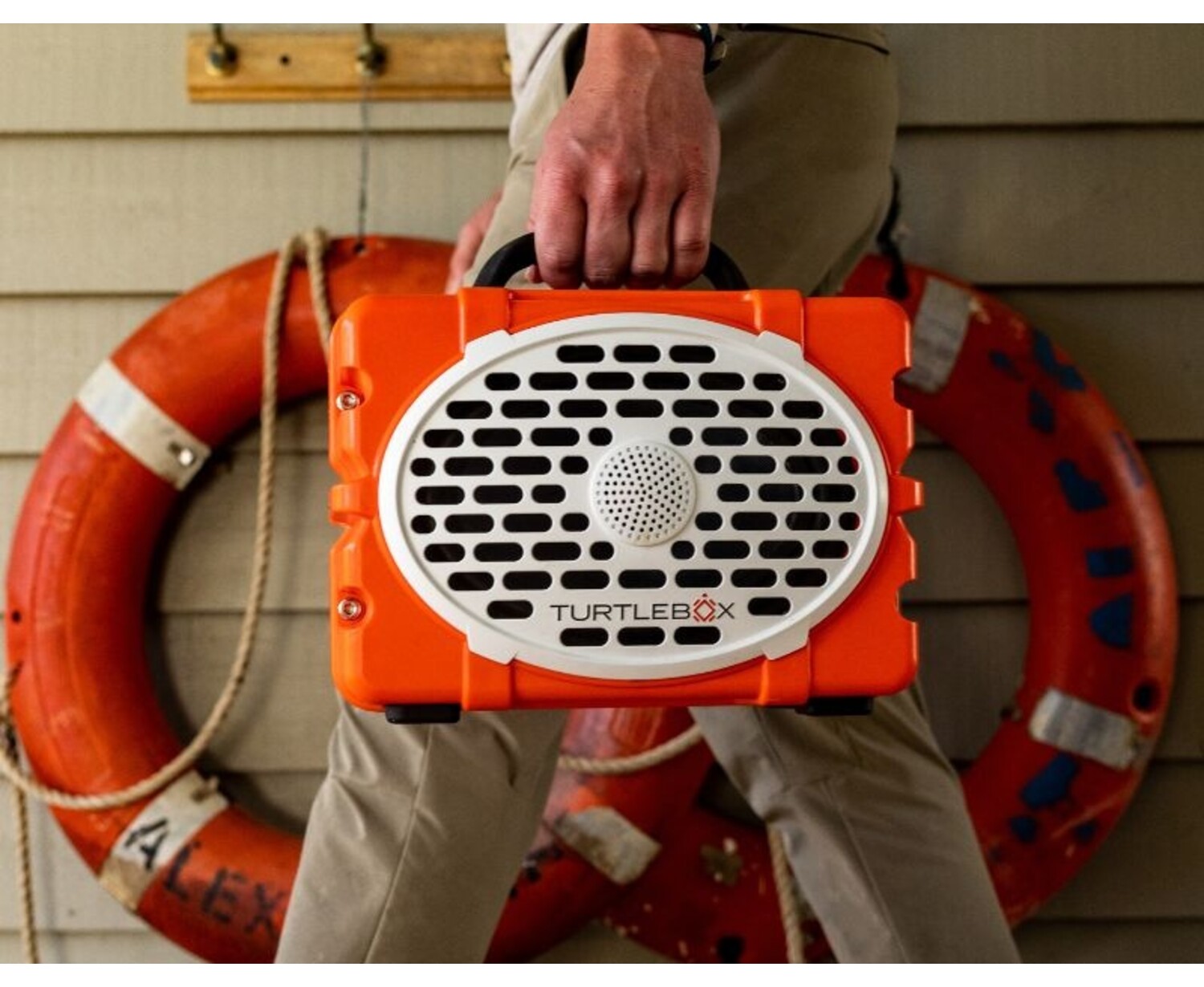 For its Big Sound, the Turtlebox is extremely portable, lightweight and compact—easily carried with one comfortable rubber handle. About the size of an old-school lunchbox and weighs about 10 lbs.