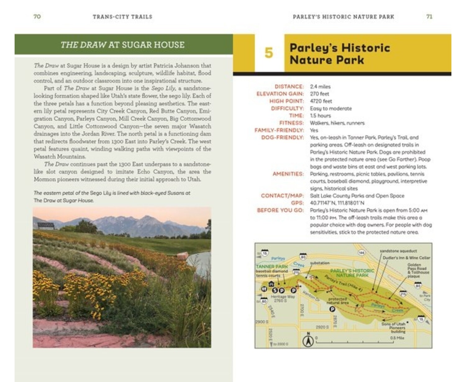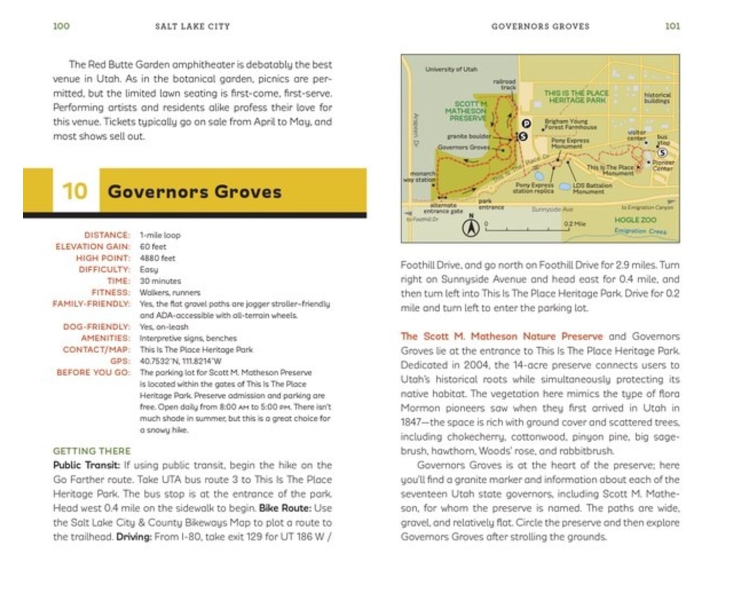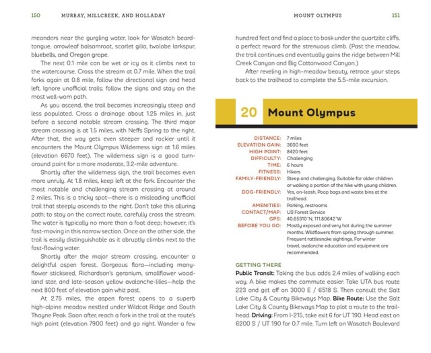 Urban Trails: Salt Lake City will get residents and visitors alike outside on more than 40 routes in the beautiful parks, canyons, and mountains in and around this fast-growing city. Whether readers are looking to walk, run, or hike, this full-color guide offers a wide range of options from short, easy jaunts to more challenging all-day hikes. From the network of preserves and parks close-in to the more rugged canyons and majestic Wasatch peaks just outside the city, readers will find a plethora of choices for enjoying all that the area has to offer.