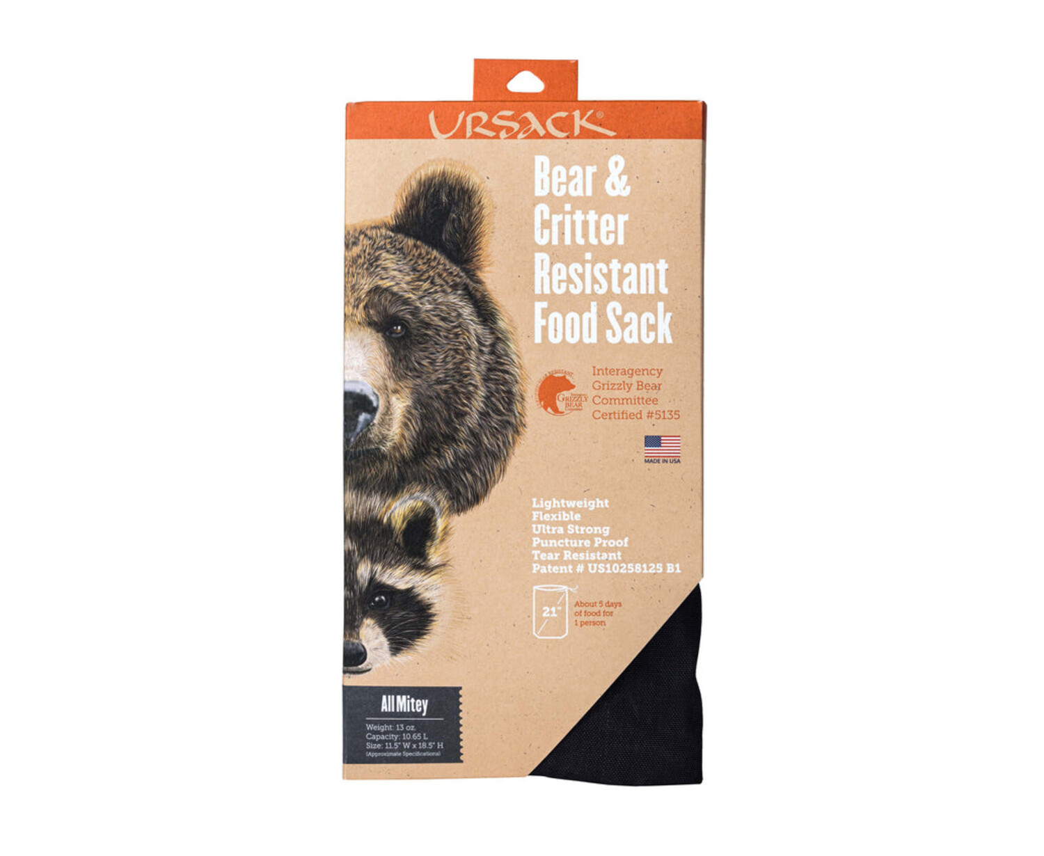 No need to choose between bear and critter protection. The Ursack AllMitey protects your food from all creatures great and small. While our standard Major and Major XL resist being torn by bears, it is prone to small (less than 1/4 inch) punctures/weave separations. The AllMitey is virtually puncture-proof. Not only will it keep out bears teeth and claws it will thwart mice, raccoon, squirrels, pine martens, and other sharp-toothed critters.